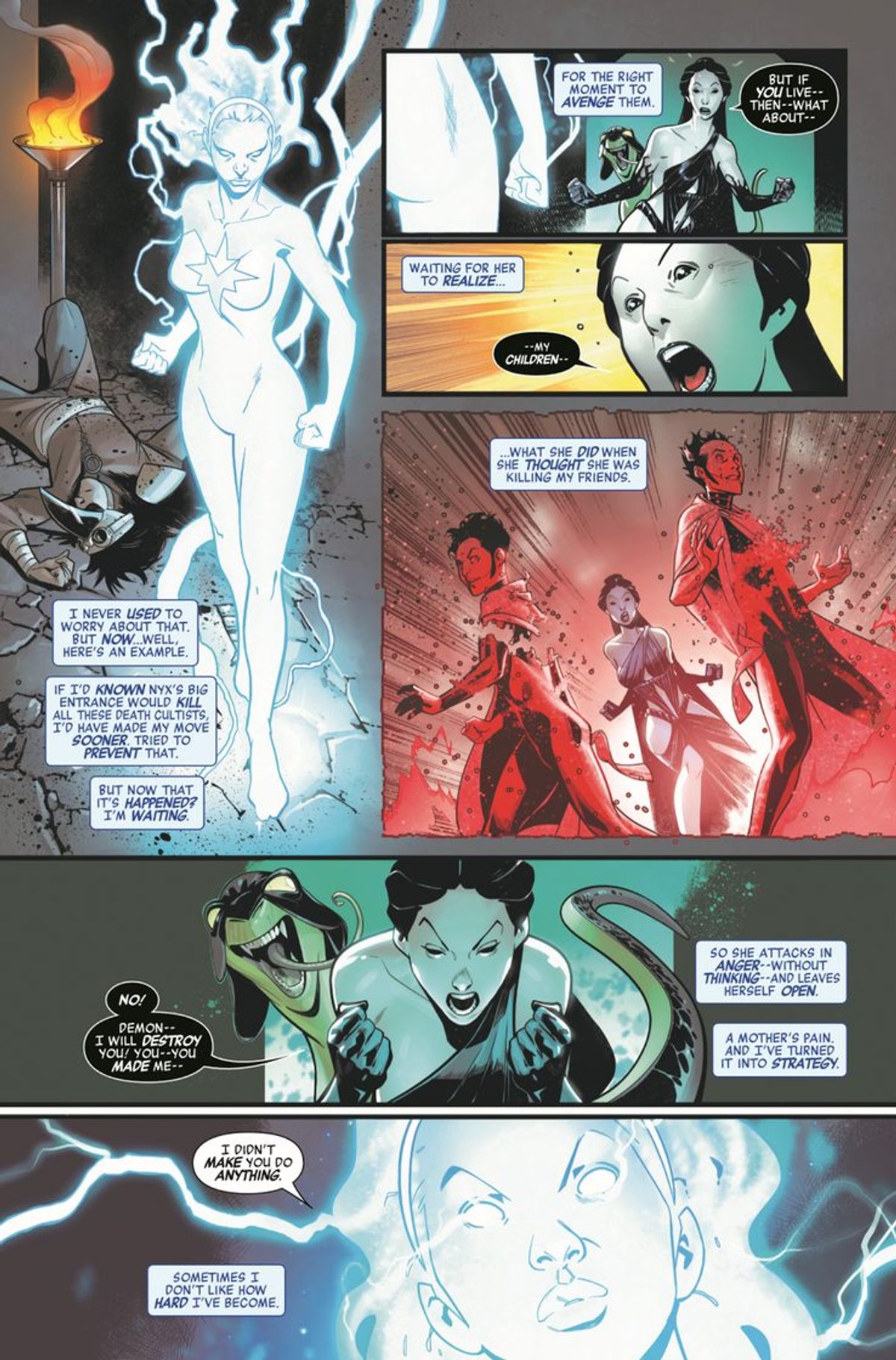Tornando a No Road Home - che Panini Comics pubblicherà a breve in Italia con il titolo di Avengers: Senza Ritorno - Monica ha utilizzato i suoi poteri illusori per far passare Dolos e Apate, figli di Nyx, per Ercole e Visione; dunque, l'attacco della dea destinato idealmente ai Vendicatori ha invece investito i suoi stessi discendenti, riducendoli in cenere.