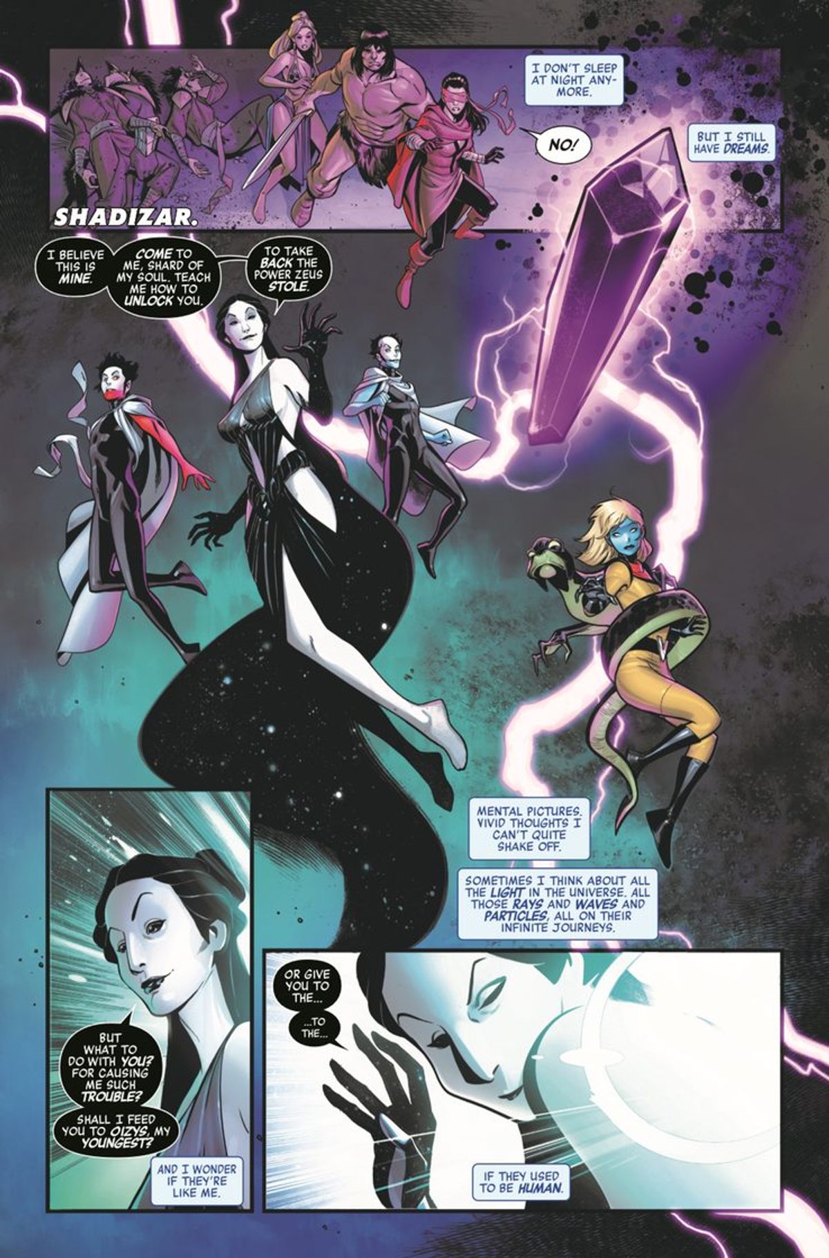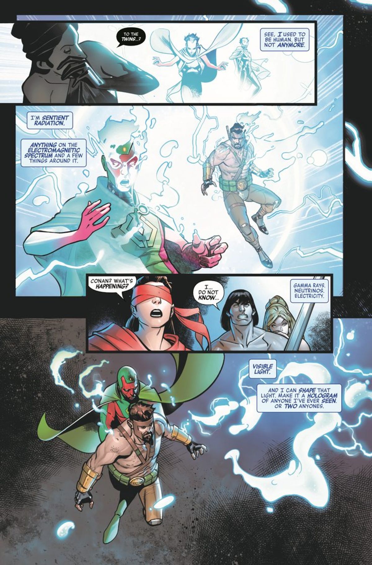 La Marvel ha recentemente diffuso l'anteprima dell'albo ma, prima di mostrarvela, è opportuno fare il punto della situazione riassumendo rapidamente i due accadimenti andati in scena sul numero #5 della maxiserie che hanno segnato il corso degli eventi.Scarlet è stata portata indietro nel tempo da Voyager, precisamente nell'Età Hyboriana, dove ha incontrato Conan il Barbaro; la dea Nyx ha invece eliminato Visione ed Ercole per vendicarsi dell'uccisione di suo figlio Hypnos da parte di Hulk.