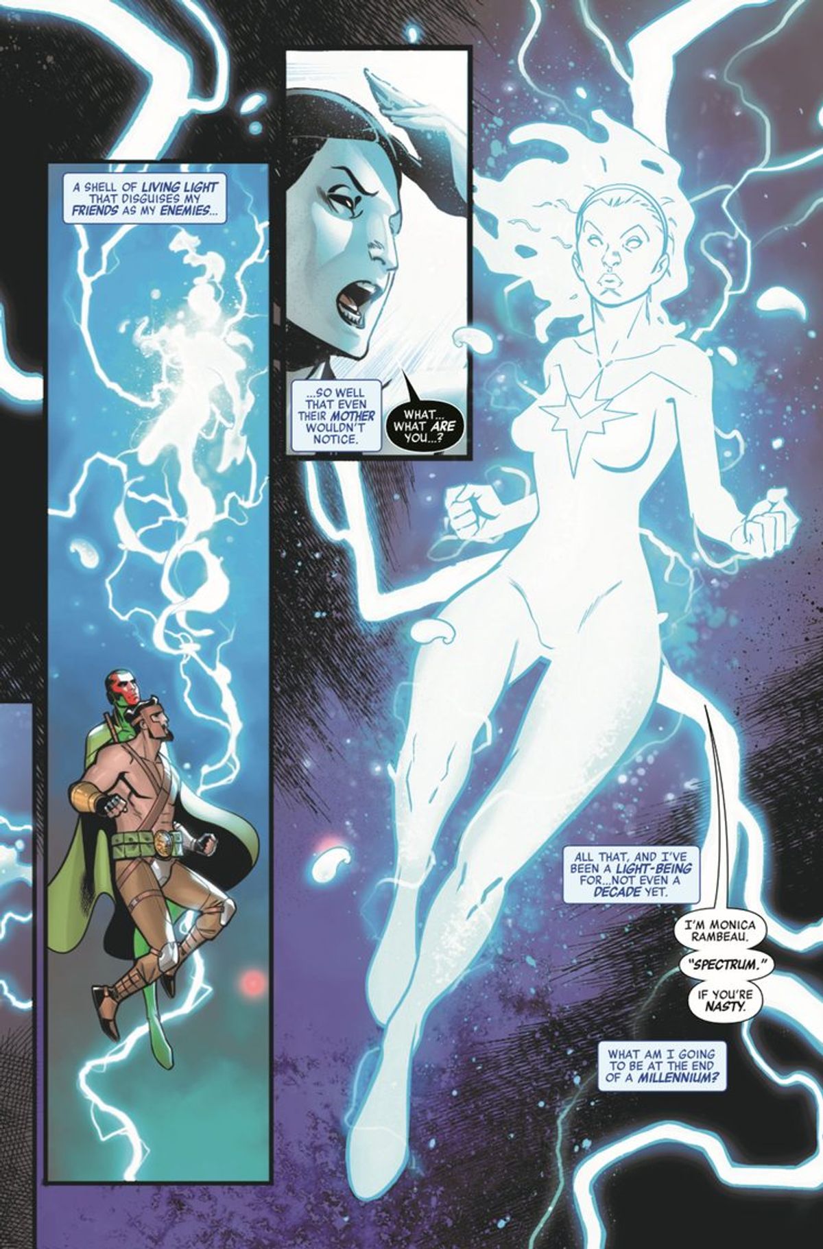 Visto che in Avengers: No Road Home #6 è stata esplorata l'avventura dal punto di vista del duo Scarlet/Conan, sarebbe stato lecito aspettarsi che l'appuntamento successivo avrebbe mostrato le conseguenze della caduta del sintezoide e del Leone dell'Olimpo; invece, a giudicare dalle tavole diffuse dalla Casa delle Idee, qualcosa non quadra, visto che entrambi risultano vivi e vegeti.Già dalle tavole in anteprima scopriamo che i due sono sopravvissuti grazie all'intervento di Spectrum, alias Monica Rambeau, che non a caso ritorna in scena: è infatti attualmente sul grande schermo con Captain Marvel, sebbene in una versione giovanile.