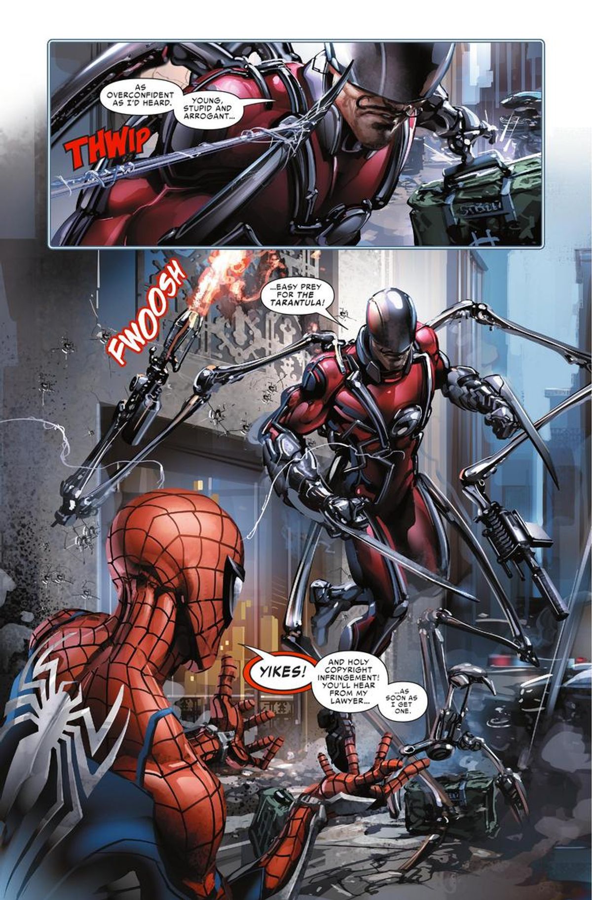 Christos Gage, sceneggiatore di Spider-Geddon e della trama del gioco, ha rilasciato in merito le seguenti dichiarazioni, alla vigilia dell'uscita del numero #0, che vede la luce proprio oggi negli U.S.A.Collaborare con quelli di Insomniac e con Marvel Games è stato grande. Ho lavorato nella divisione giochi della compagnia per tre anni e questa è stata una naturale continuazione. Tutti erano incredibilmente entusiasti e collaborativi e hanno approvato Tarantula come cattivo, che non si era ancora visto nell'universo videoludico.