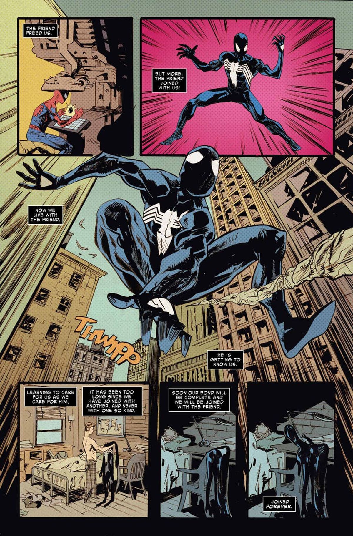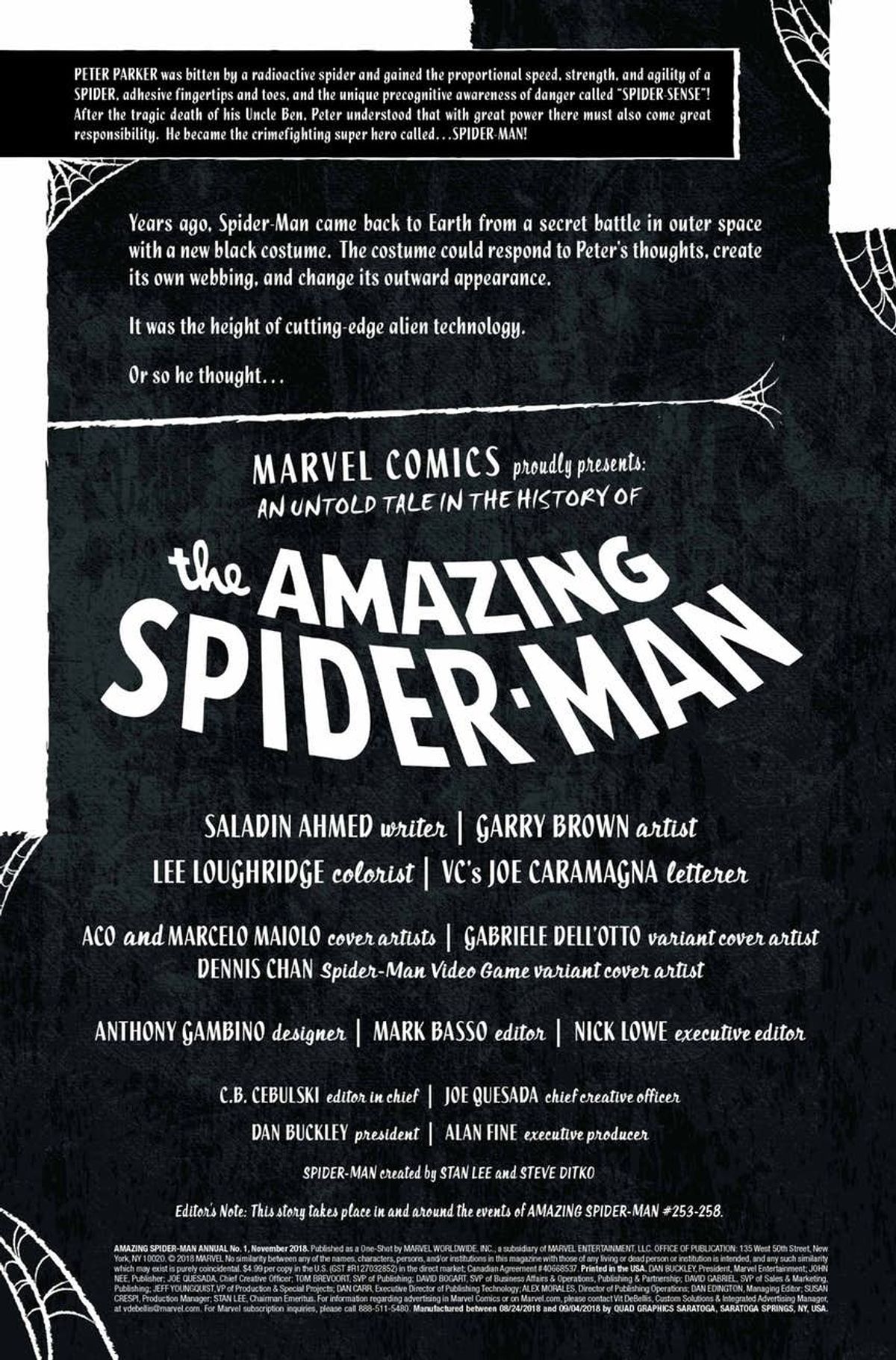 Vi proponiamo la sinossi e un'anteprima dell'albo in uscita domani negli Stati Uniti:Anni fa, Spider-Man tornò da un mondo alieno con un nuovo, fantastico costume, che successivamente avrebbe scoperto essere un simbionte alieno vivente che tentava di legarsi permanentemente a lui! Ma prima di essere respinto, il costume che sarebbe poi diventato Venom si è insinuato diverse volte in Peter, e, all'insaputa del suo ospite, lo ha condotto all'esterno durante la notte! Per la prima volta vedrete dove Peter sia stato condotto durante queste misteriose escursioni notturne! Saladin Ahmed (Black Bolt) tesse una nuovissima fiaba da incubo, illustrata dall'incomparabile Garry Brown, in quello che è certamente una storia da sogno per ogni fan di Spider-Man!