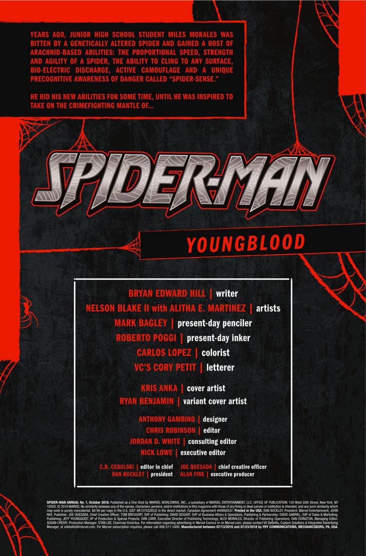 Spider-Man Annual #1 conterrà la storia Youngblood, ambientata nel passato del protagonista, scritta da Bryan Edward Hill (Postal) per i disegni di Nelson Blacke II (Ms. Marvel), Alitha E. Martinez (Iron Man), Mark Bagley (Ultimate Spider-Man), le chine di Roberto Poggi e i colori di Carlos Lopez, mentre la copertina è firmata da Kris Anka.La sinossi sembra fare riferimento a Secret Invasion, megaevento del 2008 scritto da Brian Bendis e disegnato a Leinil Francis Yu, in cui in qualche modo sarebbe stato coinvolto anche Miles (nonostante il suo approdo a Terra Prima sia avvenuto solo di recente). Per chi non lo sapesse, nel corso della saga veniva rivelato che gli alieni Skrull stavano da tempo impersonando alcuni eroi, infiltrandosi in posizioni di rilievo.