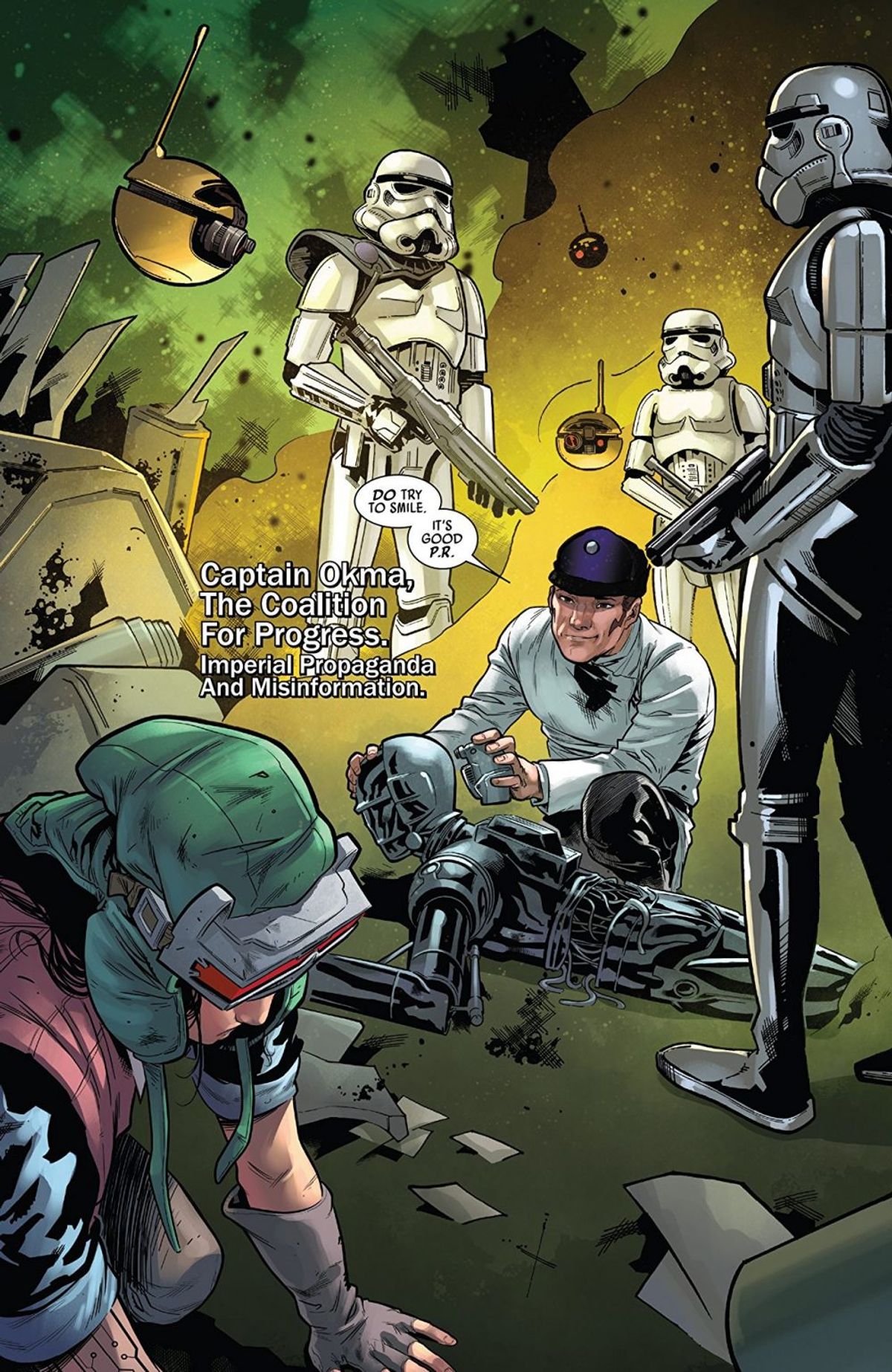 Nella pagina successiva, una sequenza a cui sono molto affezionato, vengono mostrate le reazioni di Tolvan alle azioni di Triplo Zero, invece che inquadrarle direttamente. Uno dei motivi che rendono il personaggio così spaventoso è la sua somiglianza con il piccolo ed educato modello C-3PO: "Si tratta di alcuni droidi protocollari che canticchiano una canzone", così viene descritto da Tolvan. Tendiamo a non mostrare quasi mai le cose terribili che compie il personaggio, perché svelare troppo romperebbe quell'alone di mistero inquietante. Pagine come questa sono quindi davvero efficaci, perché vediamo i dubbi e l'incredulità di Tolvan trasformarsi in repulsione e orrore.Nel numero #25, c'è una scena in cui sta strisciando dietro a Tam Posla e gli dice: "Salve. Sono Triplo Zero: relazioni e atrocità tra umani e cyborg". Successivamente, verso la fine dell'albo, c'è Aphra che nel risvegliarsi si rende conto che è stata legata a Triplo Zero con un impianto esplosivo, con lui che cercherà quasi certamente di ucciderla proprio nel momento in cui aprirà gli occhi.