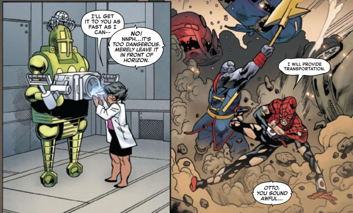 Nello scrivere lo scontro fra Otto e Terrax, quello tra Peter e Firelord era un riferimento forte. Quando lo lessi da piccolo, lo adorai. Spidey affrontava un nemico incredibilmente più potente di lui, ma non mollava un colpo. E questa è una delle caratteristiche che lo definisce come eroe e come persona. Volevo vedere come Otto Octavius avrebbe affrontato una situazione simile. Terrax, incredibilmente potente e chiaramente malvagio, laddove Firelord era più un antieroe, sembrava l'antagonista perfetto.