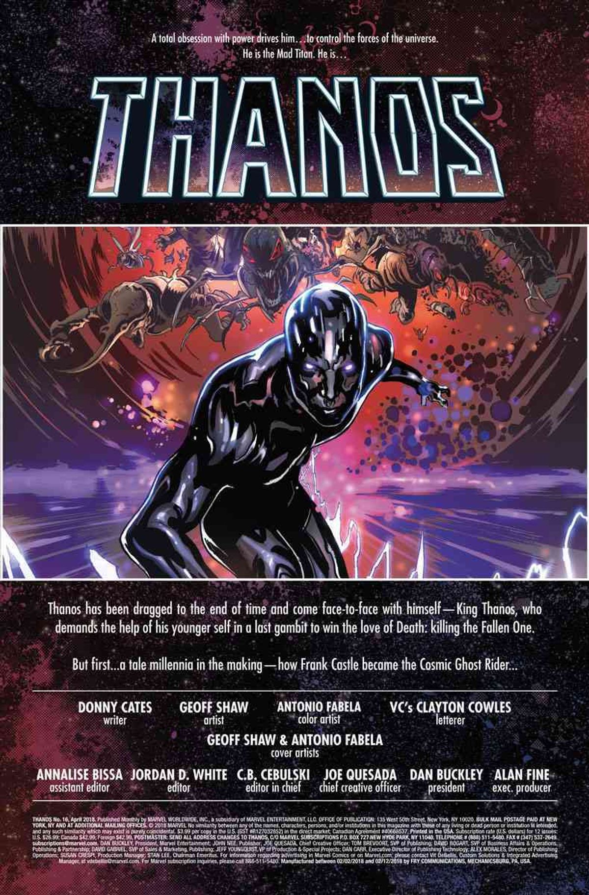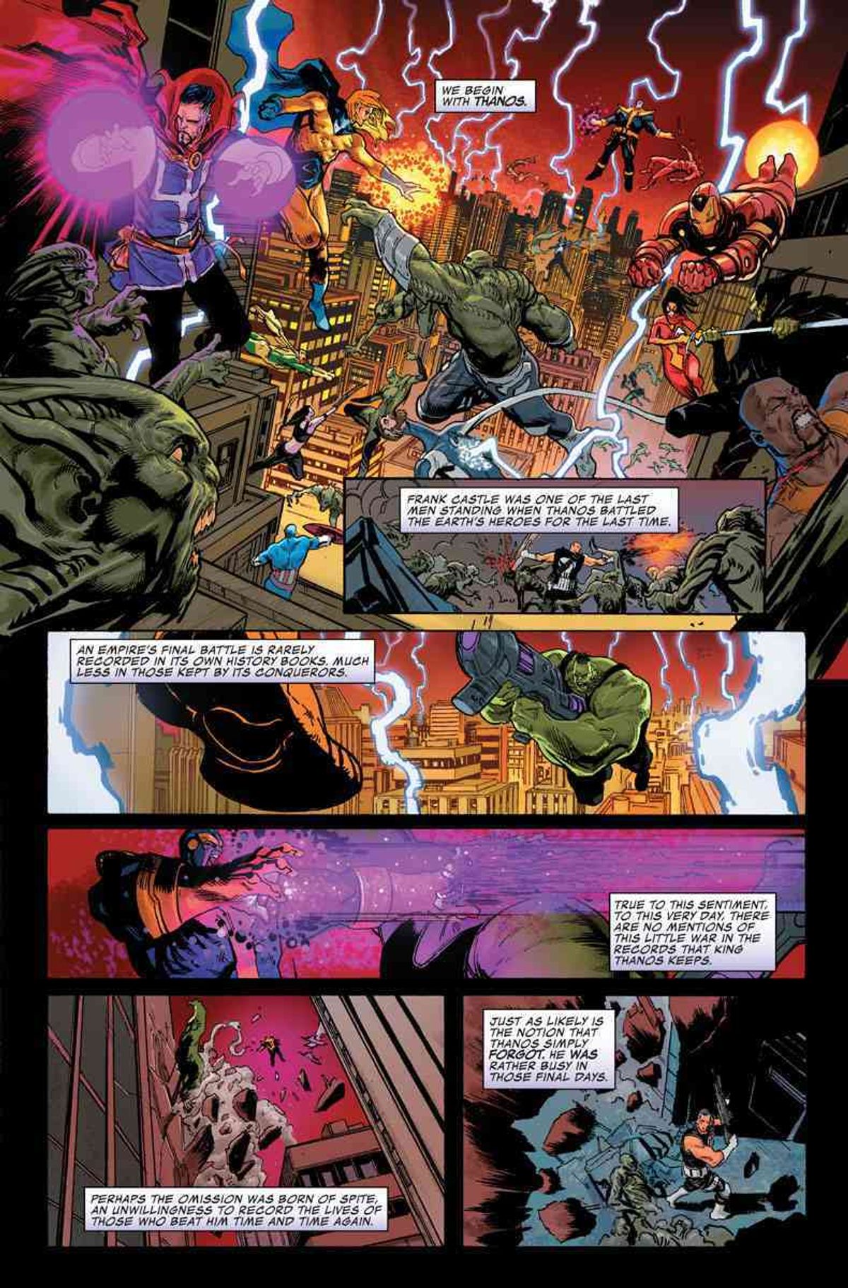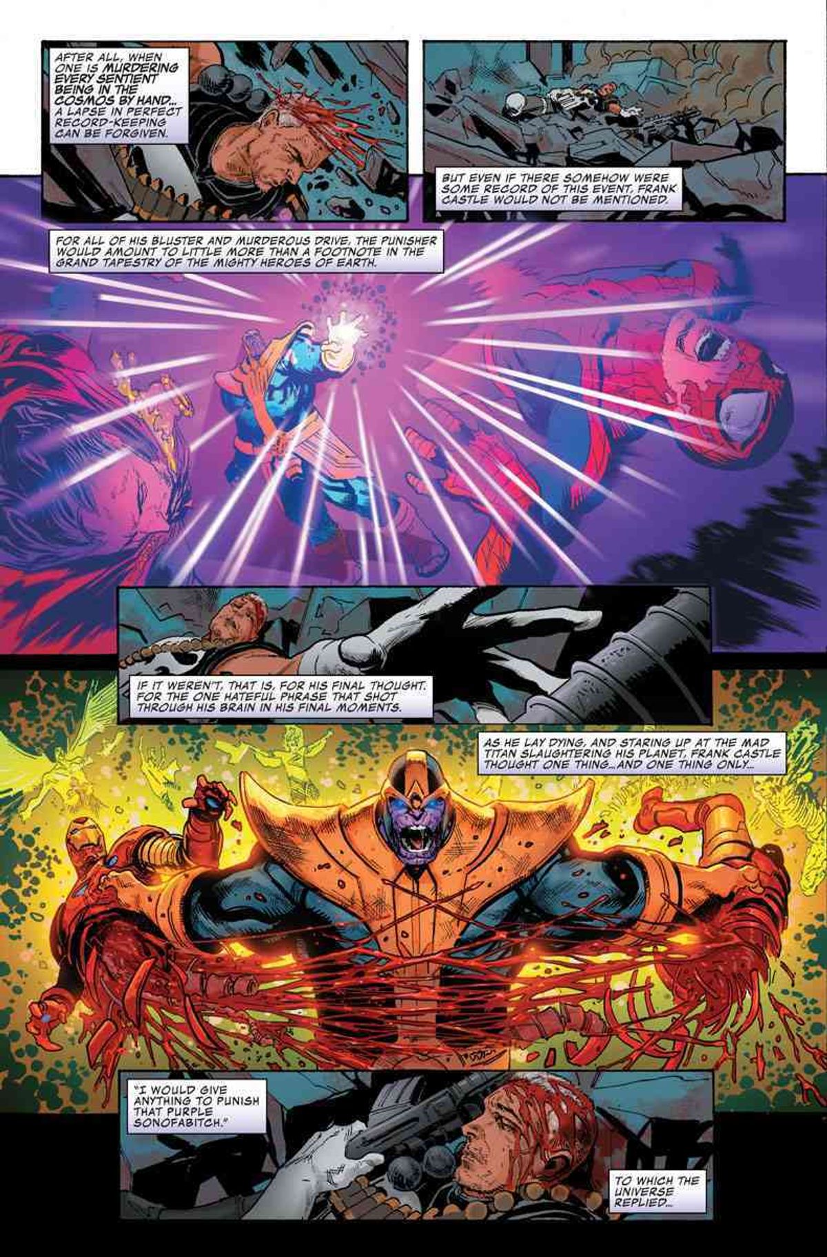 Stando all'anteprima del nuovo albo, il Punitore sarà uno degli ultimi superstiti della guerra contro Thanos per il destino della Terra. In punto di morte, Castle si assicurerà l'opportunità di punire chi lo ha ucciso stringendo un misterioso patto con Mefisto.Inoltre, sulle pagine di Thanos Annual #1, in uscita ad aprile, sarà lo stesso Ghost Rider cosmico a raccontare la storia del Titano vista attraverso il suo Sguardo di Penitenza. Nel numero #15 della serie, infatti, Castle ha scrutato nella mente del padrone: se di norma il suo sguardo uccide chi ne è vittima rendendolo consapevole dei misfatti che ha compiuto, in questo caso sembra aver suscitato piacere e ilarità in Thanos, che a quanto pare ha gradito poter osservare i suoi stessi pensieri più oscuri.