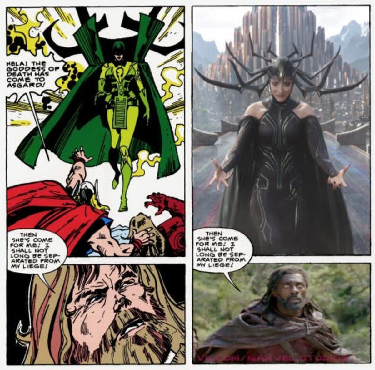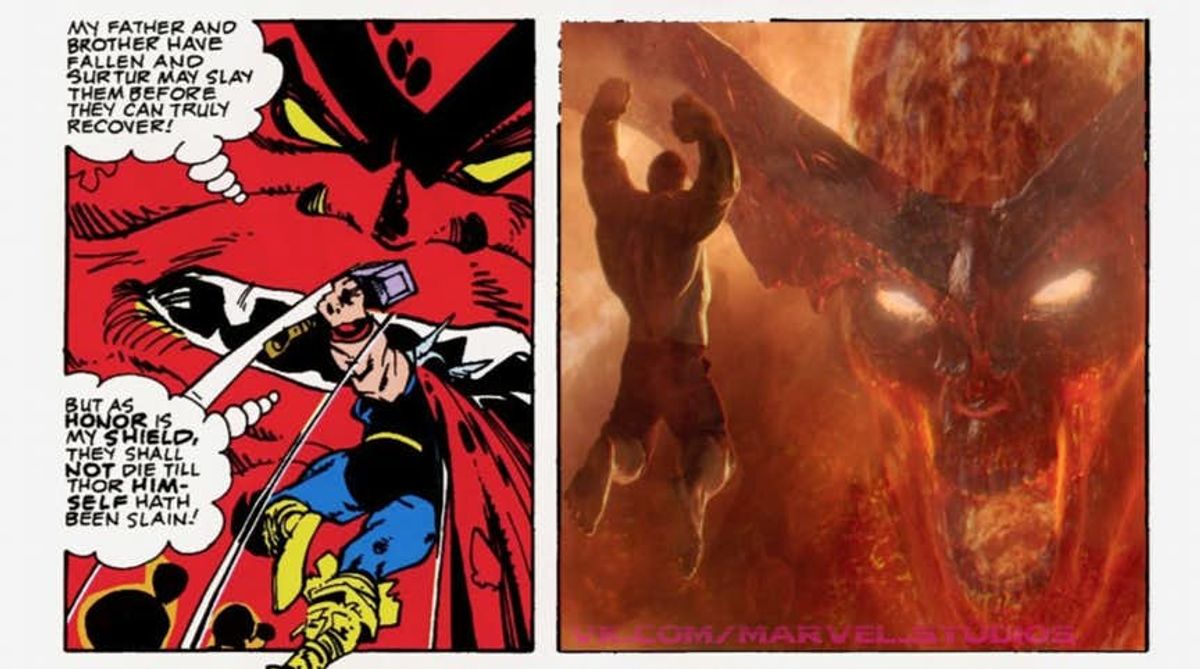 Con un recente tweet, il fumettista si è detto piacevolmente sorpreso delle analogie rilevate guardando il trailer del film Marvel Studios, proponendo una galleria di vignette con personaggi del calibro di Hela, Surtur e Skurge l’Esecutore affiancati da alcuni frame del film. Il risultato, come potete vedere nella galleria sottostante, ha il suo fascino.