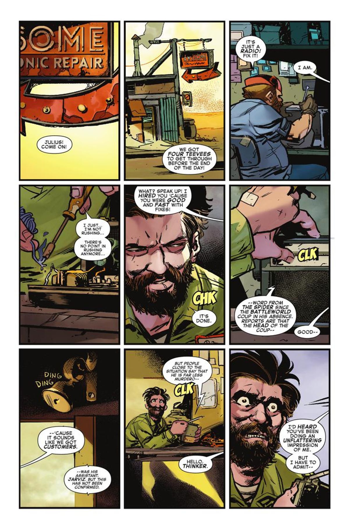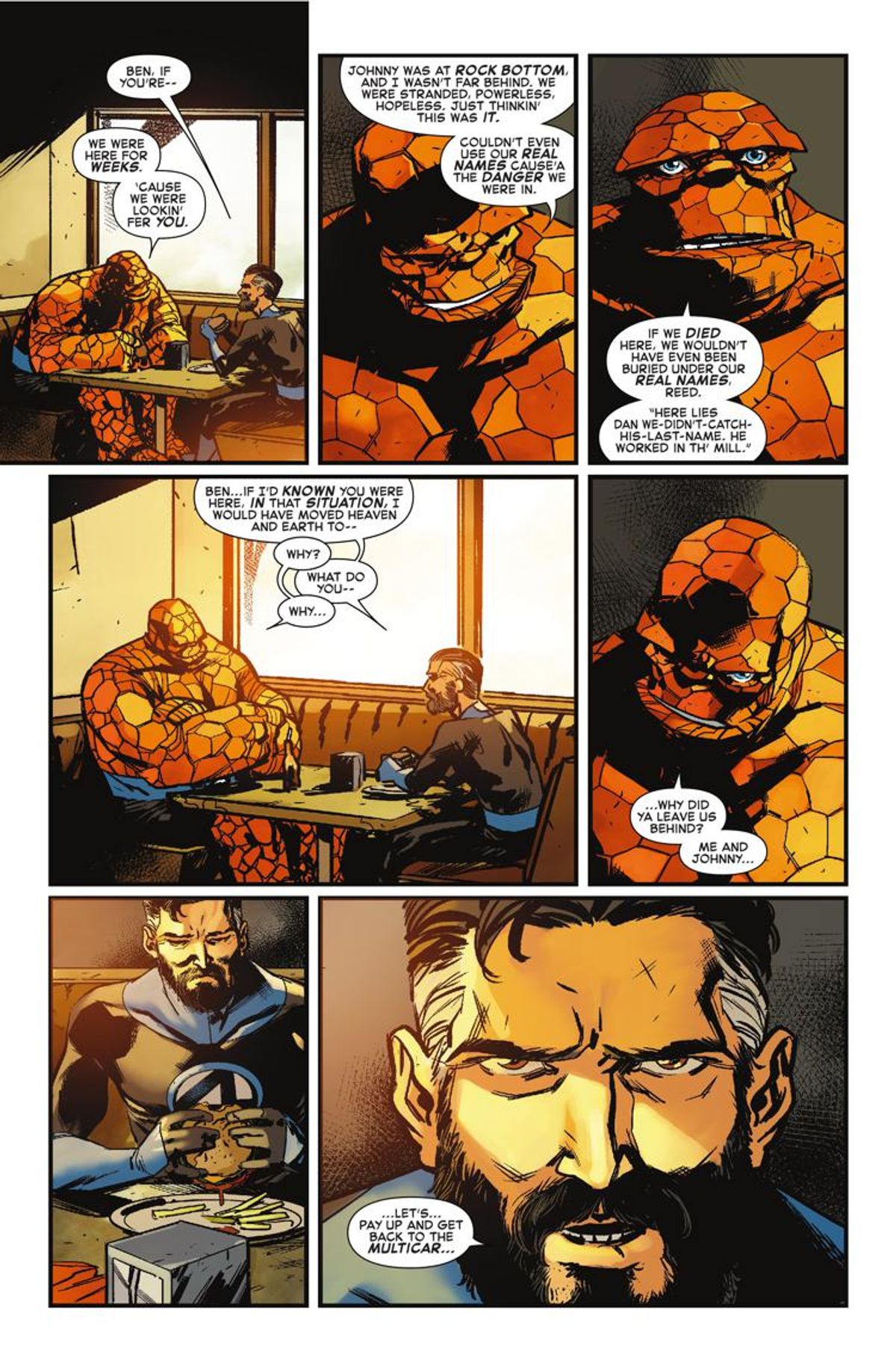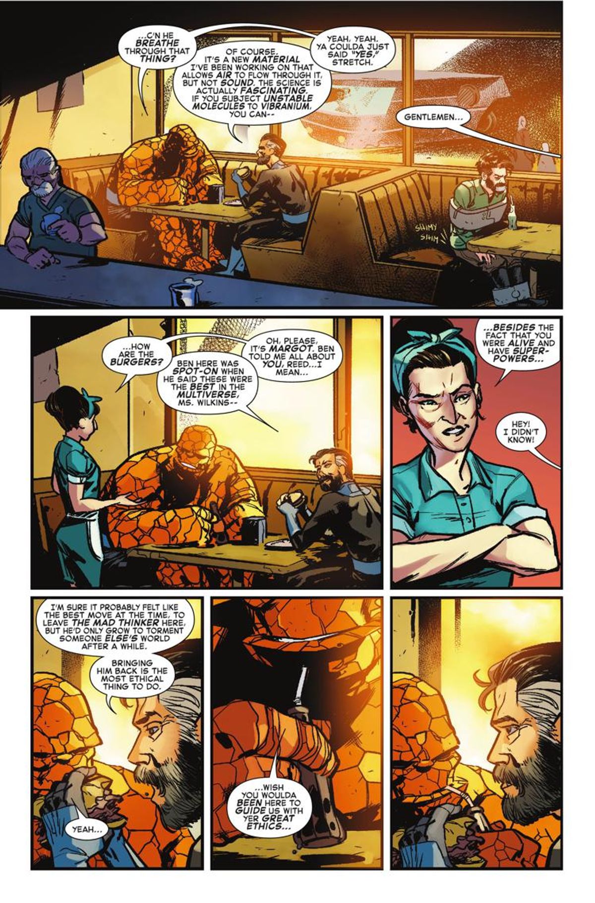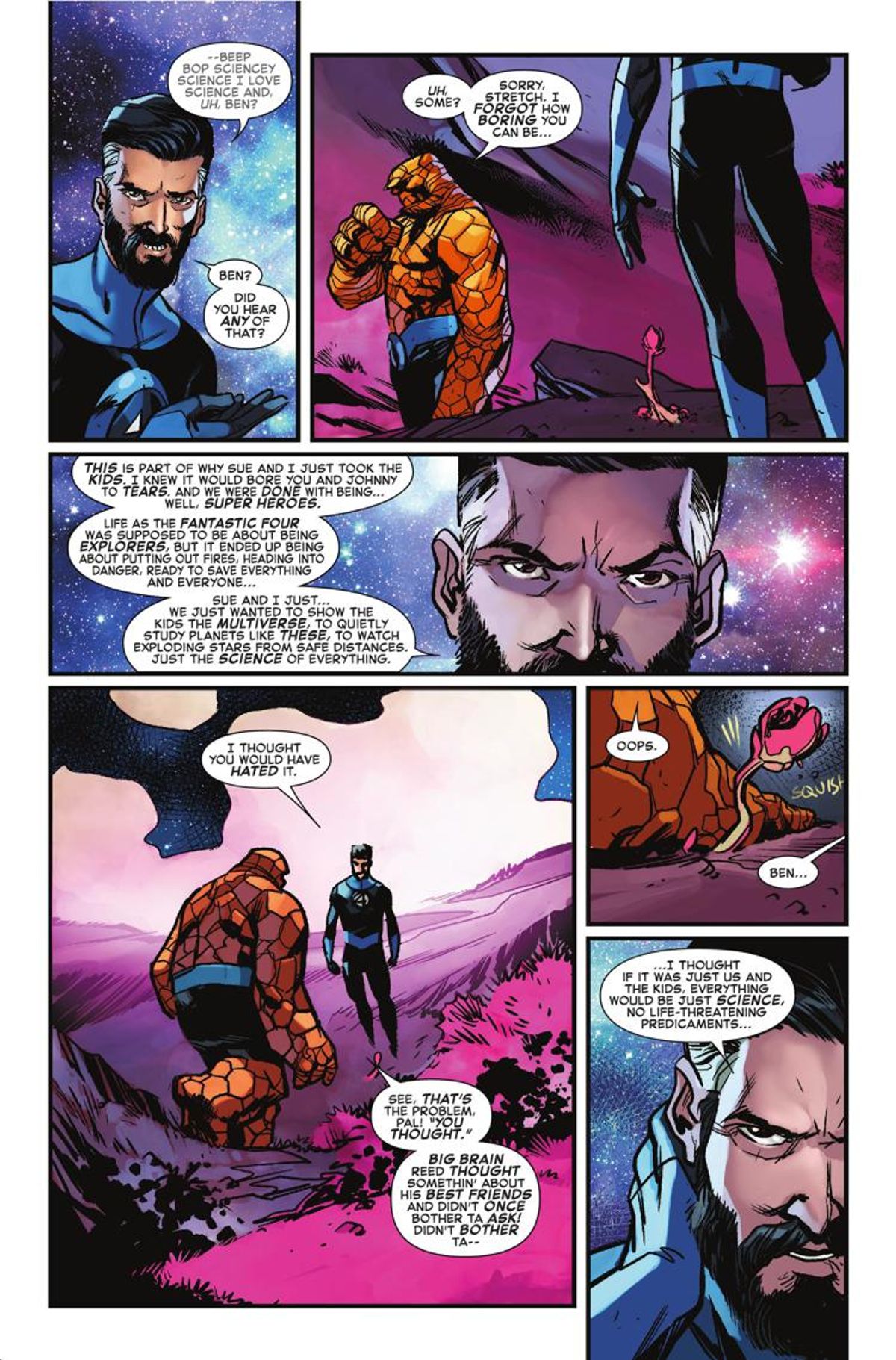 Osservando l'ultima tavola dell'anteprima di Marvel Two-In-One #11, albo in uscita il 31 ottobre oltreoceano, è possibile scorgere una delle tematiche personali descritte dallo sceneggiatore. In un dialogo molto accorato tra Reed Richards e Ben Grimm, il primo parla del suo legame con la scienza e delle ricerche che lui e la moglie Susan hanno condotto con i figli Franklin e Valeria nel periodo in cui sono stati lontani dalla Terra:Avevamo chiuso con l'essere super eroi. La vita come Fantastici Quattro doveva essere incentrata sull'essere esploratori, ma ha finito per riguardare cose come spegnere incendi e saltare a capofitto nel pericolo, pronti a salvare qualsiasi cosa e chiunque... Sue e io volevamo solo... mostrare ai ragazzi il Multiverso, studiare con calma pianeti come questo, osservare da una distanza di sicurezza le stelle che esplodono. Concentrandoci unicamente sull'aspetto scientifico di ogni cosa.