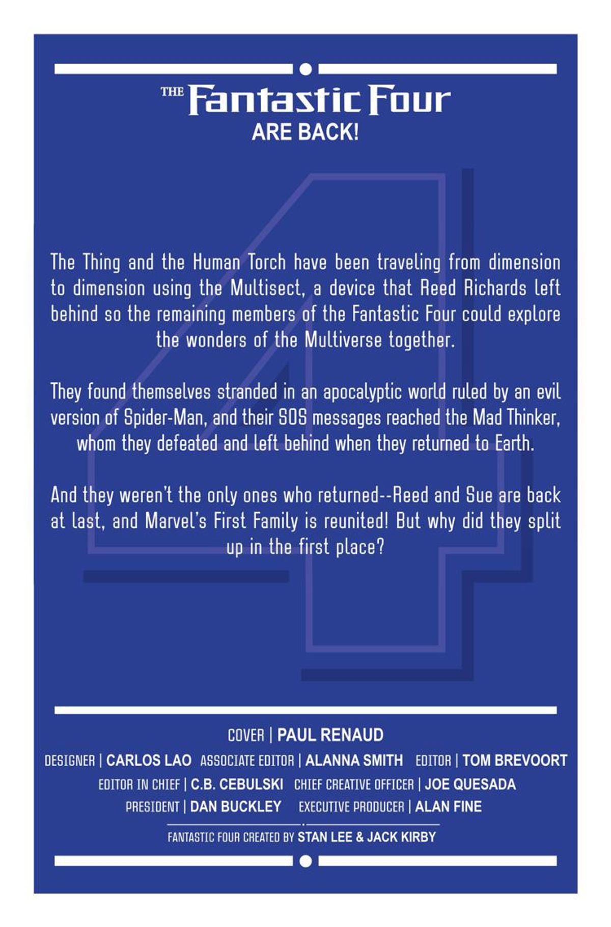 I Fantastici Quattro sono tornati! Ma devono affrontare le conseguenze della loro assenza, sia riguardo l'universo sia all'interno della loro stessa famiglia. La Cosa e Mister Fantastic intraprendono un viaggio per correggere gli errori e guarire le ferite... a meno che non sia già troppo tardi.