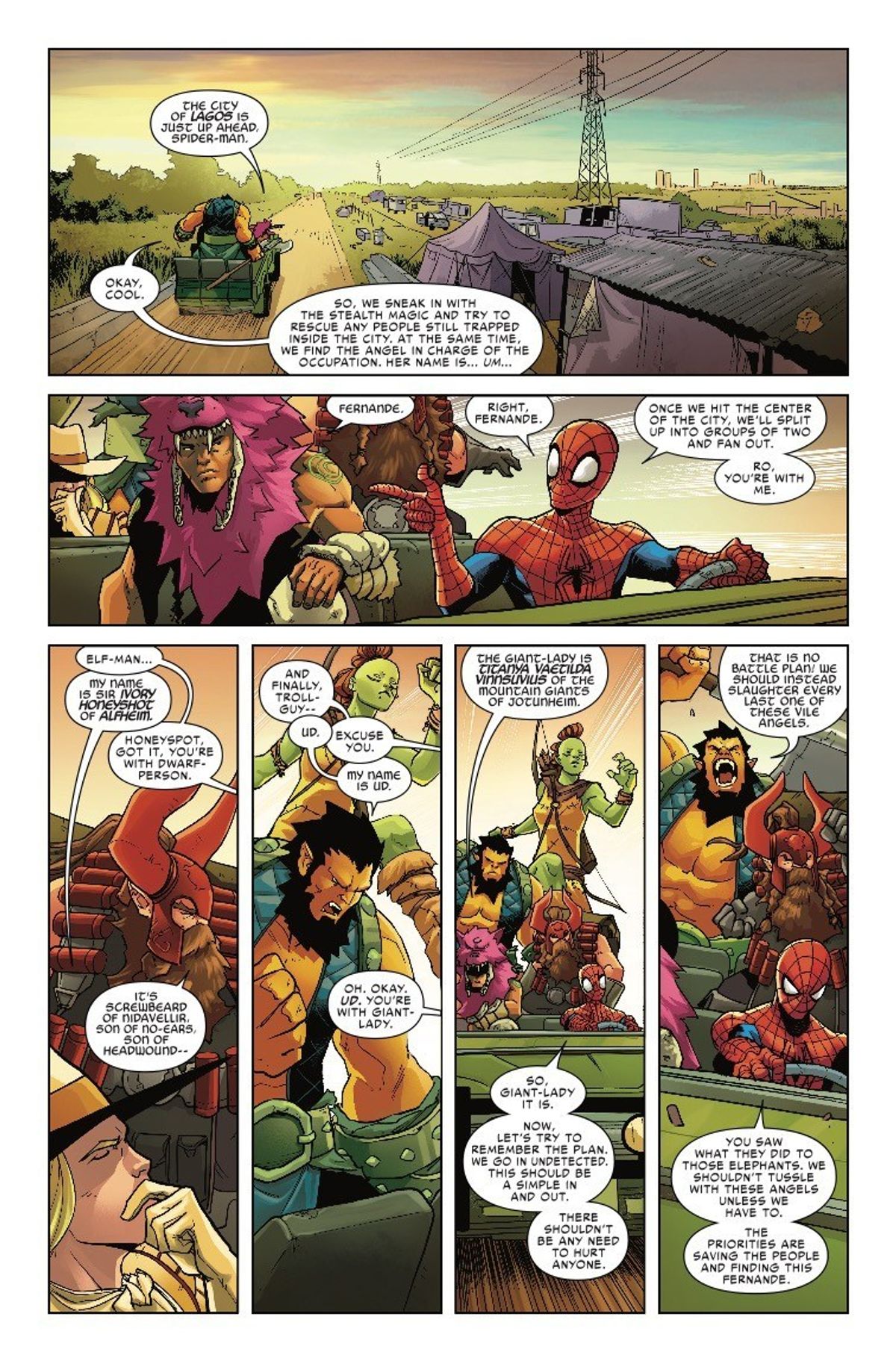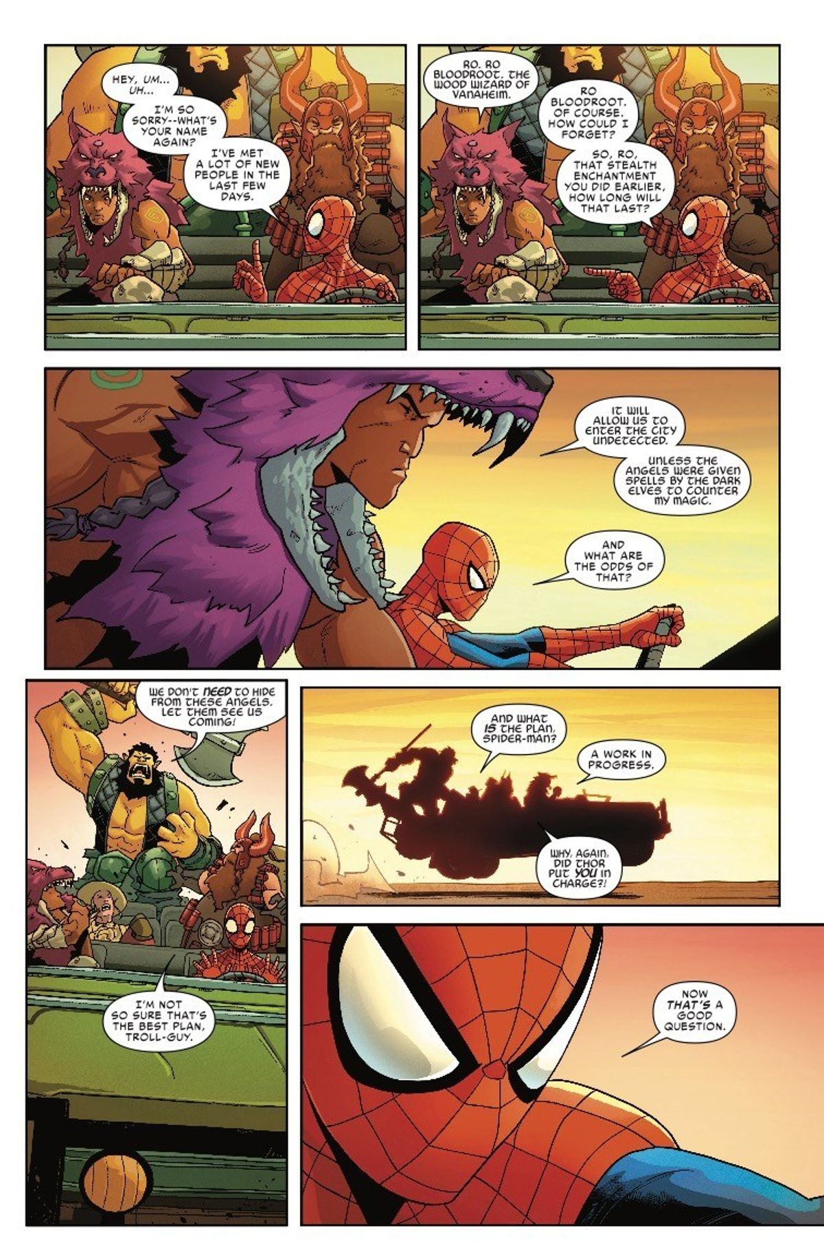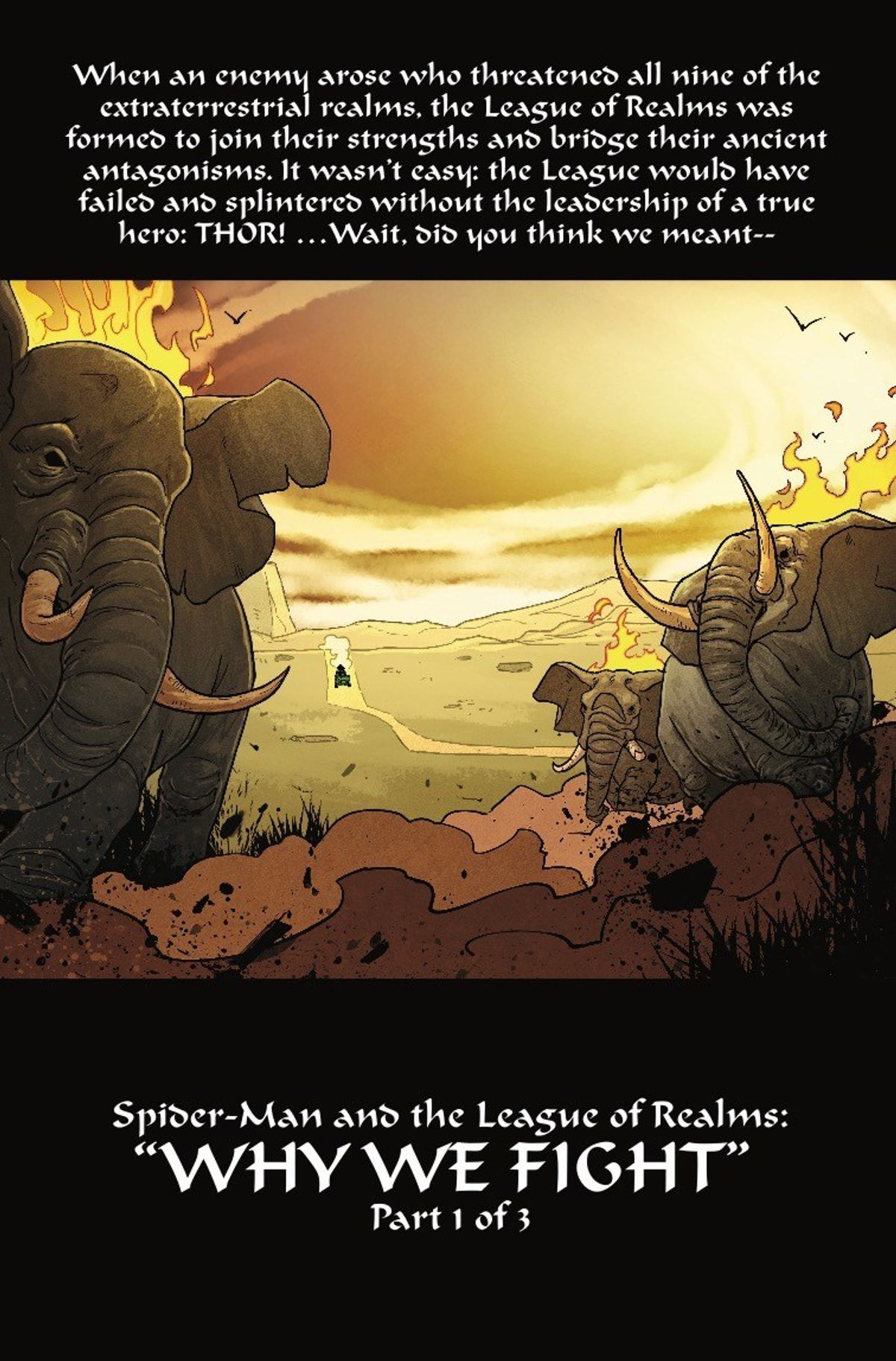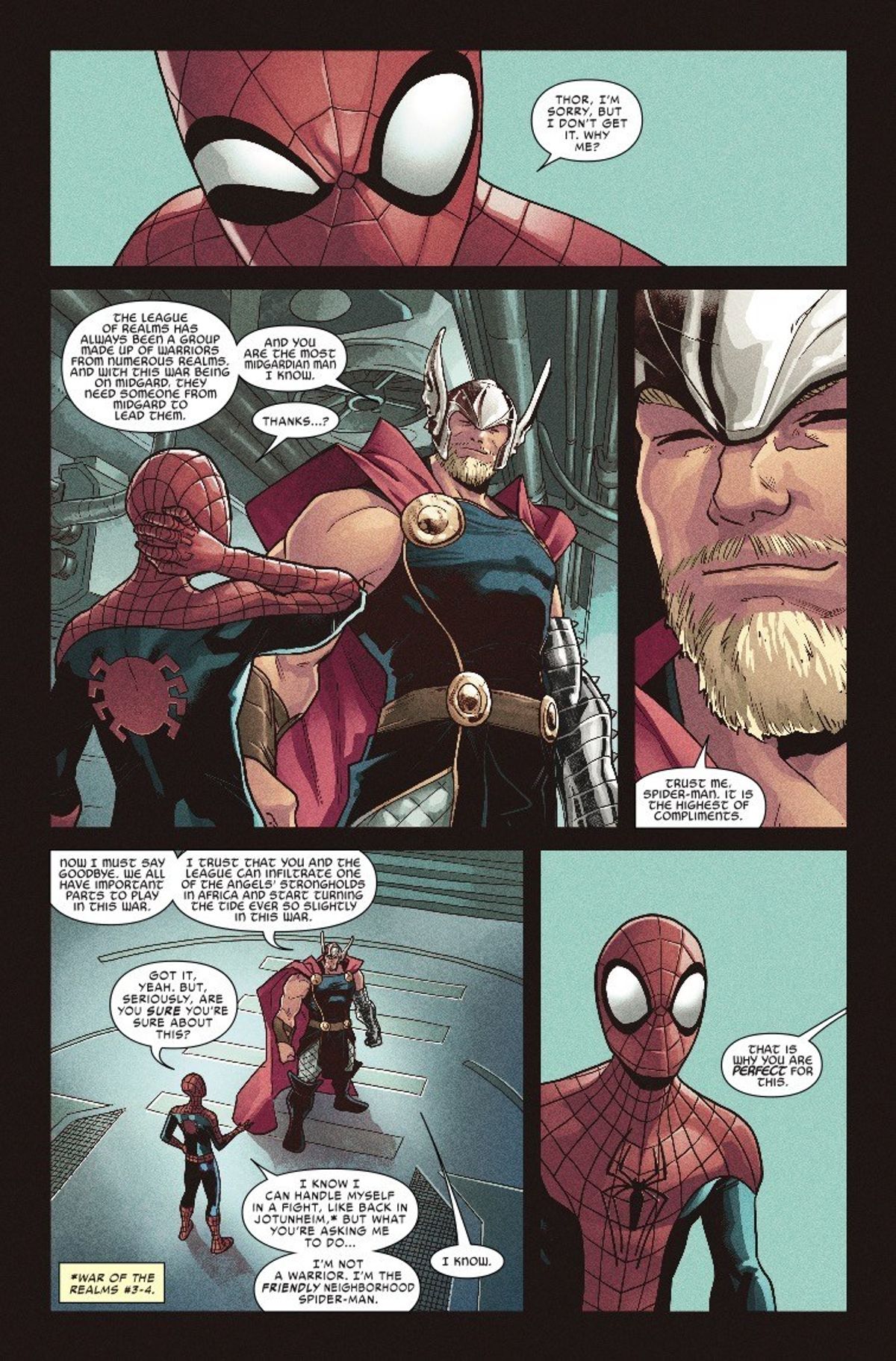 Il Tessiragnatele, dunque, rappresenterà Midgard nella Lega dei Regni, una squadra composta da un campione per ogni reame e già vista all'opera sulle pagine di Thor: Dio del Tuono. Perché questo ruolo è toccato proprio a lui? La risposta è nelle prime tavole diffuse dalla Casa delle Idee: il Figlio di Odino spiega a Peter Parker che è lui l'uomo più "midgardiano" che conosca!Gli altri membri della squadra già noti sono Screwbeard il nano, Ud il troll, il mago Ro BloodRoot, l’elfo della luce Sir Ivory Honeyshot e il Gigante della Montagna, mentre è ancora ignoto chi sarà il campione di Asgard.