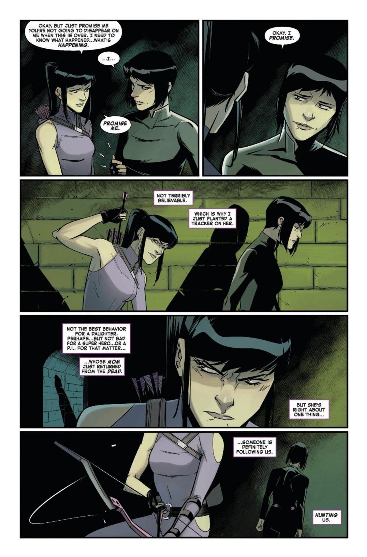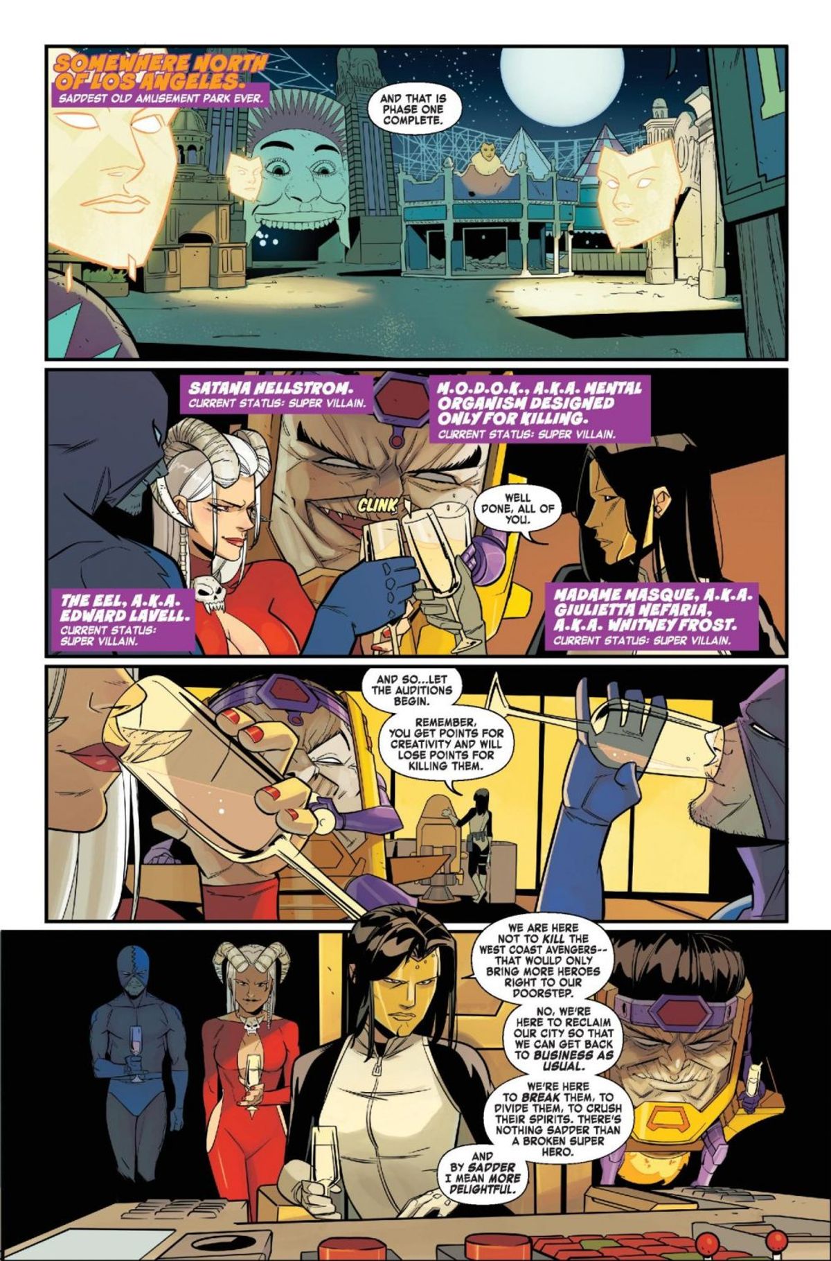In chiusura vi presentiamo la sinossi dello spillato, seguita da alcune tavole in anteprima:Prosegue City of Evils! A volte, salvare la situazione significa salvare anche te stesso, così potrai vivere abbastanza a lungo per fare i conti con una nuova crisi e, quando una sfilza di nemici si unisce per distruggere i Vendicatori della Costa Ovest, i nostri eroi devono fare proprio questo! Speriamo possiate sopravvivere all'esperienza a Los Angeles! (Sì, abbiamo inserito un X-Man solo per poterlo legittimamente affermare! Quindi, ora possiamo licenziare Quentin?) Cosa c'è ad attendere gli eroi nella casa degli orrori? E quali volti familiari metteranno i bastoni tra le ruote al team tutto-fuorché-oliato guidato da Kate Bishop?