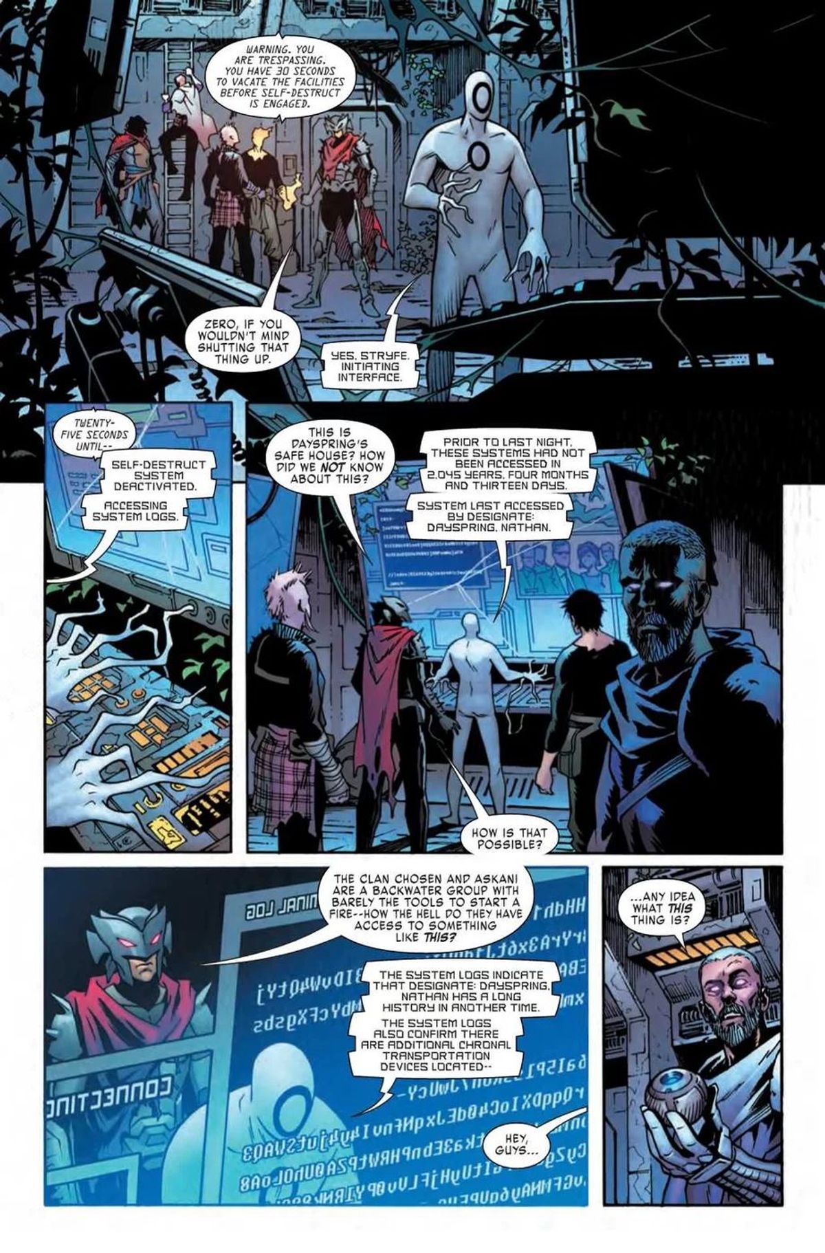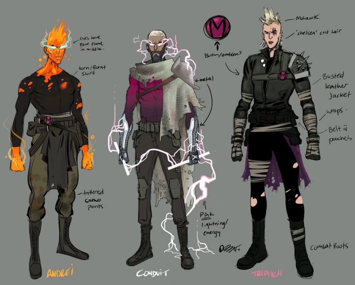 Gli ultimi due li ho creati quando ero un ragazzino, quando scrivevo e disegnavo le mie fan fiction sugli X-Men. Avere l'occasione di inserirli oggi nell'Universo Marvel è per me una gioia. Il design di questi personaggi è opera di Dylan Burnett. Io gli ho passato le descrizioni di ognuno, invece di imporgli delle idee precise, frutto della mente di un tredicenne. Ed è stato molto meglio per i personaggi.Conduit, come suggerisce il nome, ha il potere di caricarsi di energia e di condurla attraverso il proprio corpo. La versione che creai da ragazzo usava dei cucchiai per farlo. In questo caso, usa dei manganelli, il che è molto più figo. Triptych è in grado di dividersi in tre golem di pari potere per lanciare un assalto su più fronti.