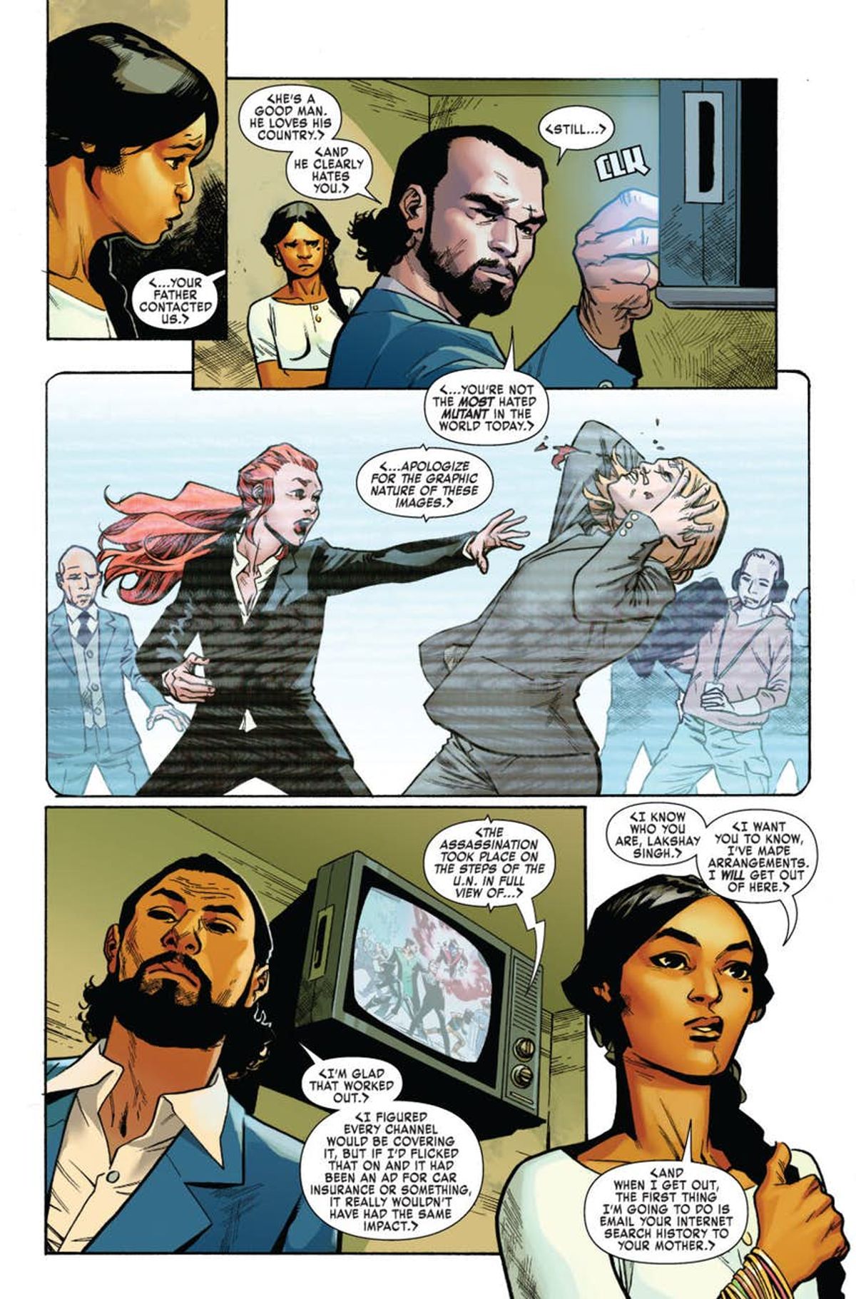 Namor mi serviva, in questa storia, come rappresentante e capo di una nazione straniera. Vogliamo toccare grandi temi e abbiamo bisogno di uno come Namor, il dominatore dei mari, il regnante di Atlantide. Jean ha bisogno di sostegno, per parlare alle Nazioni Unite e ne avrà anche nella fase successiva. Namor è un uomo di grande peso e non è qui per prendere la gente a cazzotti, bensì per il suo ruolo politico. Come avete visto nel primo numero, ha detto a Jean di non avere tempo per essere uno degli X-Men, ma sarà lì per lei quando avrà bisogno.