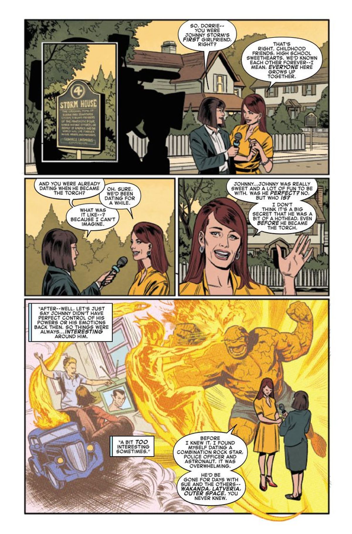 Il nostro tour attraverso la Storia della Marvel continua mostrando i più grandi personaggi dalla Golden Age ad oggi rivisti attraverso gli occhi della gente comune! Questa volta, gli scrittori Evan Dorkin e Sarah Dyer (Beasts of Burden, Space Ghost: Coast to Coast, Superman: The Animated Series) e l’artista Benjamin Dewey (The Autumnlands, Beasts of Burden) racconteranno la storia del ritrovo dei compagni di scuola della Torcia Umana dei Fantastici Quattro. La sua città natale Glenville, a Long Island sta impazzendo, e assisteremo al tutto attraverso gli occhi dell’ex fidanzata della Torcia Dorrie Evans e della reporter Marcia Hardesty: i preparativi, i racconti cittadini sulla Torcia, i festeggiamenti e altro ancora. Ma c’è una strana distanza tra Johnny Storm e i suoi vecchi compagni di scuola, dovuta a motivi che Dorrie conosce molto bene e che Marcia è determinata ad approfondire. Con la partecipazione di ex cattivi, pericolosi souvenir, una grigliata sulla spiaggia e, naturalmente, l’enorme segugio Inumano noto come Lockjaw! Non perdetevi i festeggiamenti!