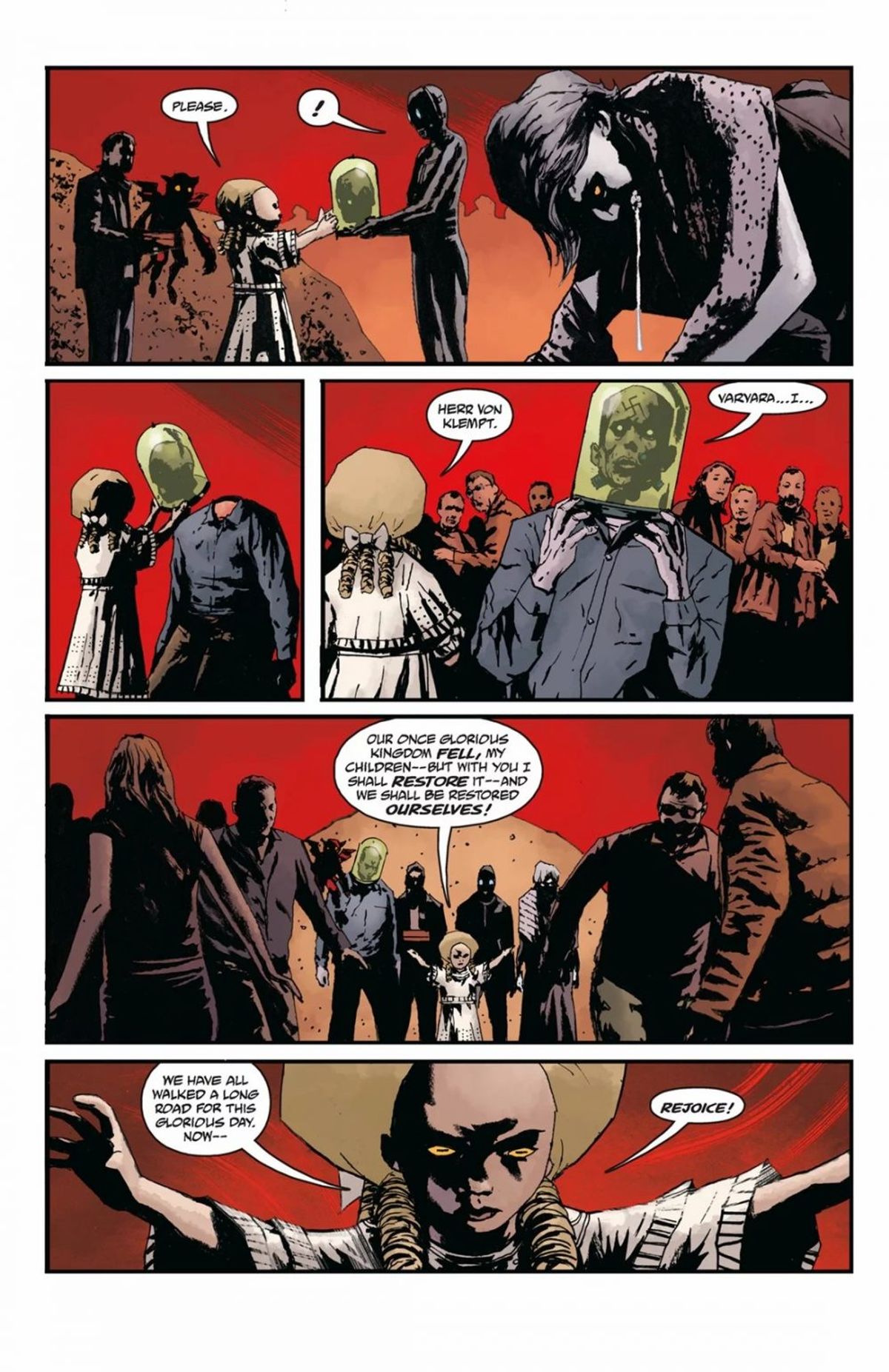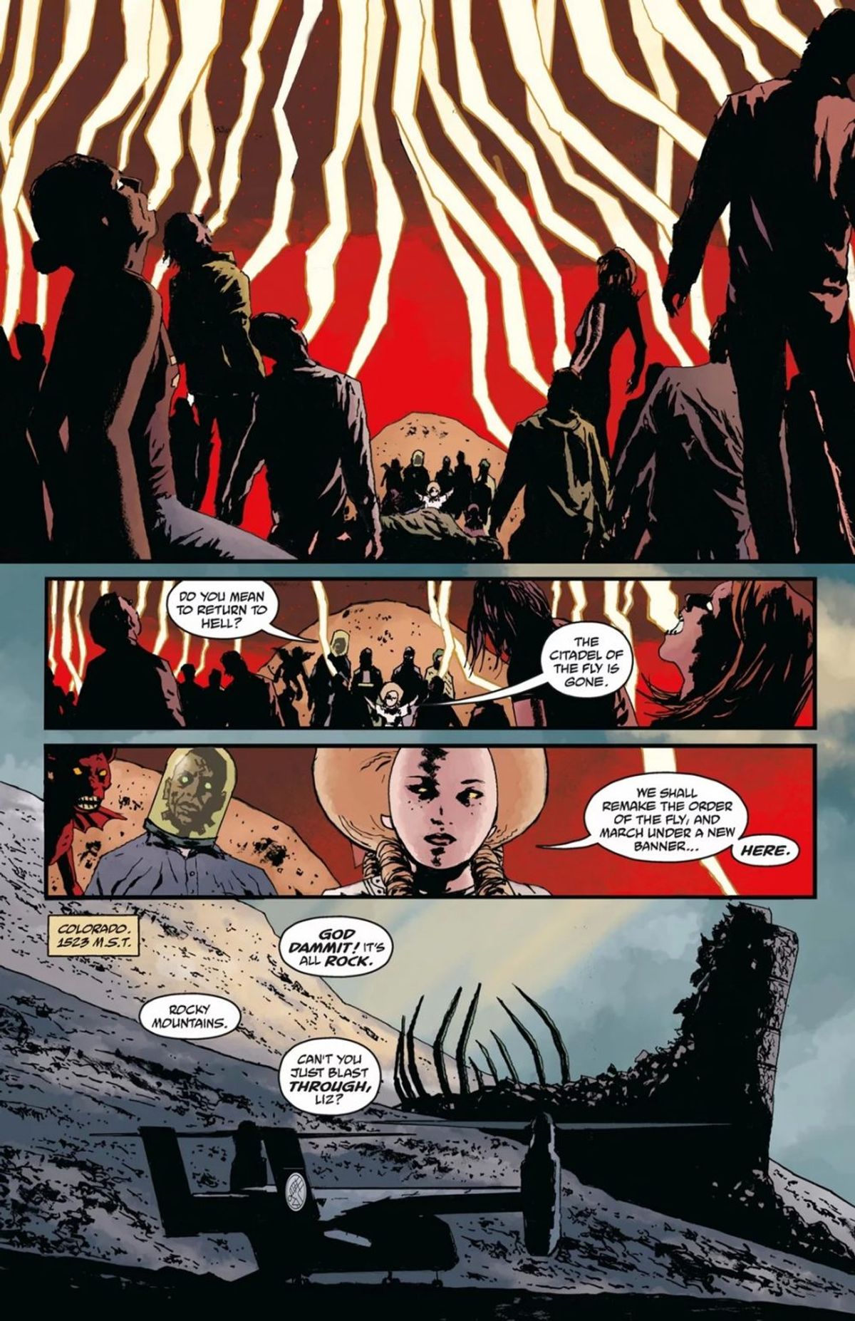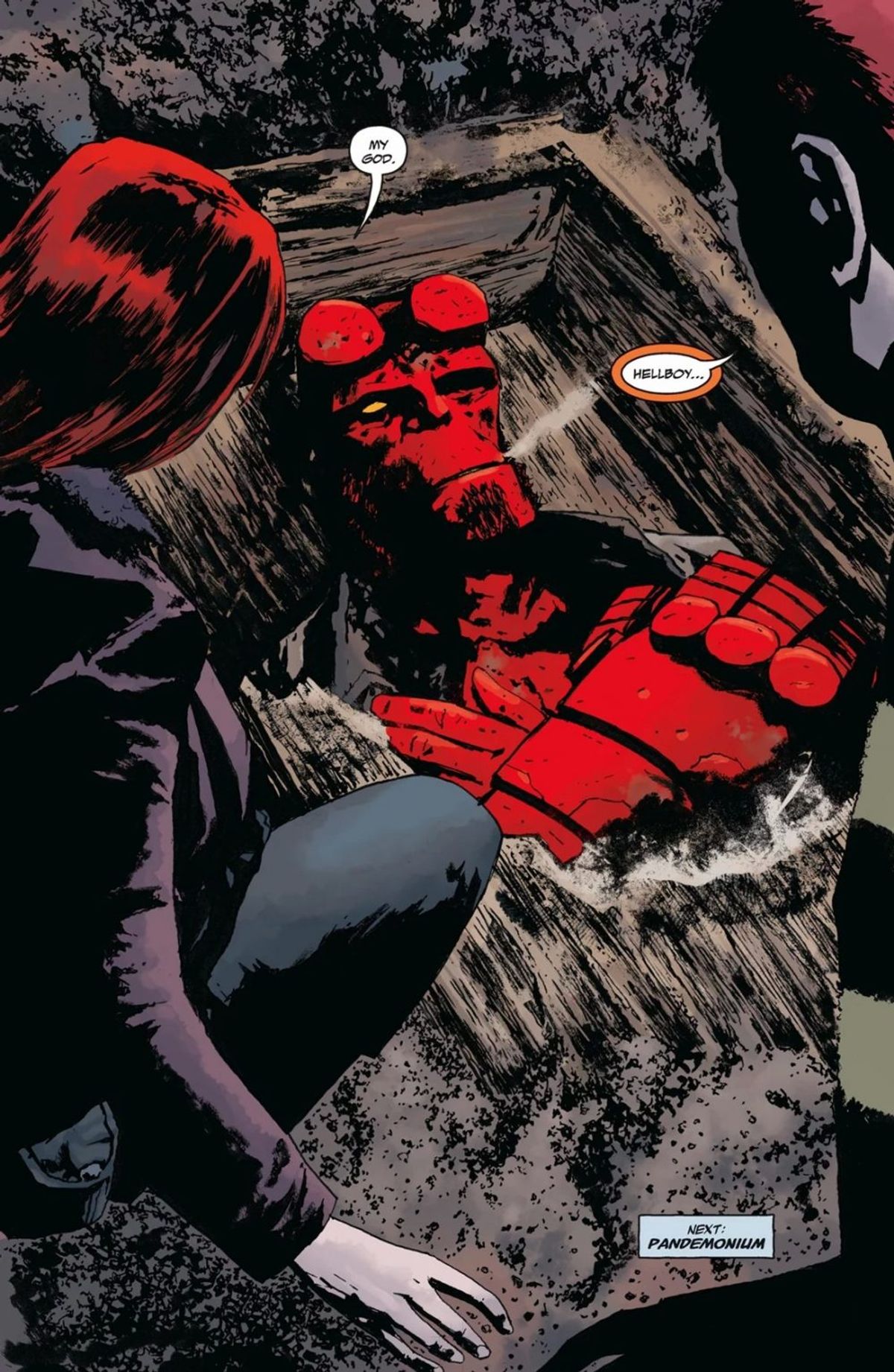 Abbiamo suggerito in King of Fear che nel futuro, prima o poi, Hellboy sarebbe tornato, ma nessuno ha colto quell'indizio, il che è grandioso poiché volevamo far sì che la gente si chiedesse "Questo significa qualcosa?". Mentre le trame andavano avanti, volevamo essere certi che quello che avevamo promesso l'avremmo mantenuto. Specialmente questi piccoli, divertenti indizi che sembravano non avere alcun significato all'epoca... be', forse significavano qualcosa! Io e Scott Allie stiamo pianificando tutto ciò da molto tempo.Anche in Hellboy in Hell, all'inizio, Edward Grey e Baba Yaga dicono che Hellboy deve fare ancora alcune cose. E se contate bene, alla fine della storia ne rimangono ancora un paio. L'ho sempre saputo, "Questo povero bastardo non può lasciare le cose incompiute".