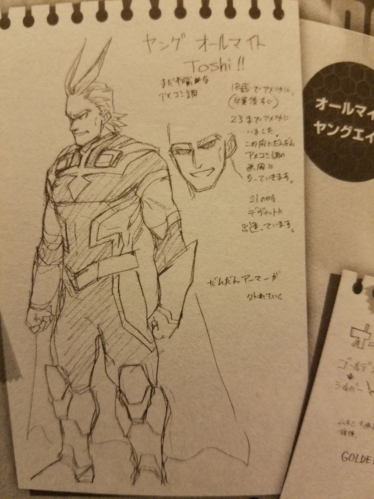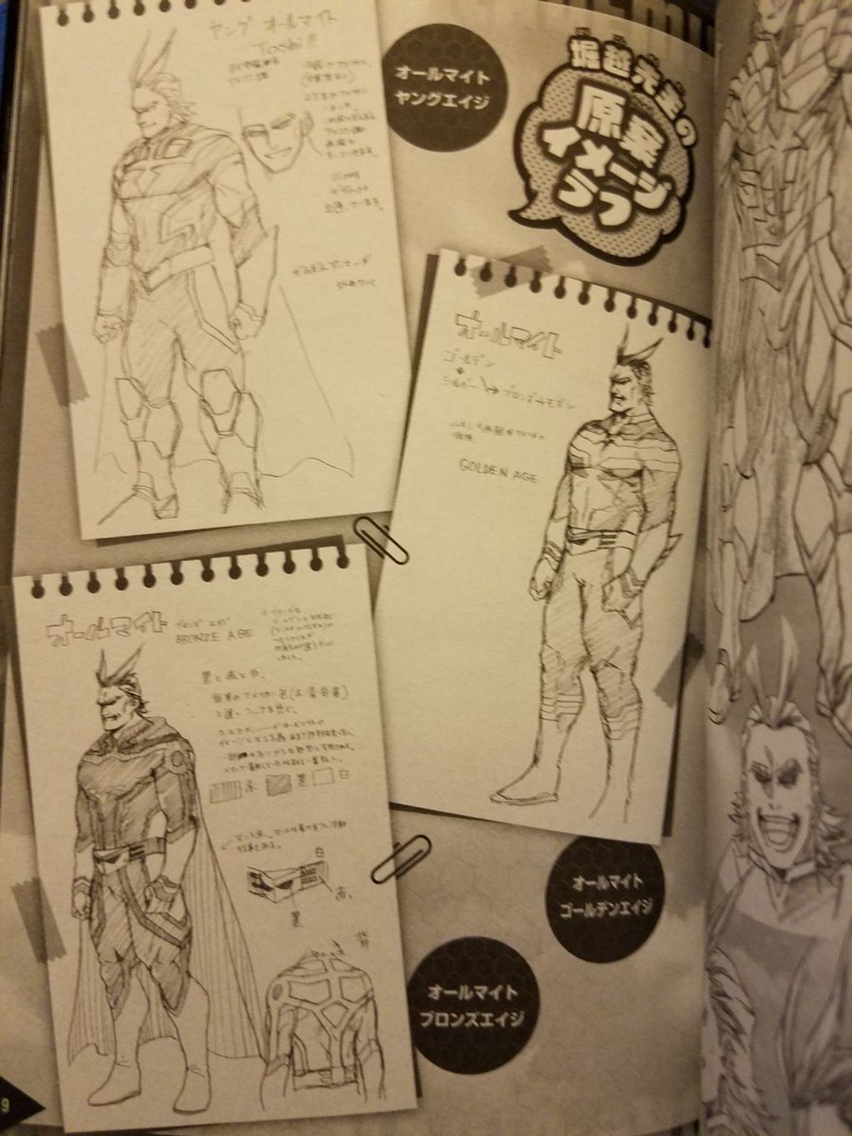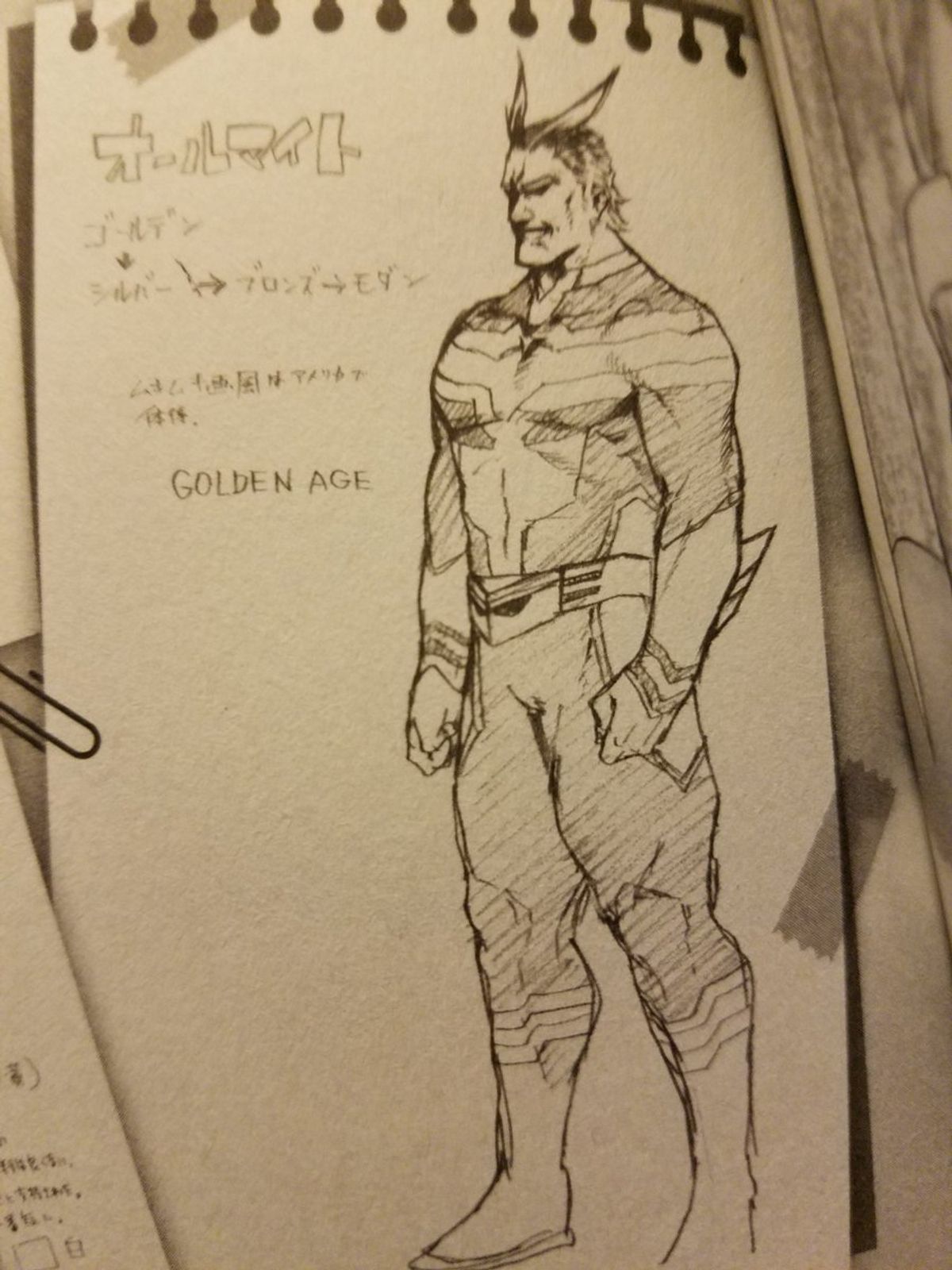 Nei bozzetti che potete ammirare qua sotto vedete All Might con il costume utilizzato nella pellicola diretta da Kenji Nagasaki e come sarebbe stato il più grande eroe del mondo, "il Simbolo della Pace", se fosse apparso nell'età dell'oro e del bronzo dei comics.Galleria