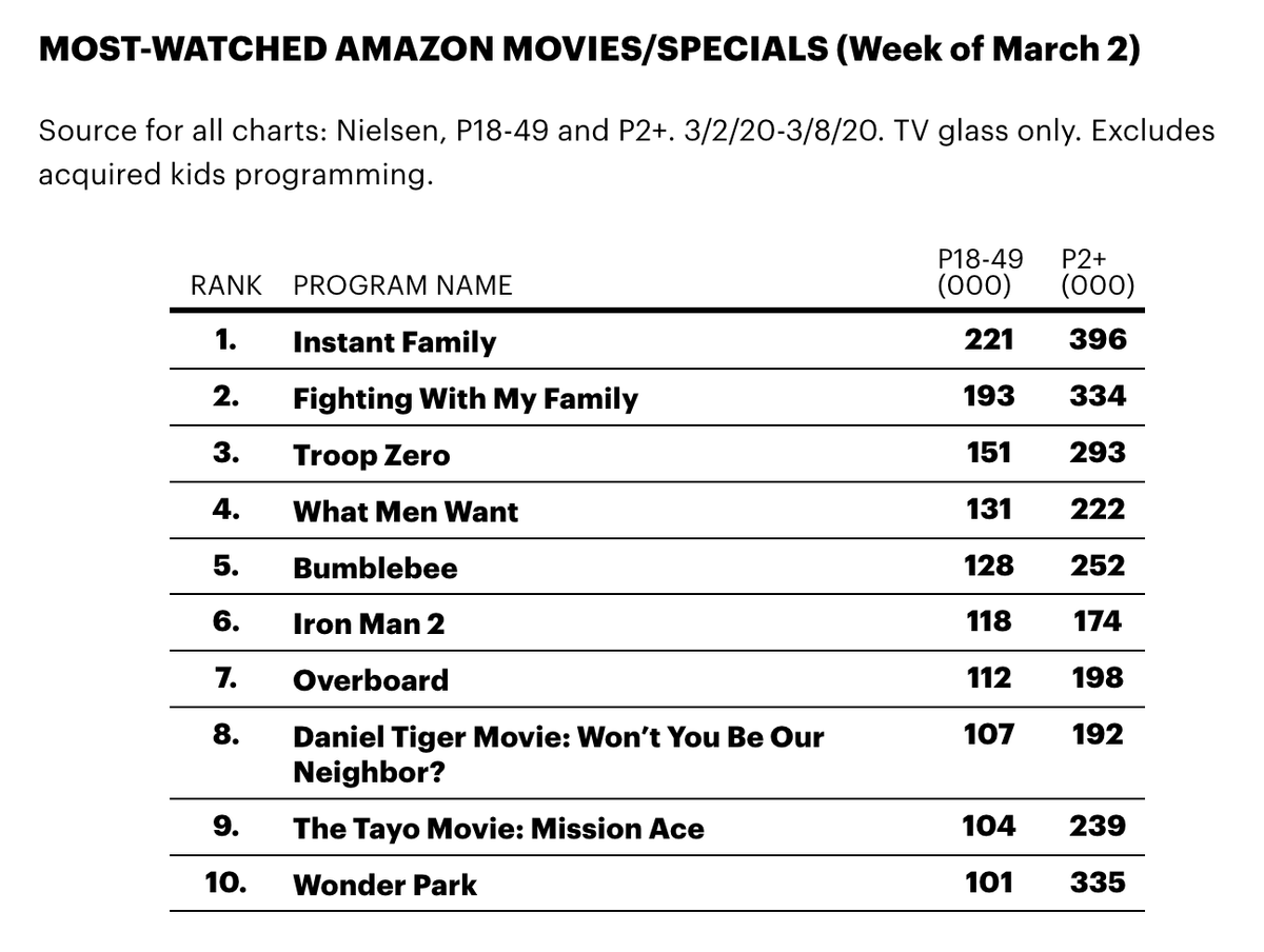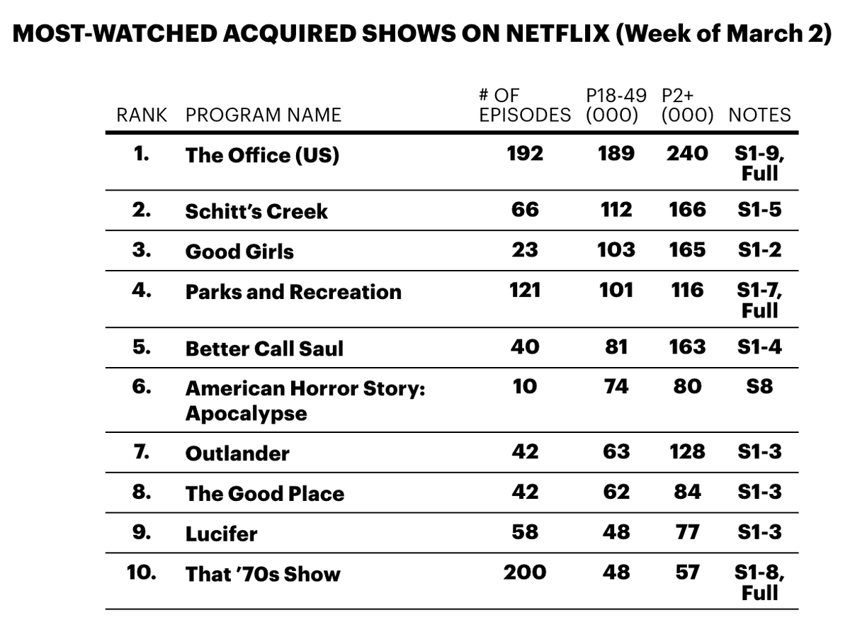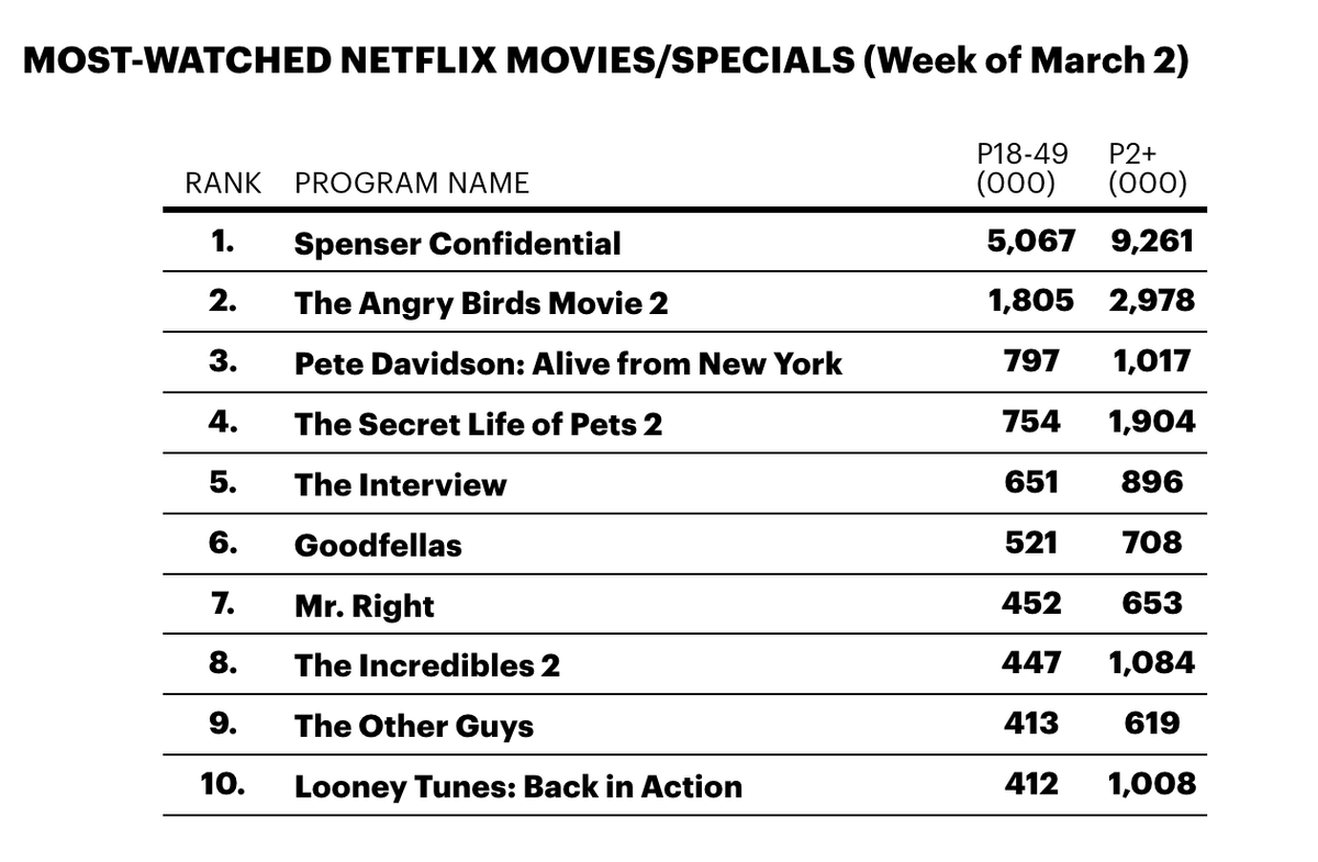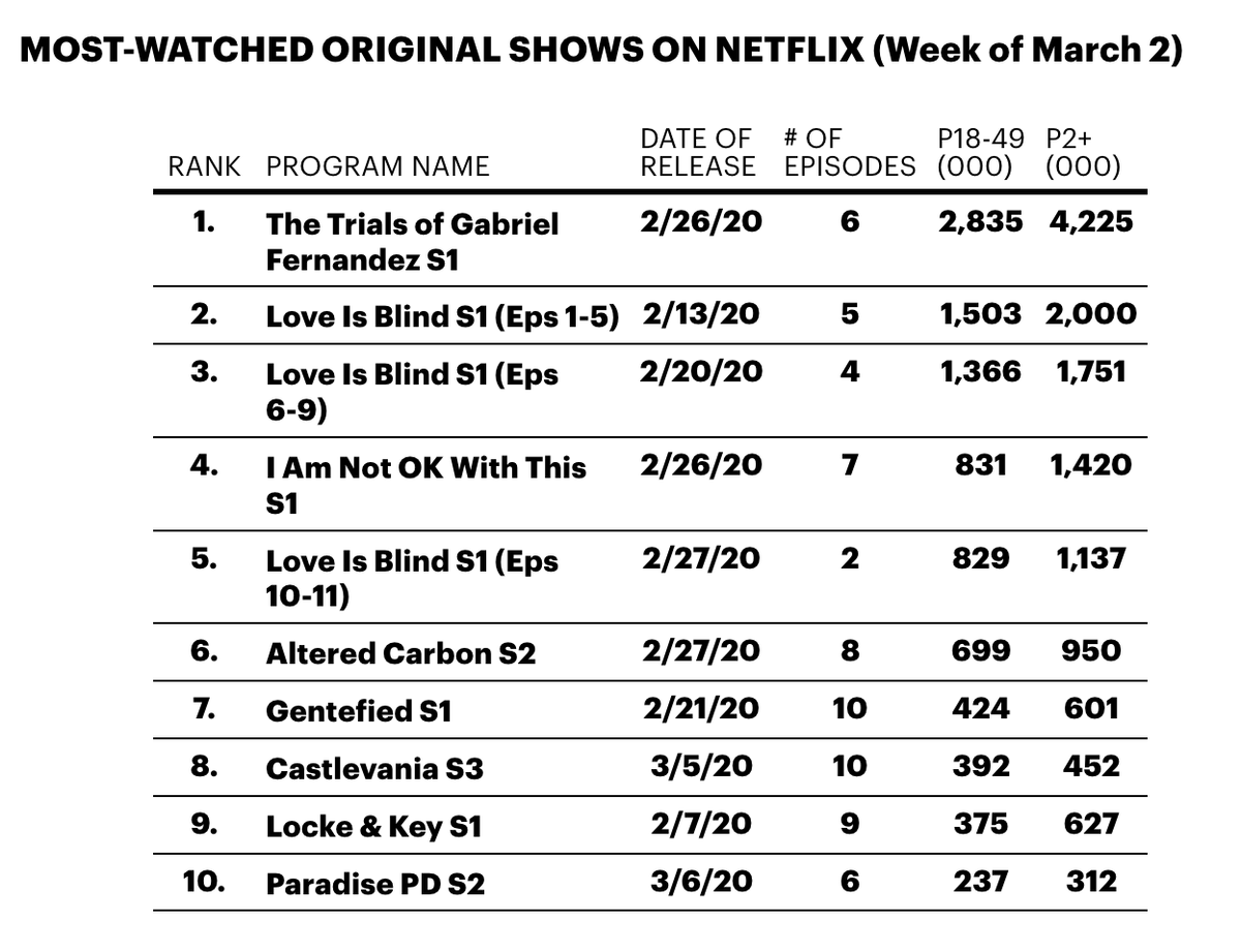 Tra le informazioni degne di nota il fatto che, nonostante gli enormi investimenti sulla programmazione originale, serie su licenza come The Office vadano ancora moltissimo su Netflix. I tre segmenti di episodi in cui è stata suddivisa la serie reality L'amore è cieco è stata vista prima da 1.5 milioni di persone, poi da 1.3 milioni di persone e infine da 829mila persone. Il film originale Spenser Confidential ha invece attirato circa 5 milioni di spettatori nella fascia 18-49, che salgono a 9.2 milioni spettatori complessivi.