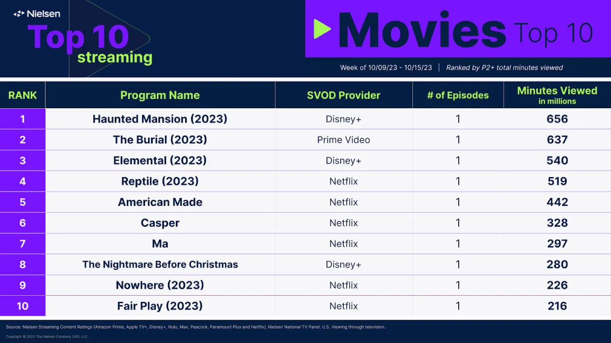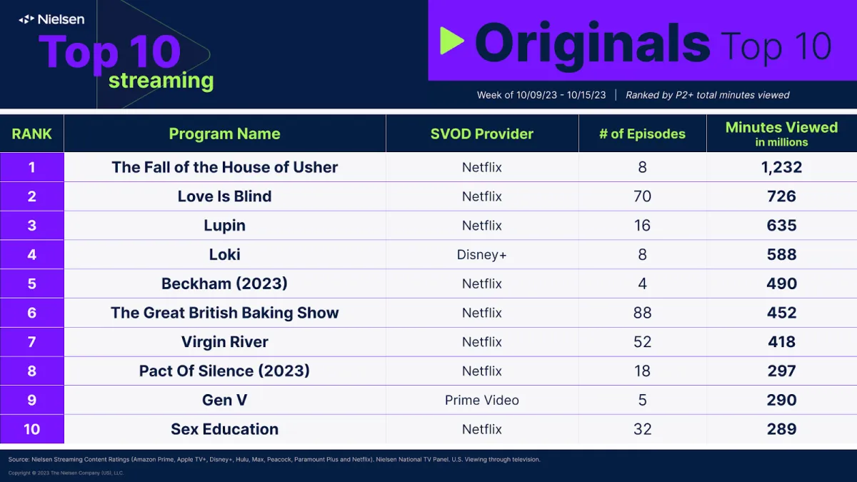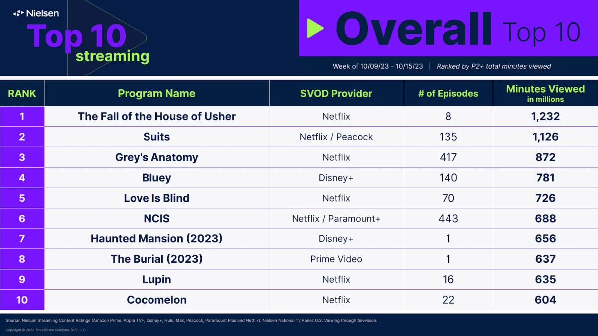 Al 10° posto, come di consueto, compare Cocomelon con 604 milioni di minuti di visione. Di seguito l'elenco condiviso da Nielsen riguardante le classifiche generali dello streaming per il periodo 9-15 ottobre, seguito dai titoli originali in streaming, dai titoli acquisiti e poi dai film: