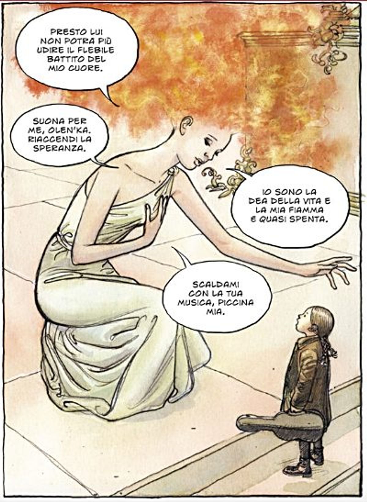 Leningrado, 1941. La vita di Olen'ka viene sconvolta quando i tedeschi assediano la sua città. Per lei, bimba di otto anni, aspirante violinista, è l'inizio di una lotta per la vita. Persi i genitori e il fratellino, trova rifugio nella sua casa sventrata dalle bombe. Qui resiste alla fame, al gelo e alla solitudine suonando il suo violino.Un romanzo storico delineato dalla precisa matita di Nizzoli, si tinge di venature surrealiste grazie alla penna Giovanna Furio. Gli elementi naturali che hanno svolto un ruolo importante nell'Assedio di Leningrado, uno tra i più importanti e drammatici episodi della storia recente, vengono personificati e diventano i protagonisti di questo libro che conquista sin da subito.