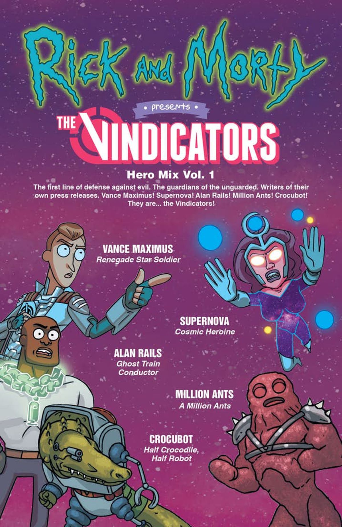 Il primo numero è dedicato ai Vendicatori ("Vindicators" in originale), apparsi nel quarto episodio della terza stagione, che parodizzano diversi celebri gruppi di super eroi, tra cui gli Avengers (a cui si ispira anche il loro simbolo, paradossalmente molto simile a quello utilizzato per anni da Marvel Italia per i veri Vendicatori), i Guardiani della Galassia (da cui è tratto il titolo della storia, Hero Mix Vol. 1), i Fantastici Quattro, la Justice League, la Suicide Squad e i Teen Titans.