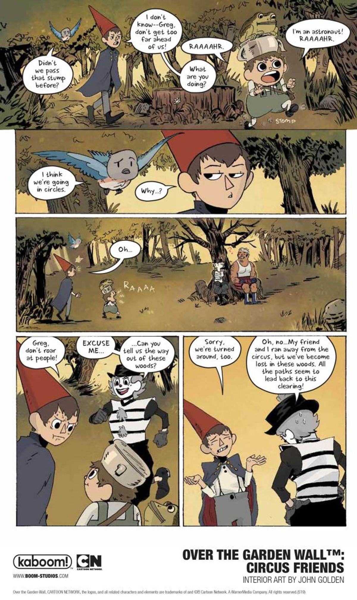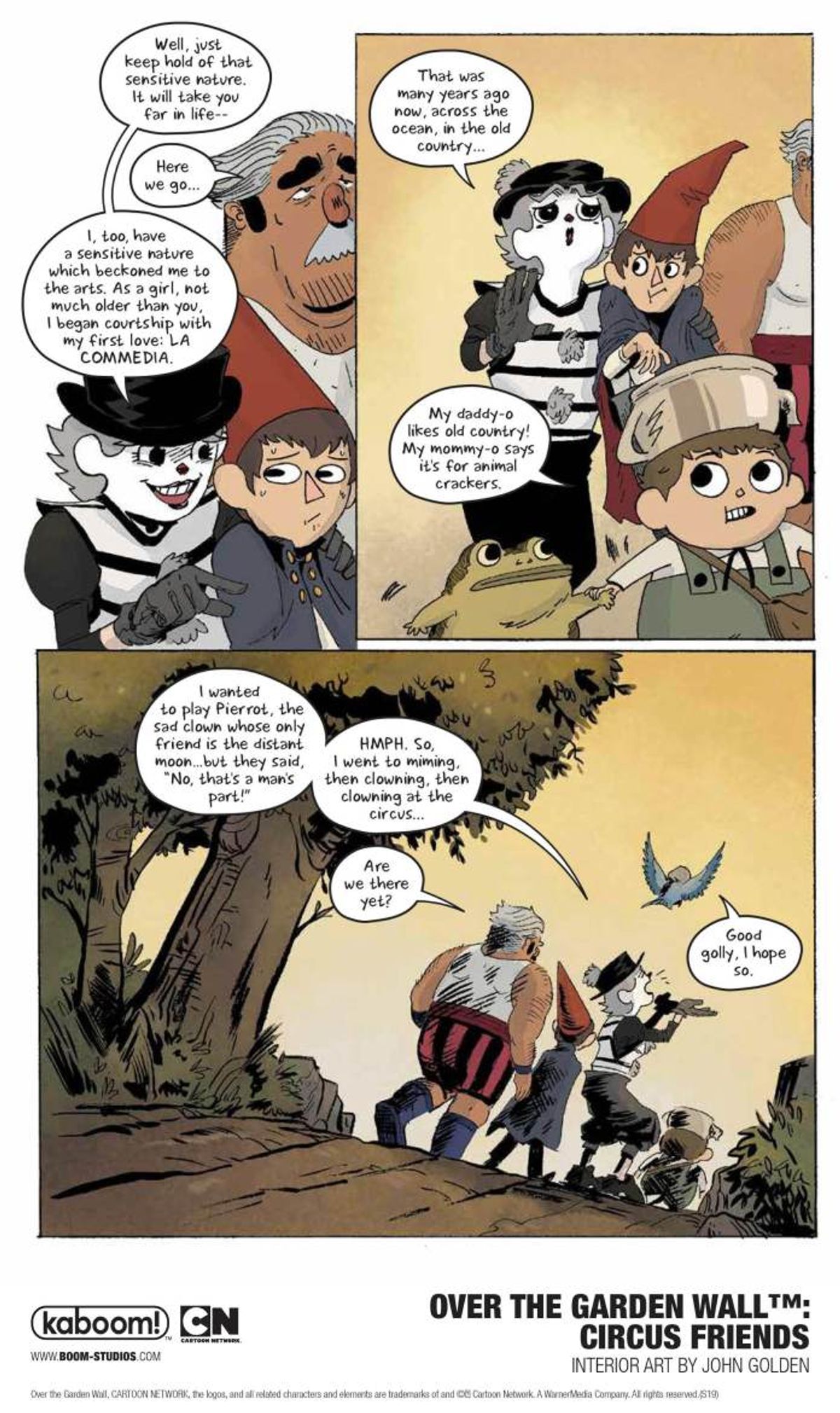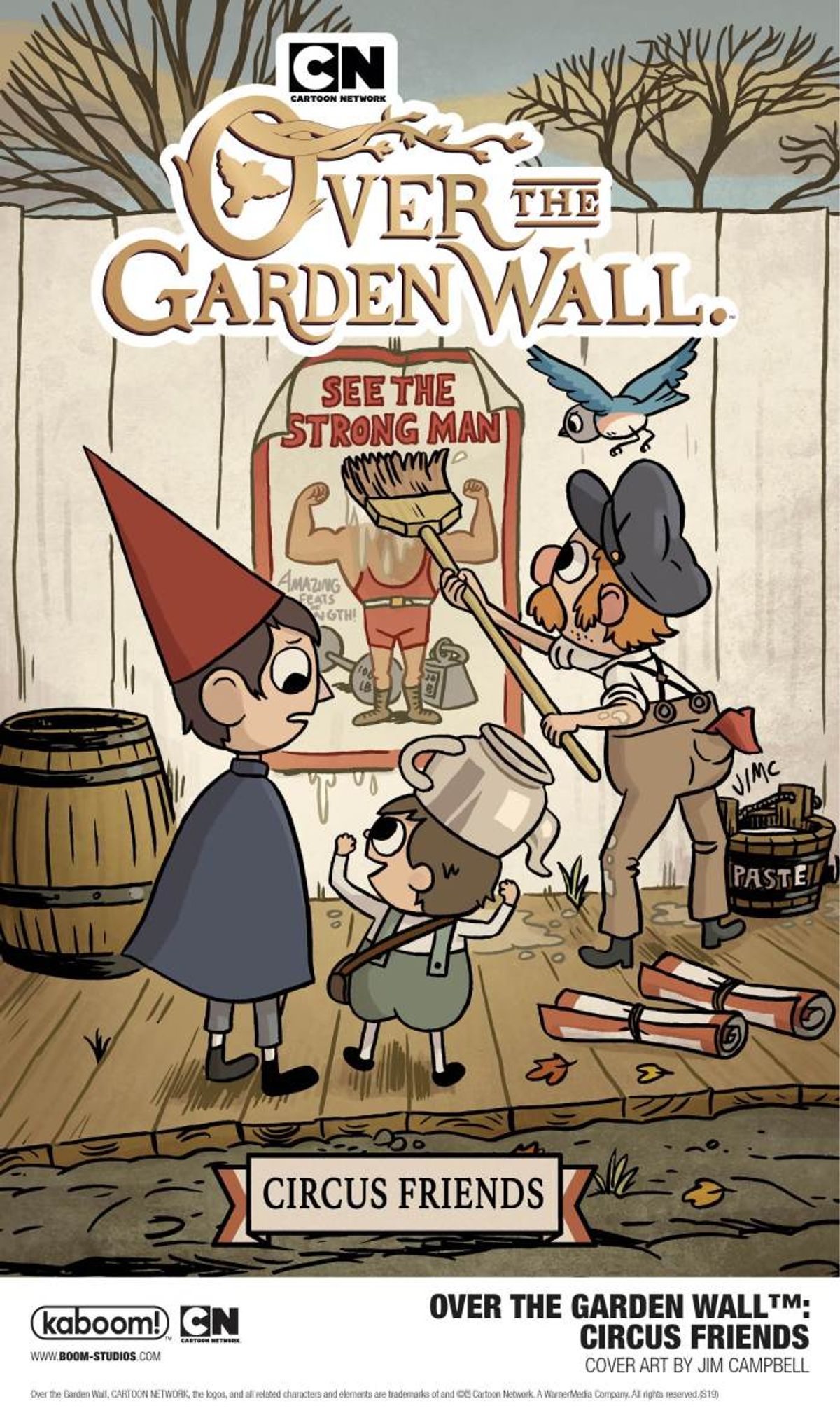 Nella storia, Greg e Wirt incontreranno un uomo forzuto e un clown che hanno lasciato la loro carovana per divergenze creative; con loro dovranno collaborare per salvare Beatrice, tenuta prigioniera dal direttore del circo. Ecco com'è stata presentata la storia dai BOOM! Studios:Di seguito trovate la copertina di Over the Garden Wall: Circus Friends disegnata da Jim Campbell (Over the Garden Wall: Distillatoria) e alcune tavole in anteprima.Quando Wirt, Greg e Beatrice si imbattono in un circo nell'Ignoto, si rendono conto che la vita non è tutta risate e noccioline. L'esperienza inizia in maniera divertente, con Greg che recita la poesia di Wirt al pubblico del tendone, ma presto la situazione si fa pericolosa, perché il direttore del circo ha messo gli occhi su Beatrice per farne la sua prossima attrazione. Wirt e Greg dovranno così collaborare con l'ormai anziano forzuto Federico e la clown depressa Paola per introdursi di soppiatto nel circo e salvare Beatrice.