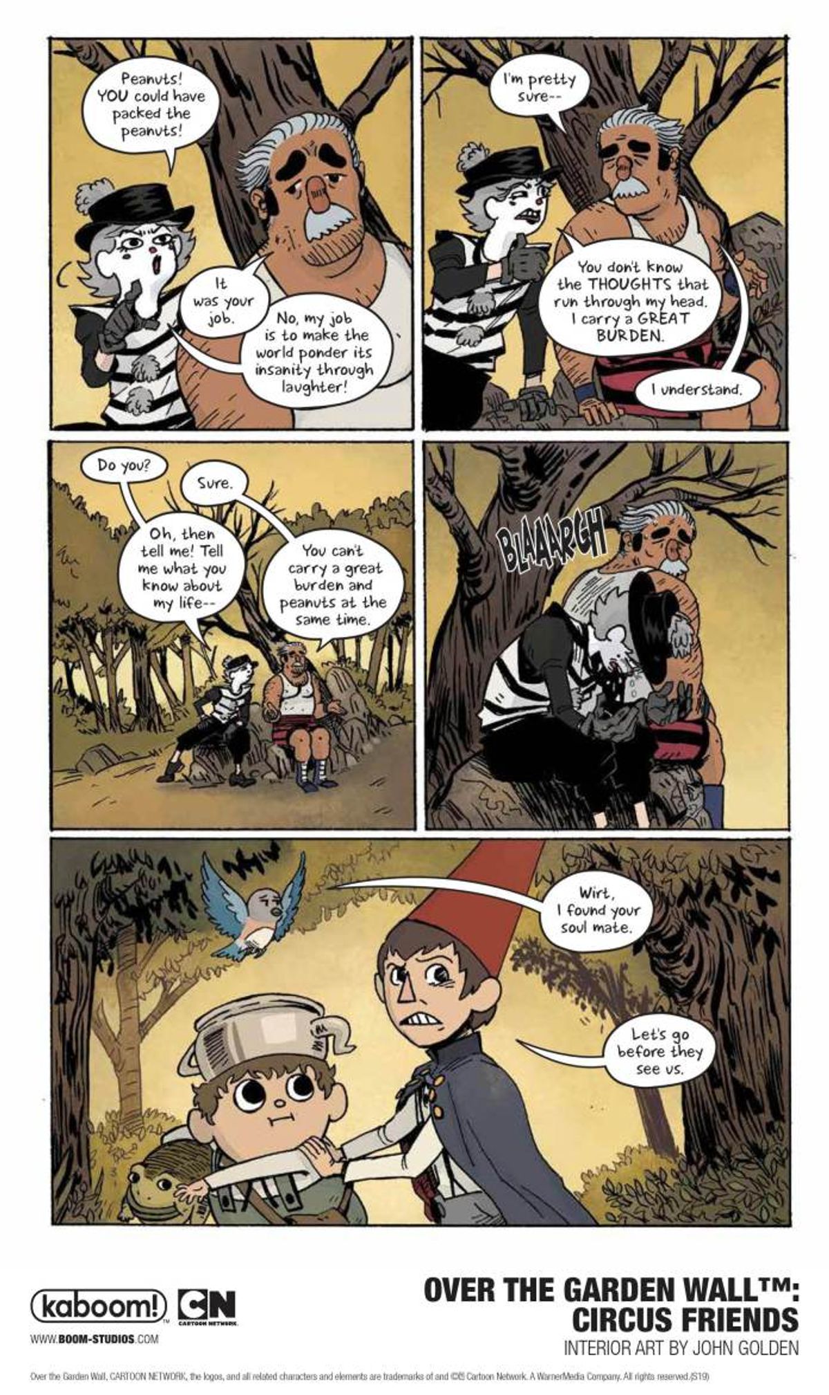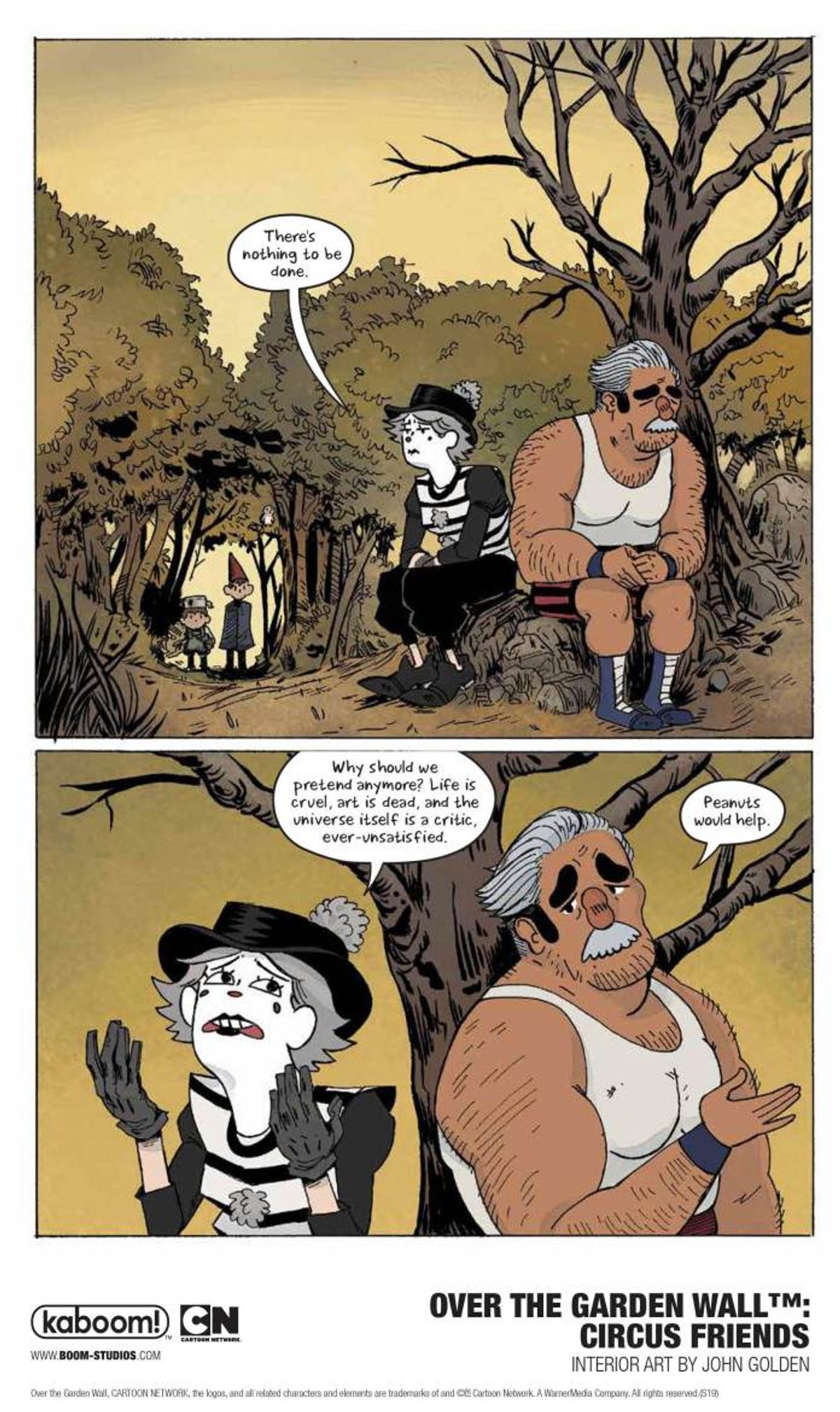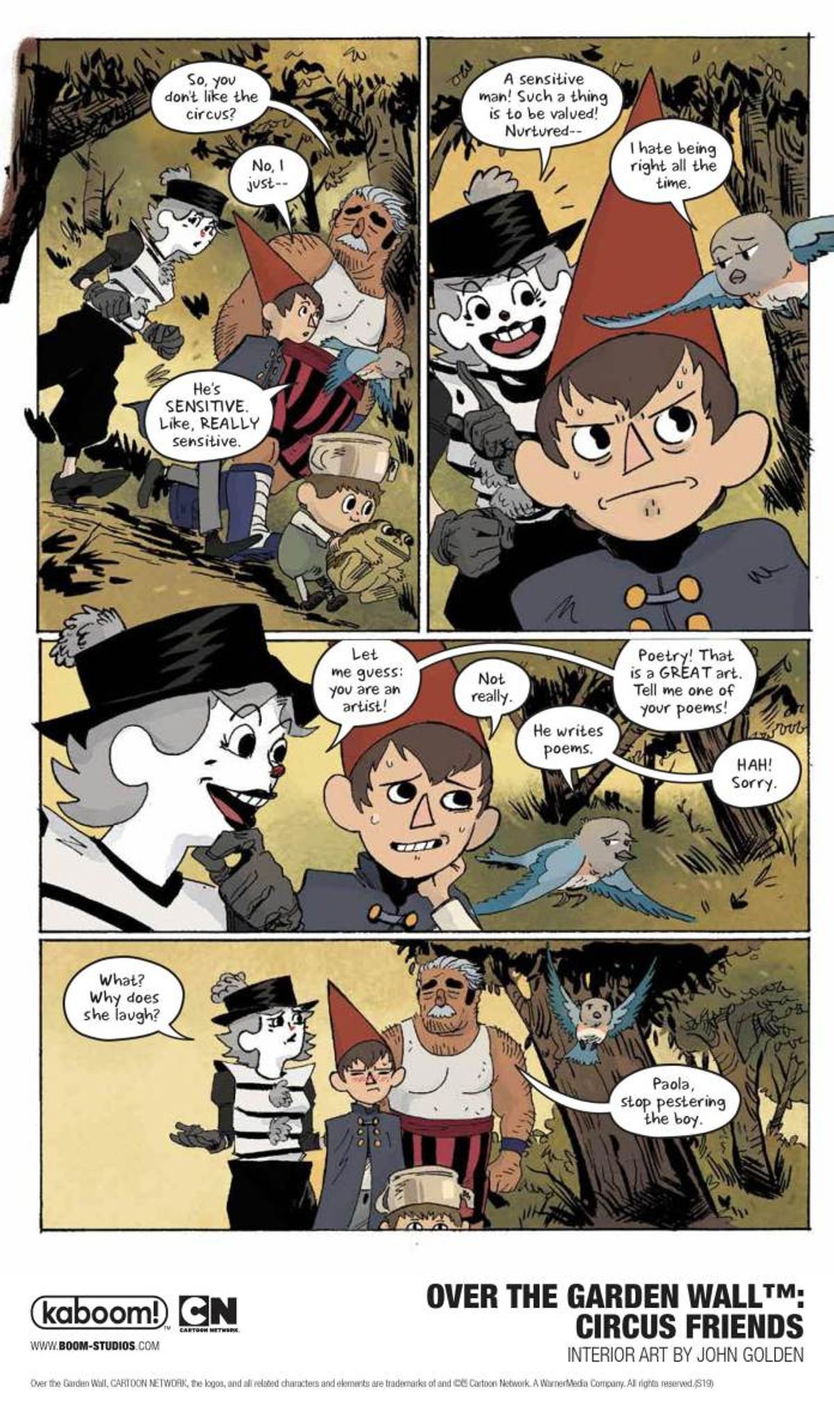 Nella storia, Greg e Wirt incontreranno un uomo forzuto e un clown che hanno lasciato la loro carovana per divergenze creative; con loro dovranno collaborare per salvare Beatrice, tenuta prigioniera dal direttore del circo. Ecco com'è stata presentata la storia dai BOOM! Studios:Di seguito trovate la copertina di Over the Garden Wall: Circus Friends disegnata da Jim Campbell (Over the Garden Wall: Distillatoria) e alcune tavole in anteprima.Quando Wirt, Greg e Beatrice si imbattono in un circo nell'Ignoto, si rendono conto che la vita non è tutta risate e noccioline. L'esperienza inizia in maniera divertente, con Greg che recita la poesia di Wirt al pubblico del tendone, ma presto la situazione si fa pericolosa, perché il direttore del circo ha messo gli occhi su Beatrice per farne la sua prossima attrazione. Wirt e Greg dovranno così collaborare con l'ormai anziano forzuto Federico e la clown depressa Paola per introdursi di soppiatto nel circo e salvare Beatrice.