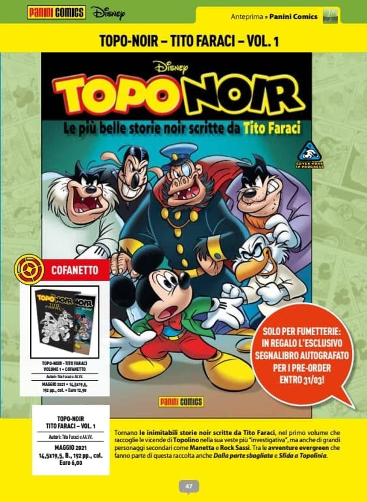 È stata annunciata Topo-Noir - Tito Faraci, nuova collana che raccoglierà le storie investigative dell'apprezzato autore lombardo; il primo volume (14,5 x 19,5 cm, B, 192 pp., col., 6.00 Euro) conterrà storie come Dalla parte sbagliata e Sfida a Topolinia.