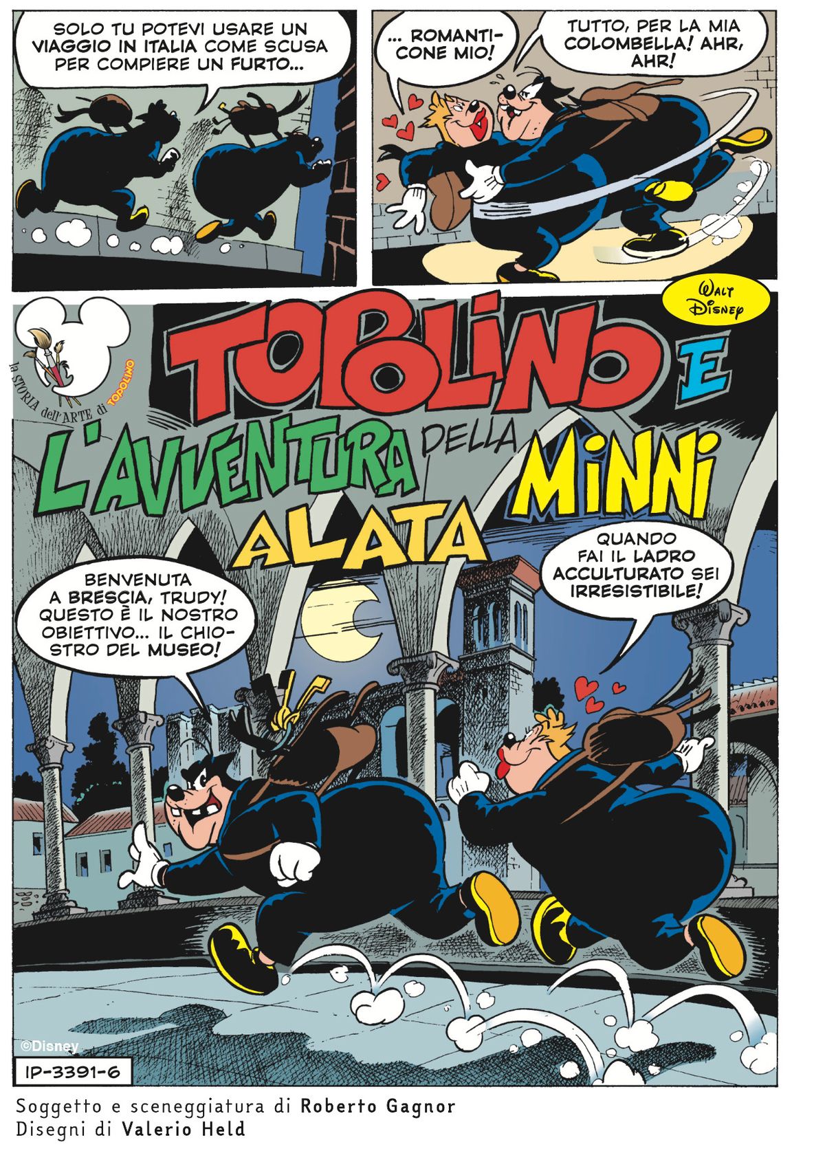 In Topolino e l’avventura della Minni Alata - scritta e sceneggiata da Roberto Gagnor e disegnata da Valerio Held -, Trudy e Gambadilegno entrano al museo di Santa Giulia di Brescia per compiere un furto, ma restano in ostaggio di un ologramma didattico che racconta la storia della preziosa Minni Alata e che farà fare ai due ladri un viaggio nel tempo, dall’antica Grecia, passando in epoca romana fino ad arrivare ai giorni nostri, attraverso i racconti delle peripezie vissute dalla nike. Questo “viaggio nella storia” riuscirà a fermare le cattive intenzioni di Trudy e Gambadilegno?La storia della Minni Alata prende spunto, dunque, dalla Vittoria Alata, una splendida statua di bronzo che ha circa duemila anni, arrivata a Brescia durante l’Impero Romano e rinvenuta nel 1826 nel corso degli scavi archeologici del tempio romano. Il ritrovamento diede una “nuova vita” alla statua, facendosi apprezzare dai visitatori di tutto il mondo e diventando musa ispiratrice di artisti e poeti. E ora, un recente attento restauro ne ha rinvigorito la bellezza, che presto si potrà ammirare in un nuovo e moderno allestimento all’interno del Capitolium di Brescia, ridisegnato da Juan Navarro Baldeweg, celebre architetto spagnolo.