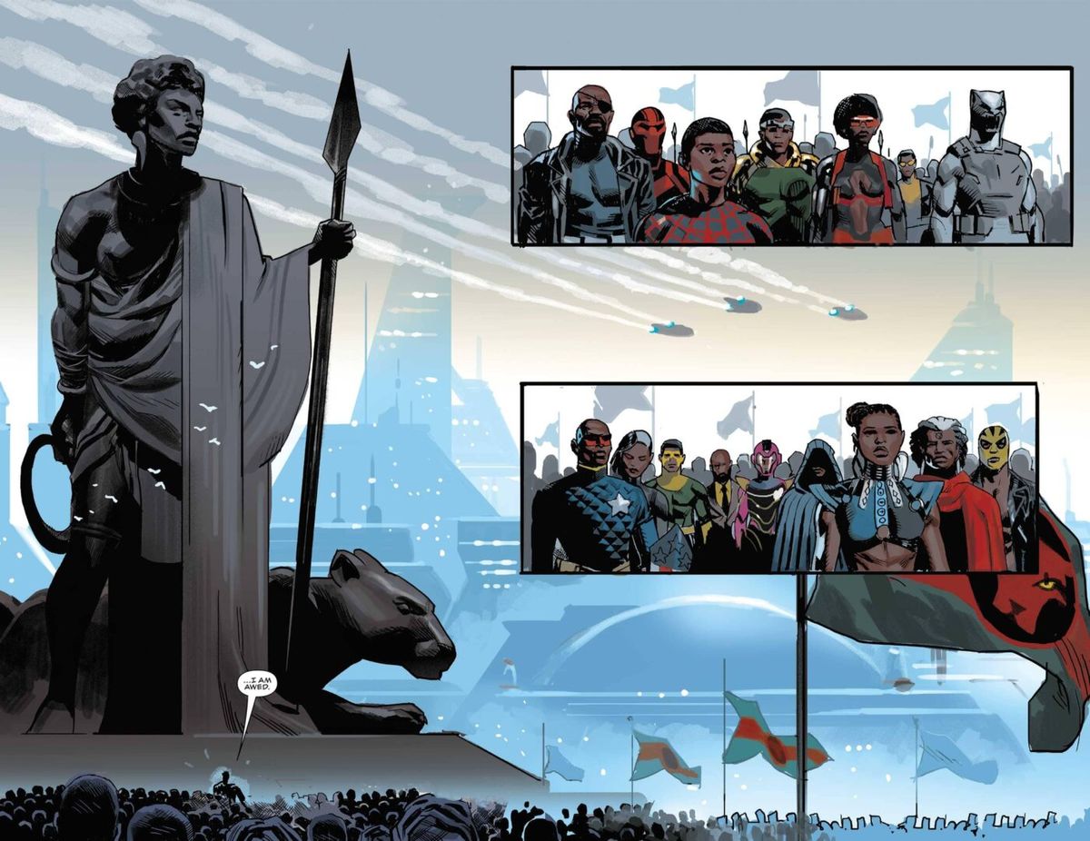 In queste ultime ore, la Marvel ha annunciato che il prossimo febbraio farà il suo ritorno nelle fumetterie statunitensi la serie dedicata a Pantera Nera scritta da Ta-Nehisi Coates. Dopo una pausa lunga quasi un anno dettata dall'emergenza Coronavirus e dalla conseguente riprogrammazione delle uscite operata dalla Casa delle Idee, la testata continuerà la sua corsa con la pubblicazione del numero #23.Come vi avevamo riportato in una precedente news, la celebrata run di Ta-Nehisi Coates su Black Panther sta per volgere al termine e si chiuderà con un albo che per l'occasione avrà una foliazione extra di quaranta pagine. Prima di leggere il finale (atteso sul numero #25) immergiamoci nell'epopea di T’Challa, pronto a tornare in Wakanda dopo essere stato impegnato in un viaggio nello spazio e aver conosciuto pianeti e civiltà alieni. Alla fine di questa avventura, Pantera Nera ritroverà il suo regno e reclamerà il ruolo che gli spetta.La Marvel ha diffuso in anteprima alcune pagine tratte da Black Panther #23, numero disegnato da Daniel Acuña e Ryan Bodenheim, insieme alla copertina regular firmata dallo stesso artista spagnolo e quella variant di Julian Totino Tedesco. Le abbiamo raccolte nella gallery in fondo all'articolo.