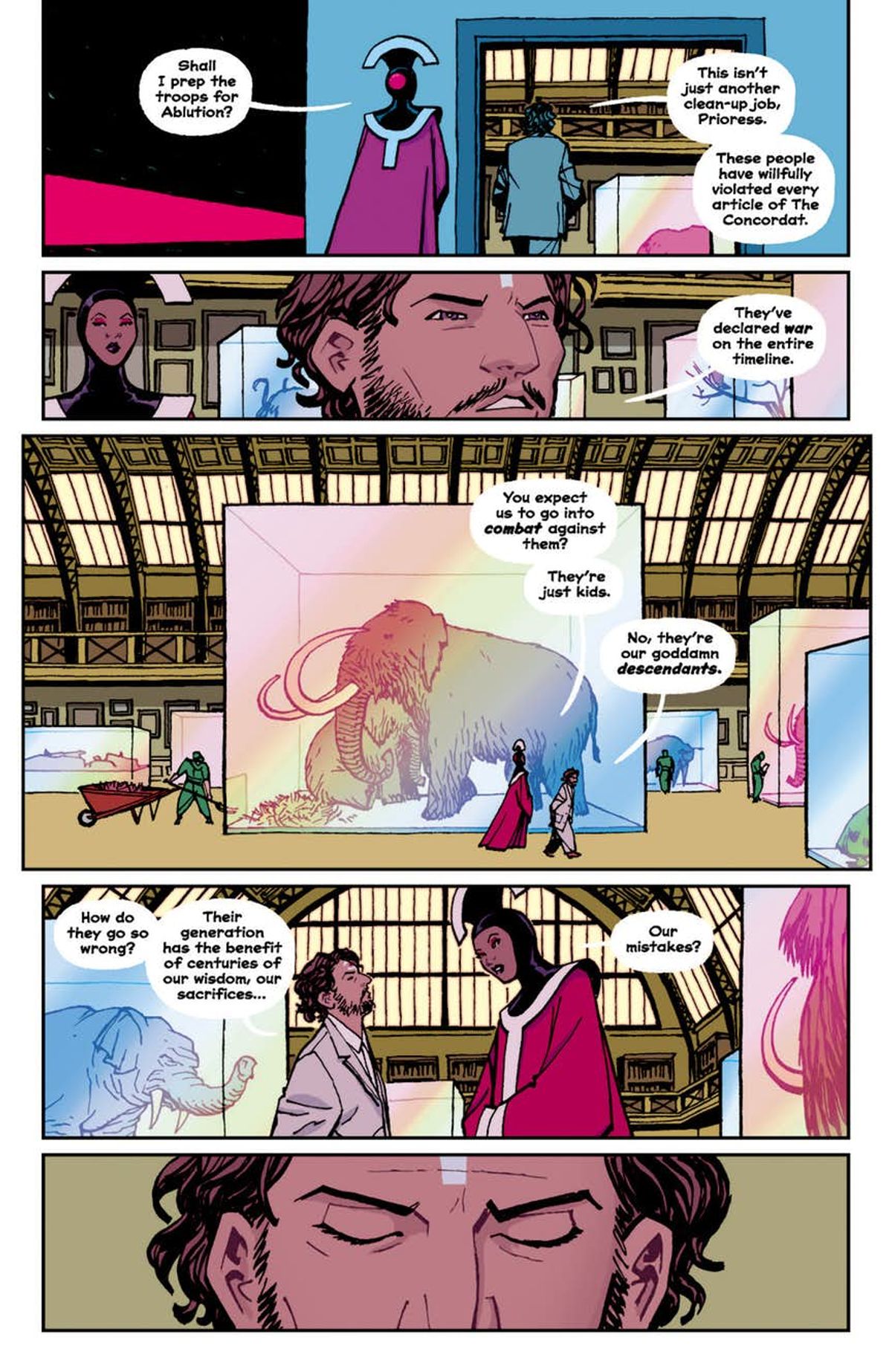 Sono profondamente convinto che il tipo di adulto che ognuno di noi diventa sia stato perlopiù stabilito da quel che era quando aveva dodici anni. Per me e Cliff, tutto è successo negli anni Ottanta. Ma sono anche convinto che i semi siano piantati nella metaforica foresta culturale e politica in cui molti di noi sono perduti al giorno d'oggi. Ecco perché Paper Girls parla così tanto di quel decennio: credo che sia rilevantissimo per il presente e per le persone, che ne siano consapevoli o meno.Chiang - Saltare avanti e indietro nel tempo, che sia nel 1980 o undicimila anni prima di Cristo, mette in prospettiva quel che siamo oggi. Una delle armi più interessanti della fantascienza.