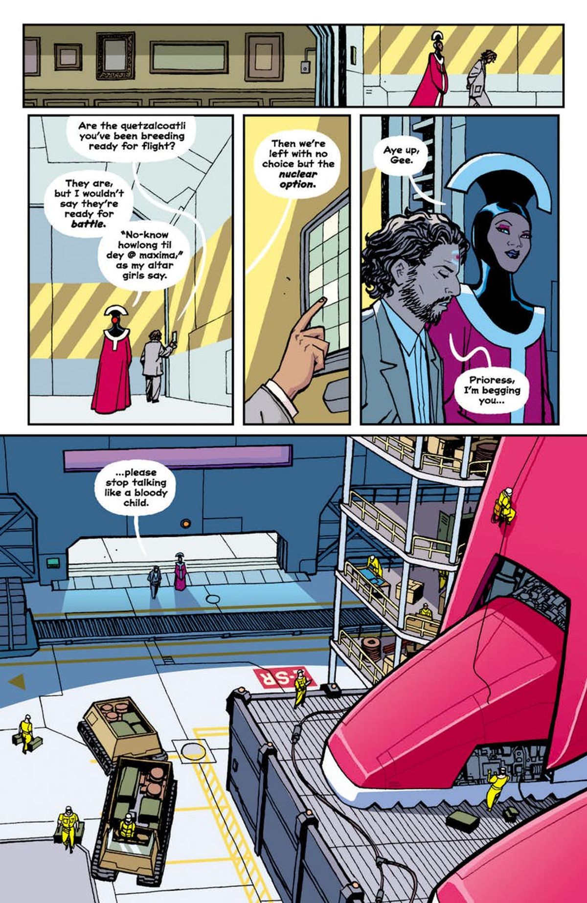 Vaughan - Sin dal primo numero, abbiamo seminato indizi per tutti gli aspiranti investigatori e i fan della crittologia che vogliano risolvere il mistero al cuore della storia. Ma non siamo ignari del gran numero di fan, la maggioranza, che si trovano a essere... diciamo depistati esattamente come le nostre giovani eroine.
