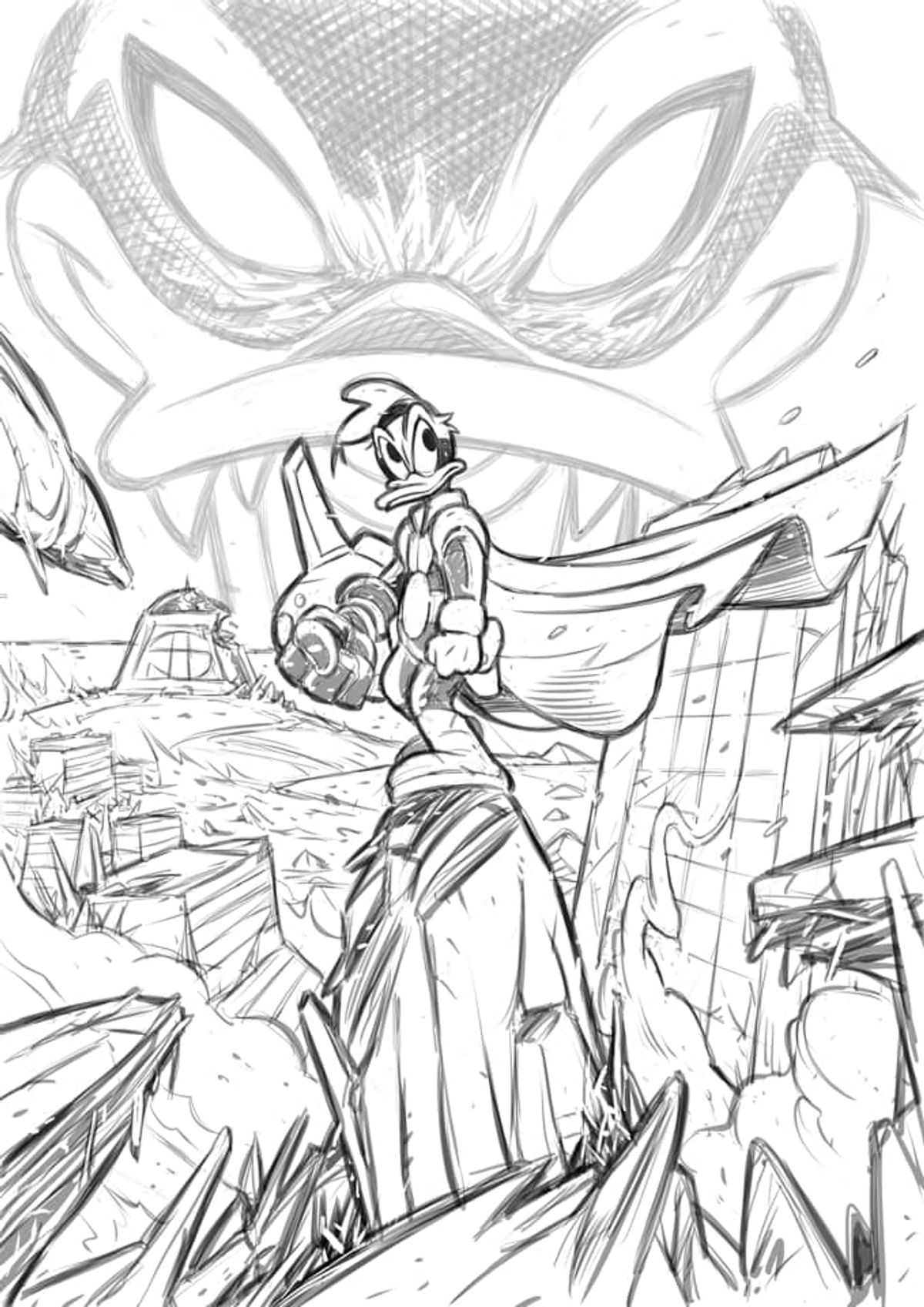 Tocca un'immagine per scorrere la galleriaMa ci sarà un altro volume in uscita nelle prossime settimane: la ristampa de Il marchio di Moldrock, l'ultimo volume della serie Paperinik New Era. Per l'occasione Pastrovicchio ha realizzato un'illustrazione inedita per la nuova copertina, di cui potete vedere qui sotto i vari passaggi.