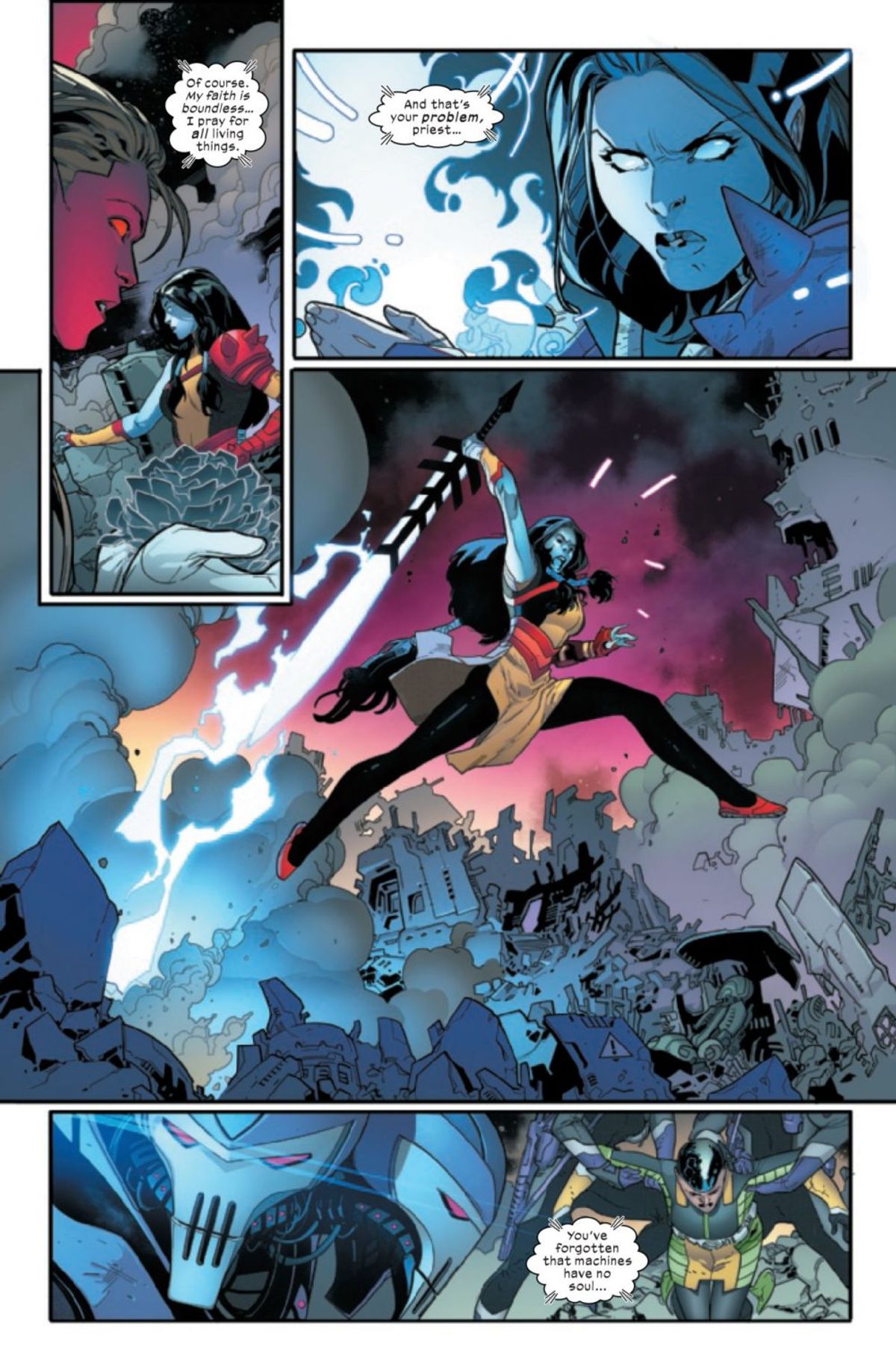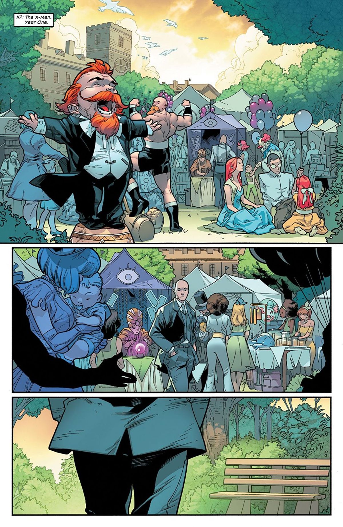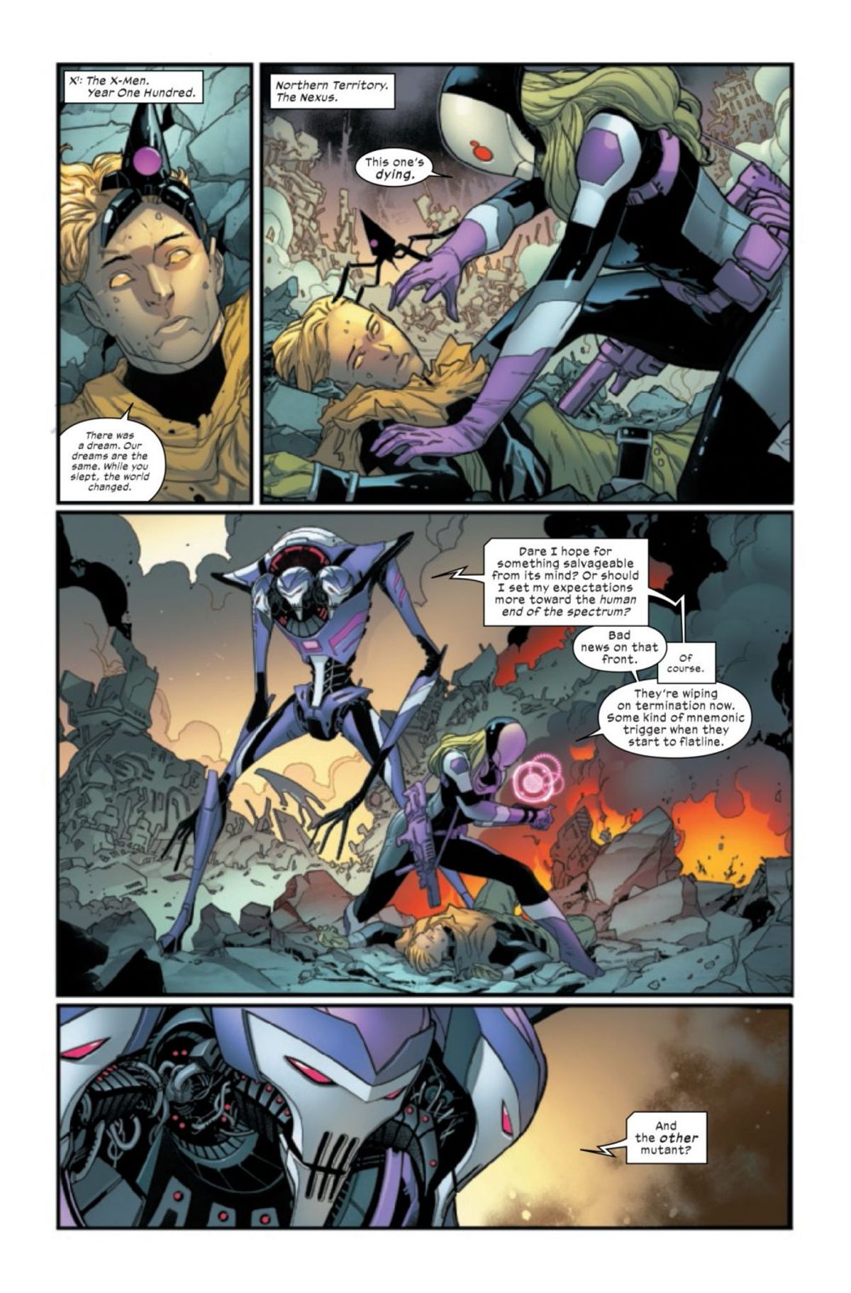 Dopo una breve interruzione, rappresentata dai credits dell'albo, la narrazione passa su un altro piano temporale: X-Men, Anno Dieci, ovvero il periodo in cui sono ambientate le sequenze su Krakoa mostrate la scorsa settimana in House of X #1; tocca poi ad Anno Cento, ossia un secolo nel futuro, dove si svolgono le avventure di Raspuntin e Cardinal, e persino Anno Mille.