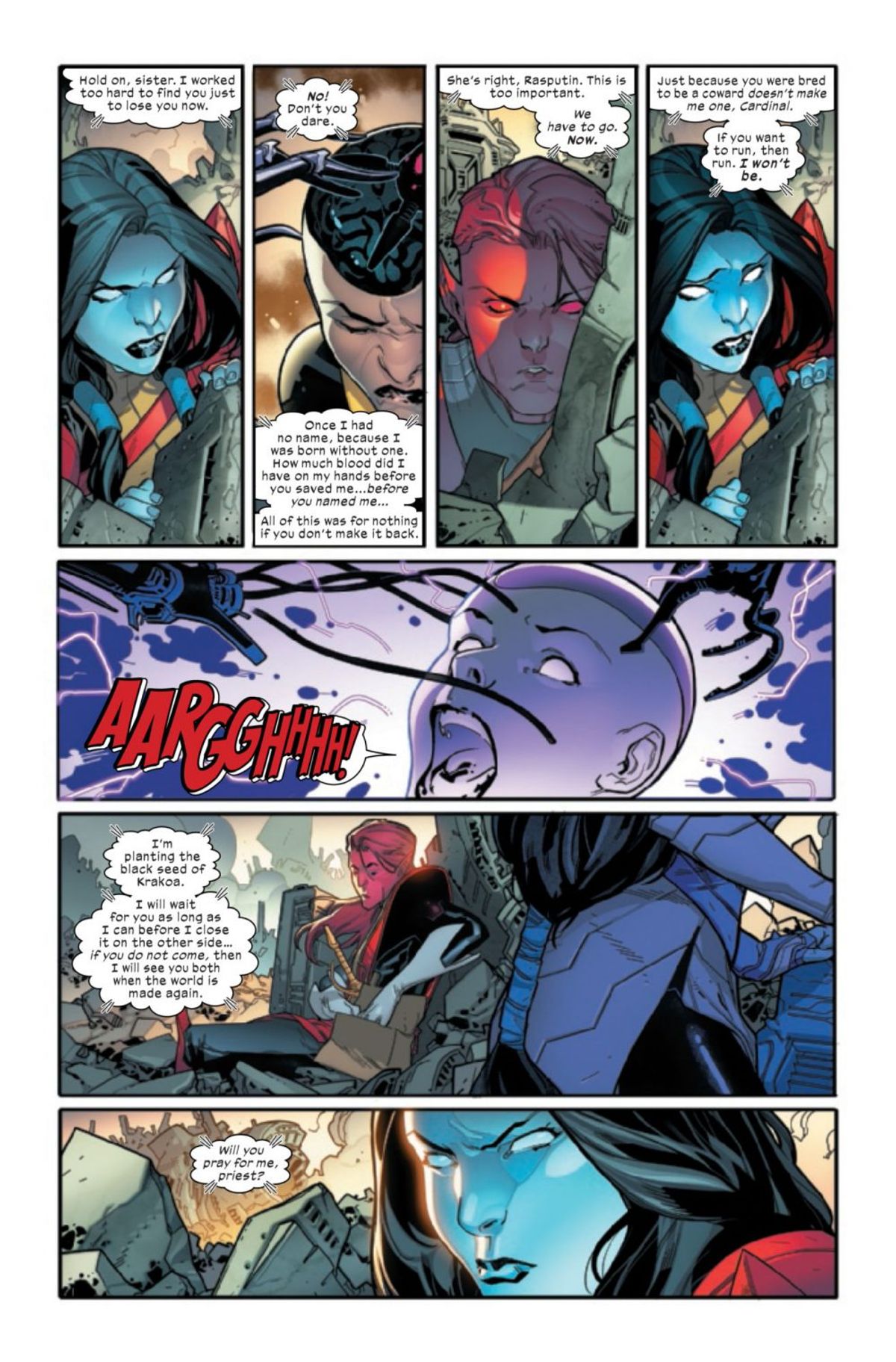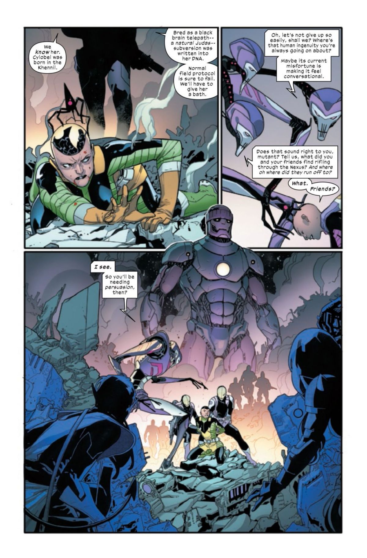 Nell'ultima delle vignette, il Professor X compie il classico gesto di portare indice e medio alla tempia, lasciando intendere che sta utilizzando i suoi poteri telepatici.L'aggiunta del dialogo non cambia il contenuto, ma contestualizzando il testo a quanto accade prima e dopo, sembra che questa sequenza rappresenti davvero qualcosa di molto importante per le sorti dell'homo superior nell'Universo Marvel.