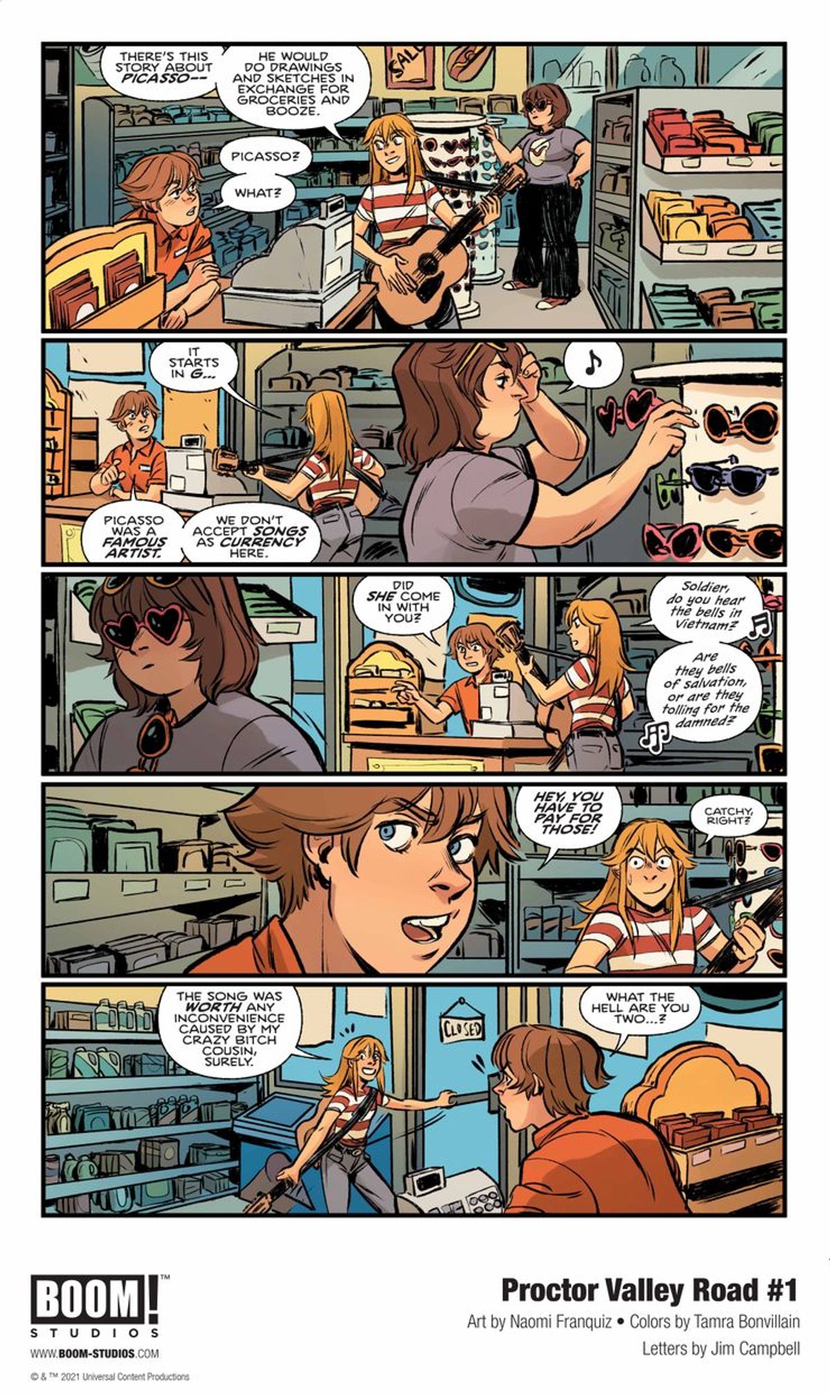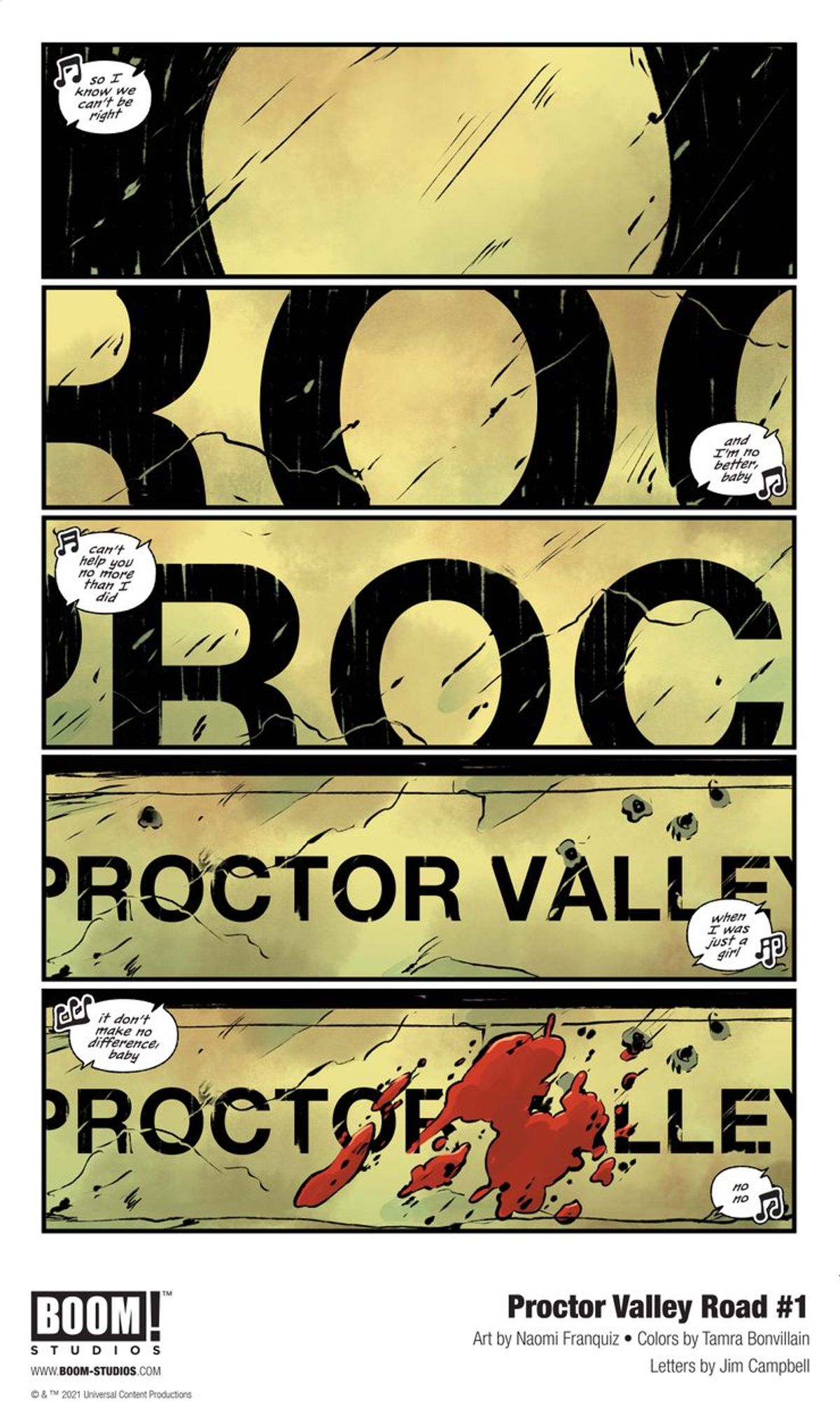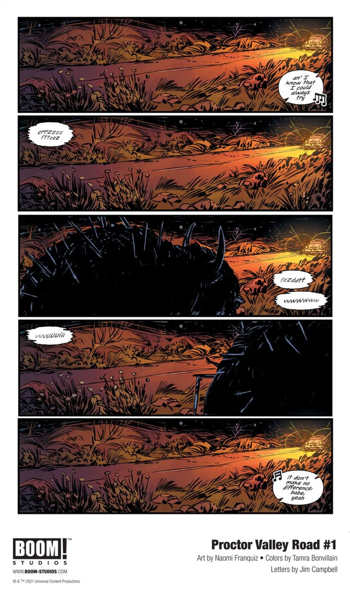 I BOOM! Studios hanno annunciato Proctor Valley Road, una nuova serie horror scritta da Grant Morrison (Batman: Arkham Asylum) e Alex Child (Treehouse) con i disegni di Naomi Franquiz (Misfit City) e i colori di Tamra Bonvillain (Moon Girl & Devil Dinosaur). Il 3 marzo arriverà sugli scaffali americani il primo numero del fumetto, sviluppato in collaborazione con UCP Graphic, un reparto della Universal che si occuperà anche di realizzarne una serie televisiva distribuita su diversi canali e piattaforme streaming.Le protagoniste sono August, Rylee, Cora e Jennie, quattro ragazze che decidono di organizzare uno spaventoso tour lungo questa famigerata strada infestata dai demoni, per raccogliere il denaro necessario per partecipare al concerto dei loro sogni. Durante il percorso alcuni dei loro compagni scompaiono, perciò si troveranno costrette ad affrontare creature mostruose e cercare di scoprire le origini di un'entità malvagia...