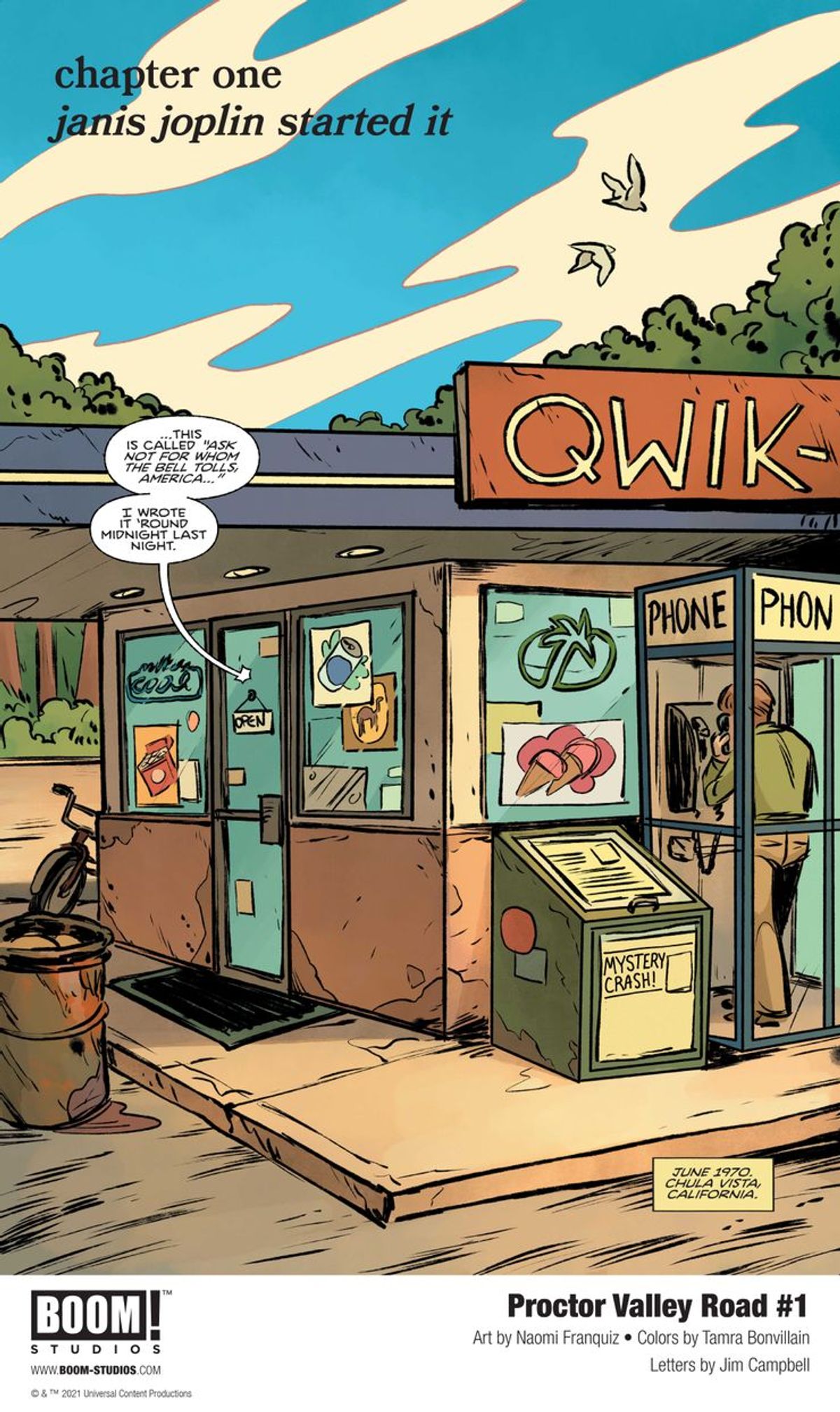 Alex Child - Sono emozionato all'idea di poter collaborare con il potente Grant Morrison e la talentuosa Naomi Franquiz per il mio debutto a fumetti, Proctor Valley Road! Con i postumi degli anni '60 alle nostre spalle, la guerra in Vietnam in corso e la corsa allo spazio che sta scaldando i motori, siamo in una cittadina americana sovrannaturale dove quattro amici, tre atleti mancati e un tratto di strada realmente esistente ci faranno immergere in leggende in grado di far venire i brividi e pulsare il sangue nelle vene. La reputazione, l'amicizia e la vita delle ragazze sono a rischio in questa spaventosa serie d'avventura, nella quale cercano di svelare i misteri e sopravvivere agli incubi di Proctor Valley Road, un luogo che in confronto l'Inferno è Honolulu!Naomi Franquiz - Proctor Valley Road è una grossa fetta di tradizione americana, mescolata con un horror criptico, un po' di ribellione giovanile e una colonna sonora irresistibile.