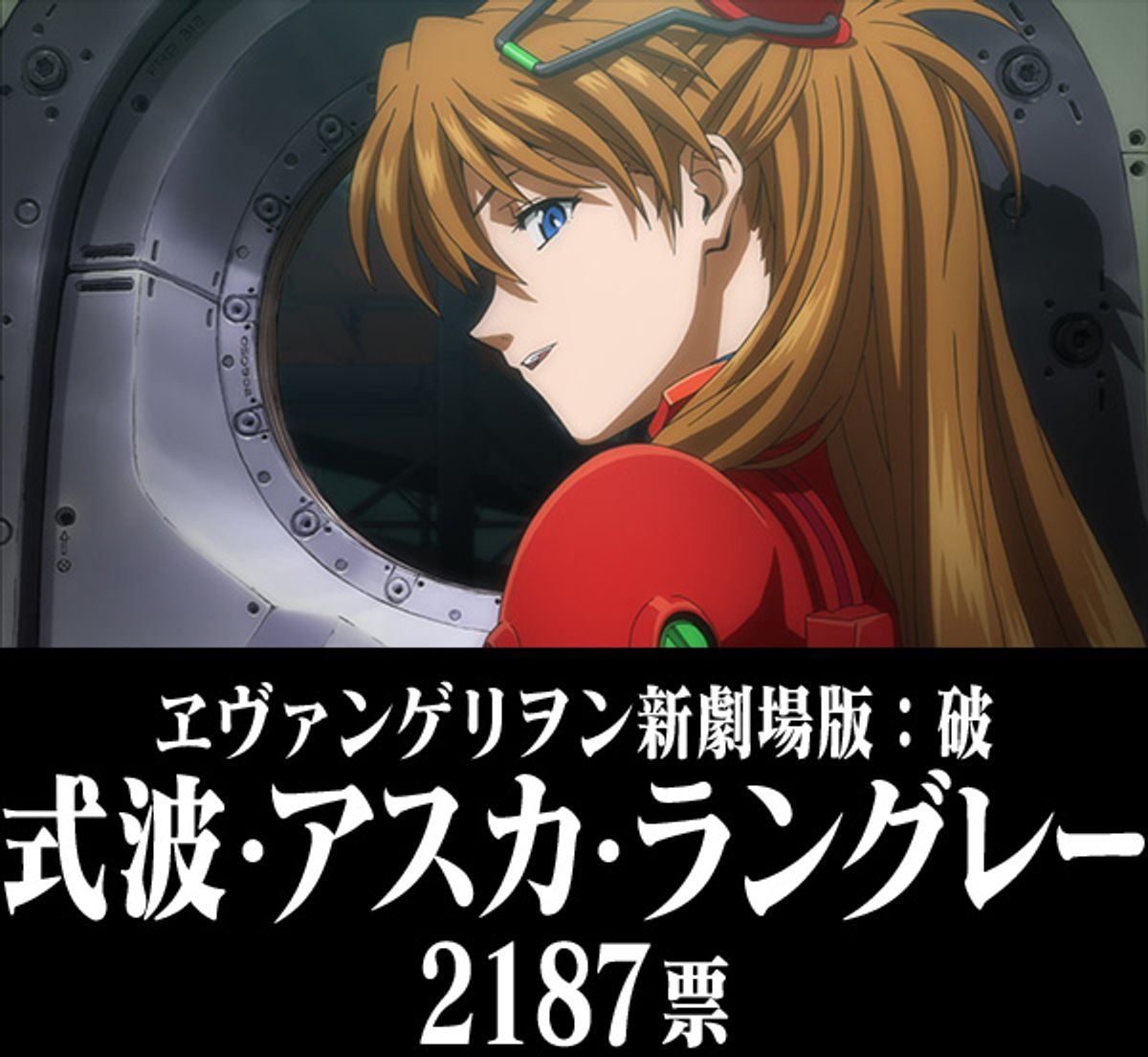 I personaggi votabili erano: Shinji, Rei, Asuka, Kaworu e Mari. Si poteva supporre che la sfida per il primo posto sarebbe stata tra Rei, Asuka e Kaworu, ma quando il numero di voti è stato svelato, nessuno è riuscito a competere con la Asuka di Evangelion: 2.0 You Can (Not) Advance! Al secondo posto, con circa 200 voti in meno, troviamo Kaworu di Evangelion: 3.0 You Can (Not) Redo, seguito da Rei nella sua versione di Evangelion: 2.0 You Can (Not) Advance.