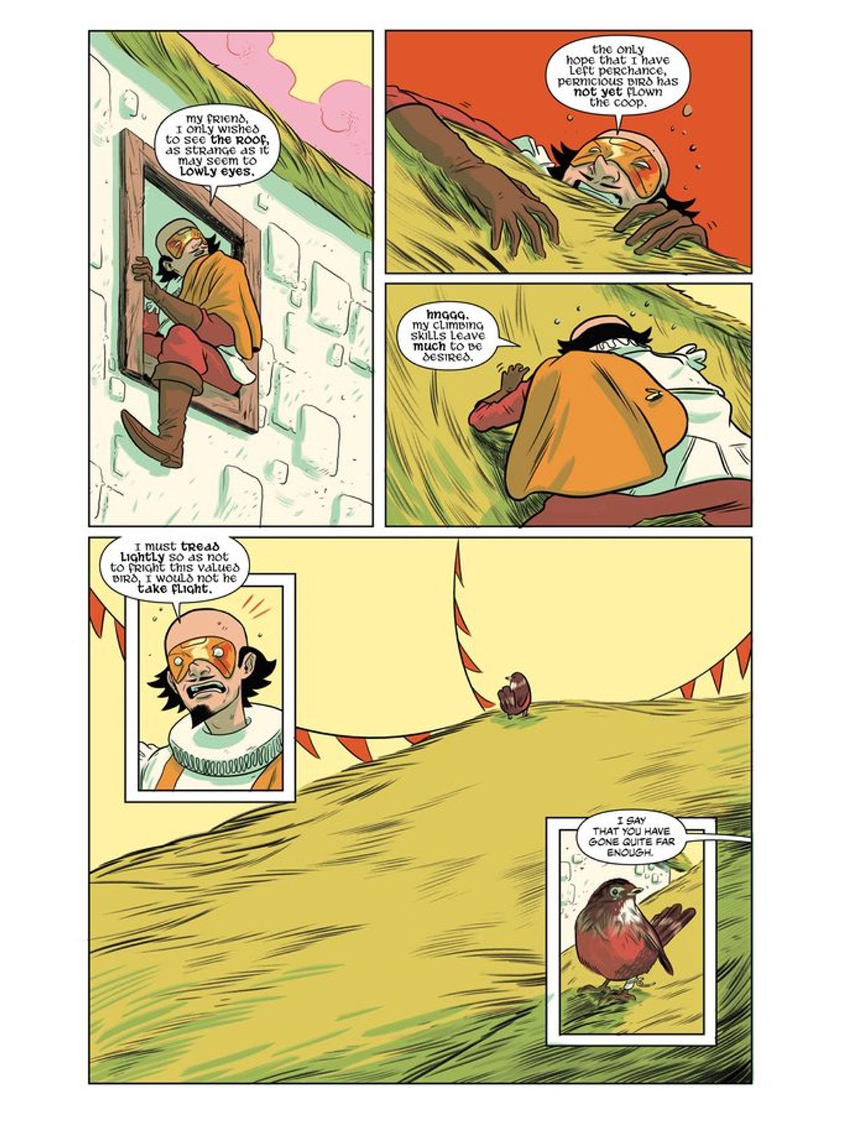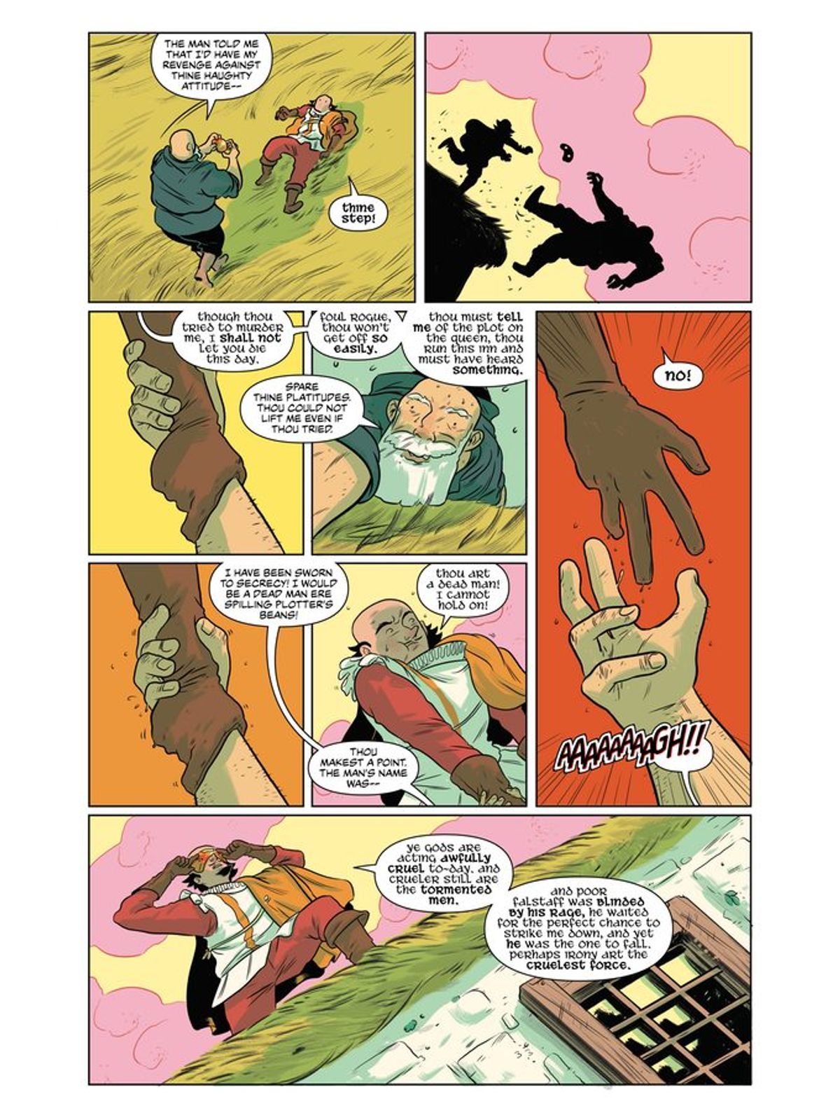 I protagonisti sono William Shakespeare, noto come "il Bardo", e il suo giovane paggio Page (da Le allegre comari di Windsor), impegnati a combattere la criminalità nel XVII Secolo. La loro nemesi è il folletto Puck (da Sogno di una Notte di Mezz'Estate), che ha trasformato i genitori di Shakespeare in asini. Durante le loro avventure incontreranno diversi personaggi provenienti dalle opere del celebre autore di Stratford, ma anche di alcuni suoi rivali drammaturghi, tra epici paesaggi rinascimentali e la leggerezza effimera degli anni '60.I sostenitori del progetto possono scegliere ricompense come vestiti, borsini, spille e adesivi. Purtroppo al momento la raccolta fondi ha totalizzato solo due terzi della somma che si era prefissata quindi, se non ci sarà un sorprendente recupero in queste ultime ore, il destino di No Holds Bard è incerto. Qui sotto potete vedere tre tavole in anteprima.