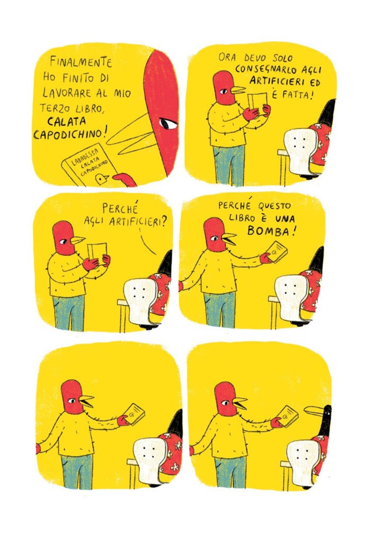 Il giovanissimo autore torna a essere una piacevole conferma: è nato su web e diventato iconico grazie alle inconfondibili vignette su sfondo giallo in cui un uomo-uccello disquisisce, con amici o fra sé e sé, di piccole e grandi questioni della vita, e in più di un’occasione ha saputo strappare non solo tante risate, ma anche qualche lacrima e sicuramente spunti per riflettere. Con quella che è a tutti gli effetti la sua seconda storia inedita (la prima era Mezza Fetta Di Limone, mentre Le Cose Così, prima ancora - suo debutto nel cartaceo sempre con Shockdom, è una raccolta dei suoi migliori webcomics), Labadessa dimostra una maturità sempre maggiore. All’interno del volume, anche una raccolta di vignette.Calata Capodichino è disponibile in fumetteria e libreria dal 24 maggio.
