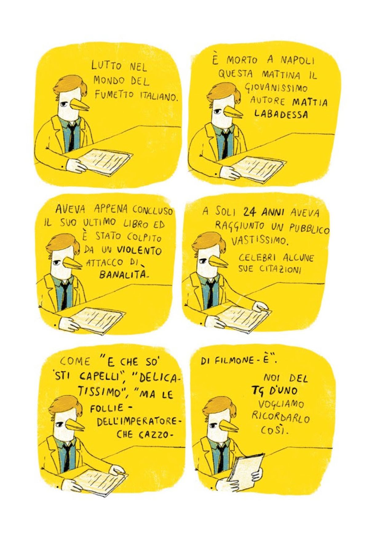 Tocca un'immagine per scorrere la galleriaMattia Labadessa, napoletano classe '93, illustratore e graphic designer. Frequenta l'Accademia Di Belle Arti Di Napoli e ha collaborato con diversi brand italiani ed esteri (degni di nota "Adobe Italia", “Fiftythree", "New Enterprise Associates"). A dicembre del 2015 apre la pagina facebook Labadessa, in origine semplice vetrina dove mostrare i propri lavori, diventata in brevissimo tempo un vero e proprio fenomeno grazie al passaparola dei lettori e alla condivisione dei post pubblicati. Lo stile personalissimo (Labadessa disegna su touch screen direttamente con le dita) e l'uso di colori forti e piatti (nero, bianco e rosso su sfondo giallo), lo rendono iconico e immediatamente riconoscibile. Nel 2016 Shockdom pubblica “Le cose così”, raccolta del meglio della sua produzione online arricchita di alcuni inediti, immediato successo di pubblico e vendita, seguita nel 2017 dall’inedito “Mezza fetta di limone”.