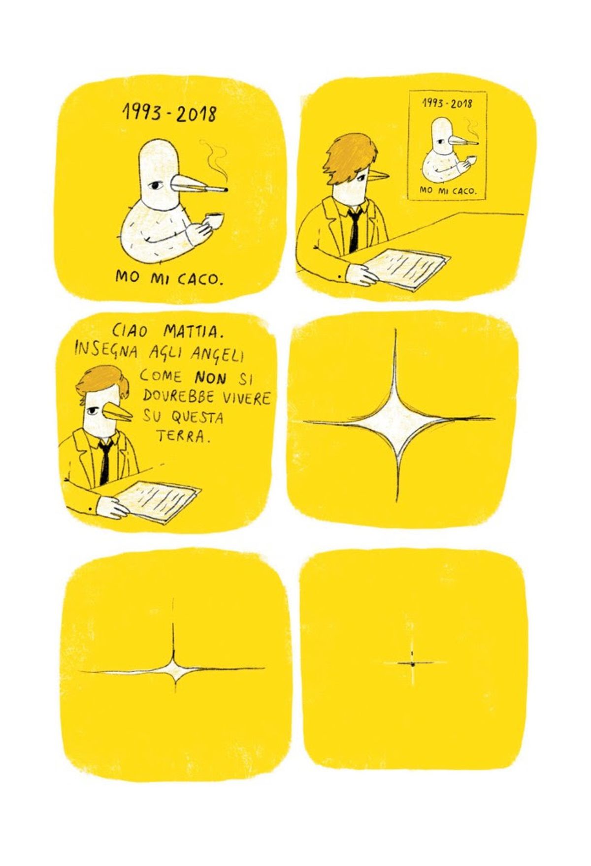 Chiara Zulian, responsabile editoriale Shockdom, aggiunge: “Mattia è conosciuto per le vignette divertenti e sarcastiche che pubblica sui social, eppure nasconde un’anima intimista e malinconica che già si era intravista nel precedente Mezza Fetta Di Limone e che si affina in questo racconto atipico, in questo lungo dialogo interiore del protagonista che, turbato da una rivelazione non richiesta del tassista che lo sta accompagnando all’aeroporto, finisce con l’indagare su se stesso. Nel mezzo del racconto trovano posto quelle vignette di cui parlavo all’inizio, quei momenti di riflessione o divertenti che pubblica senza apparente continuità e che qui trovano la giusta collocazione rendendo finalmente chiaro il disegno completo, come un puzzle a cui uniamo l’ultimo pezzo.Galleria