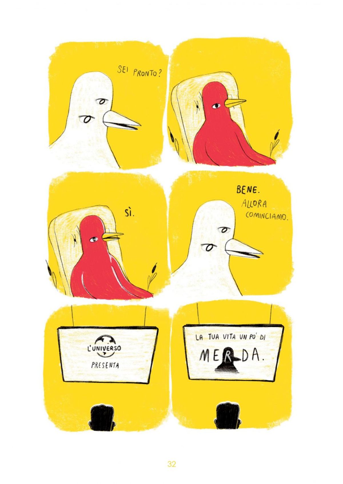 Milano, 25 settembre - Il fenomeno Labadessa nasce su web un paio di anni fa: un personaggio dal corpo umano e la testa di un volatile, rosso e buffo, viene condiviso freneticamente sulle timeline di Facebook di migliaia di utenti in Italia, ogni tavola racconta impietosamente un pezzo di vita che chiunque di noi può aver vissuto. Seguendo le vicende e i momenti di riflessione dell’Uomo Uccello, narrati sull’inconfondibile accecante sfondo giallo, l’Italia intera ride e riflette, a volte si commuove. Labadessa consacra giorno dopo giorno la propria posizione all’interno di un mondo che non è più semplici meme, ma racconti che sviscerano pensieri e paranoie di un’intera generazione.A distanza di un anno dalla pubblicazione della raccolta Le Cose Così, esce il 28 Settembre in fumetteria e libreria la prima vera opera totalmente inedita del giovanissimo autore napoletano, Mezza fetta di limone. Il protagonista è sempre l’Uomo Uccello che, in compagnia dei due amici Franco e Wilson, racconta col suo personalissimo stile una storia fra la fuga da ciò che non conosce e il rifugio nelle certezze racchiuse nella vita di tutti i giorni, certezze piccole ma immutabili, come la mezza fetta di limone nel drink.