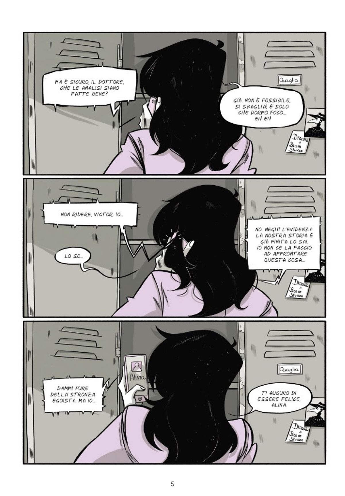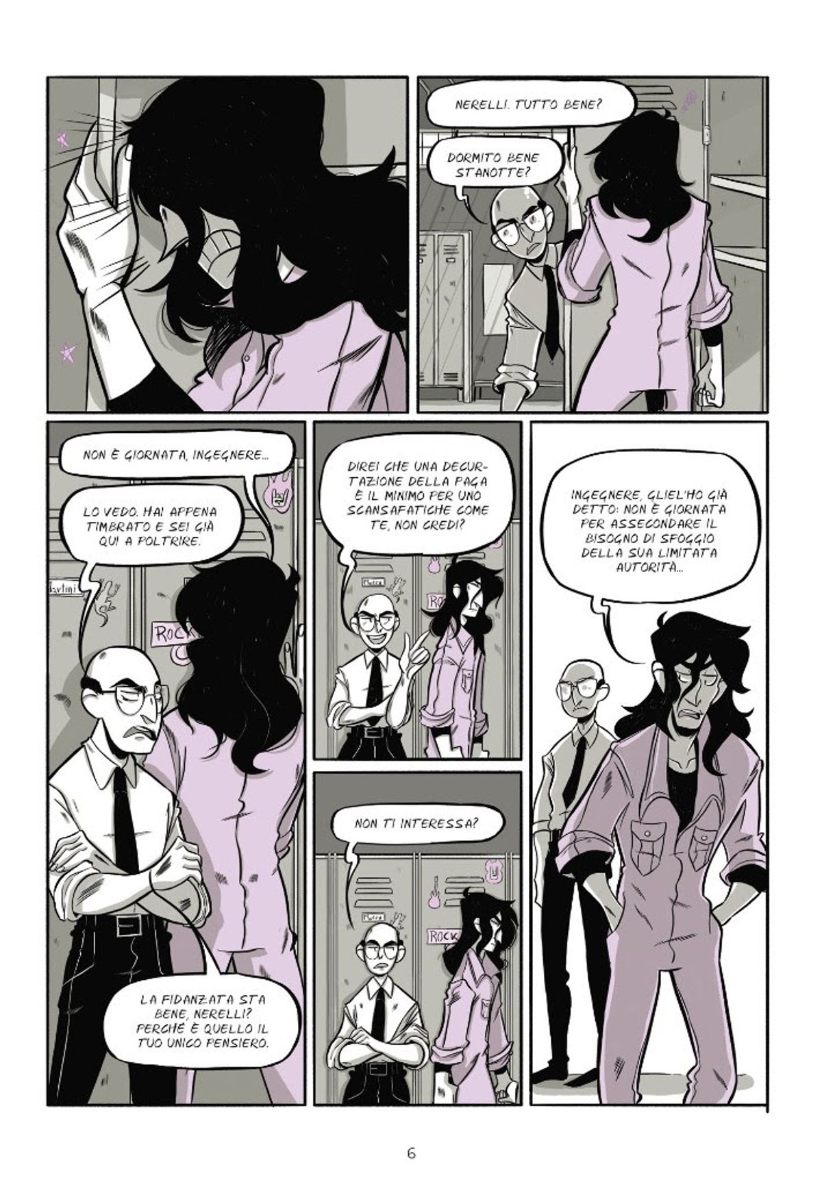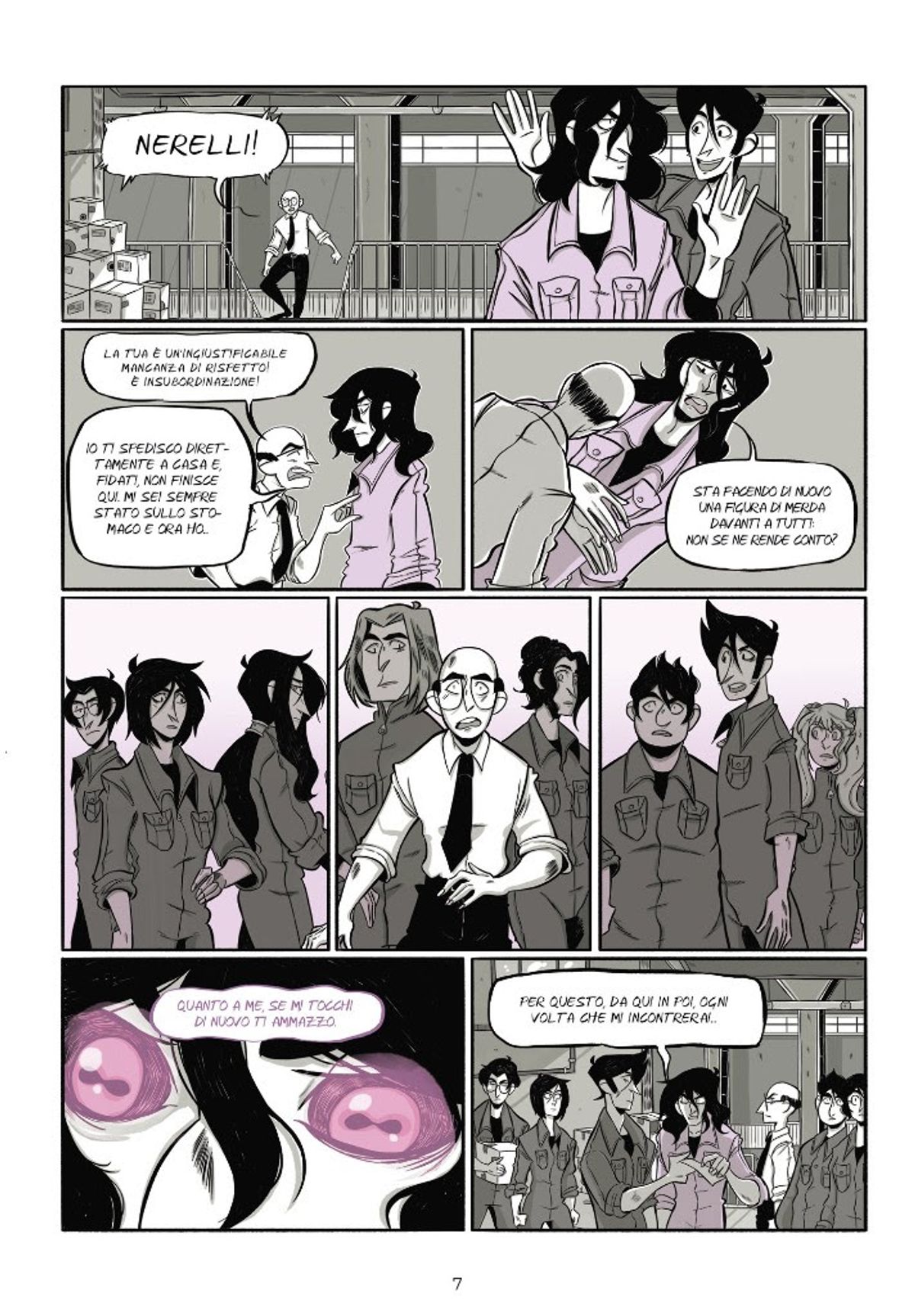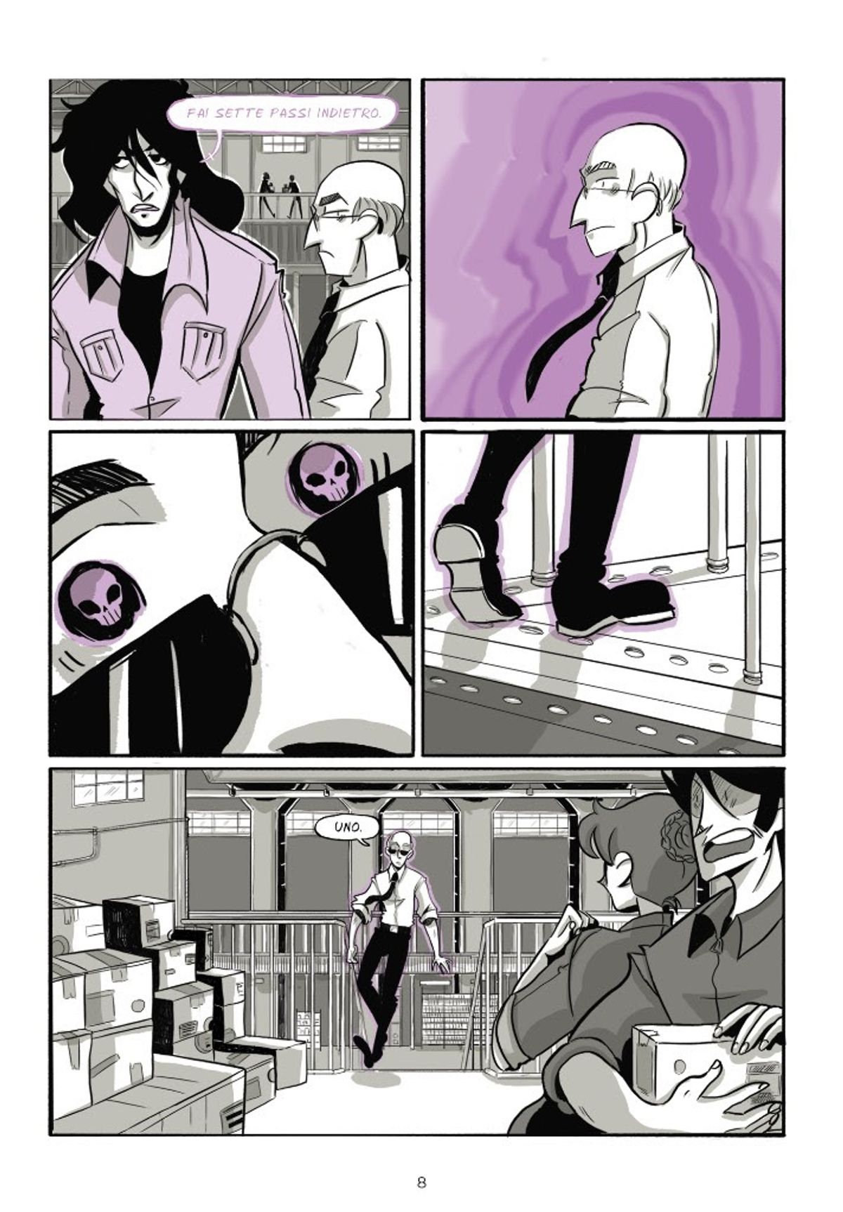 Sinossi: Victor Nero ha trent'anni, lavora nel magazzino di una ditta del petrolchimico e ha un gruppo rock con gli amici. Ma soprattutto ha un tumore, che lo ucciderà entro l'anno. Per uno strano caso del destino, questo male che gli sta togliendo la vita gli dona anche un grande potere: le sue parole infatti riescono a infrangere la volontà di chi le ascolta, diventando azioni, senza passare dal cervello della vittima che quindi non può decidere di testa propria. Elaborato il lutto, gli resta solo da scegliere come vivere i suoi ultimi giorni, decidendo fra diventare il dominatore del suo mondo e rinunciare a tutto per fare sua l’unica donna che pare resistergli.In merito alla struttura complessa dell’opera, la responsabile editoriale di Shockdom Chiara Zulian spiega: “La storia di Victor e di tutti i personaggi che lo accompagnano nella sua ascesa e caduta è una storia difficile, che merita più letture. La bravura di Nebbioso nell’articolare un racconto carico di sofferenza che si dipana tra le varie fasi del lutto è notevole, un racconto che resta in bilico tra il fantastico e il realistico, solo l’uso di poche tonalità di colore ci aiuta a distinguere la dimensione immaginifica dallo stato reale delle cose, di Victor, che ci appare come il carismatico leader degli Strigoi fino a che lui stesso non accetta la realtà della propria terribile malattia e si mostra così com’è: provato dal dolore, stanco ma in pace ormai con se stesso. Marta Quaglia ha infuso nelle tavole la rabbia e la sofferenza di ogni personaggio, dando vita a ognuno di essi con un tratto personale e interessante. SettePassi è una di quelle storie che restano dentro e si fanno rileggere, permettendoci ogni volta di cogliere un nuovo particolare, una diversa chiave di lettura, un significato differente.”