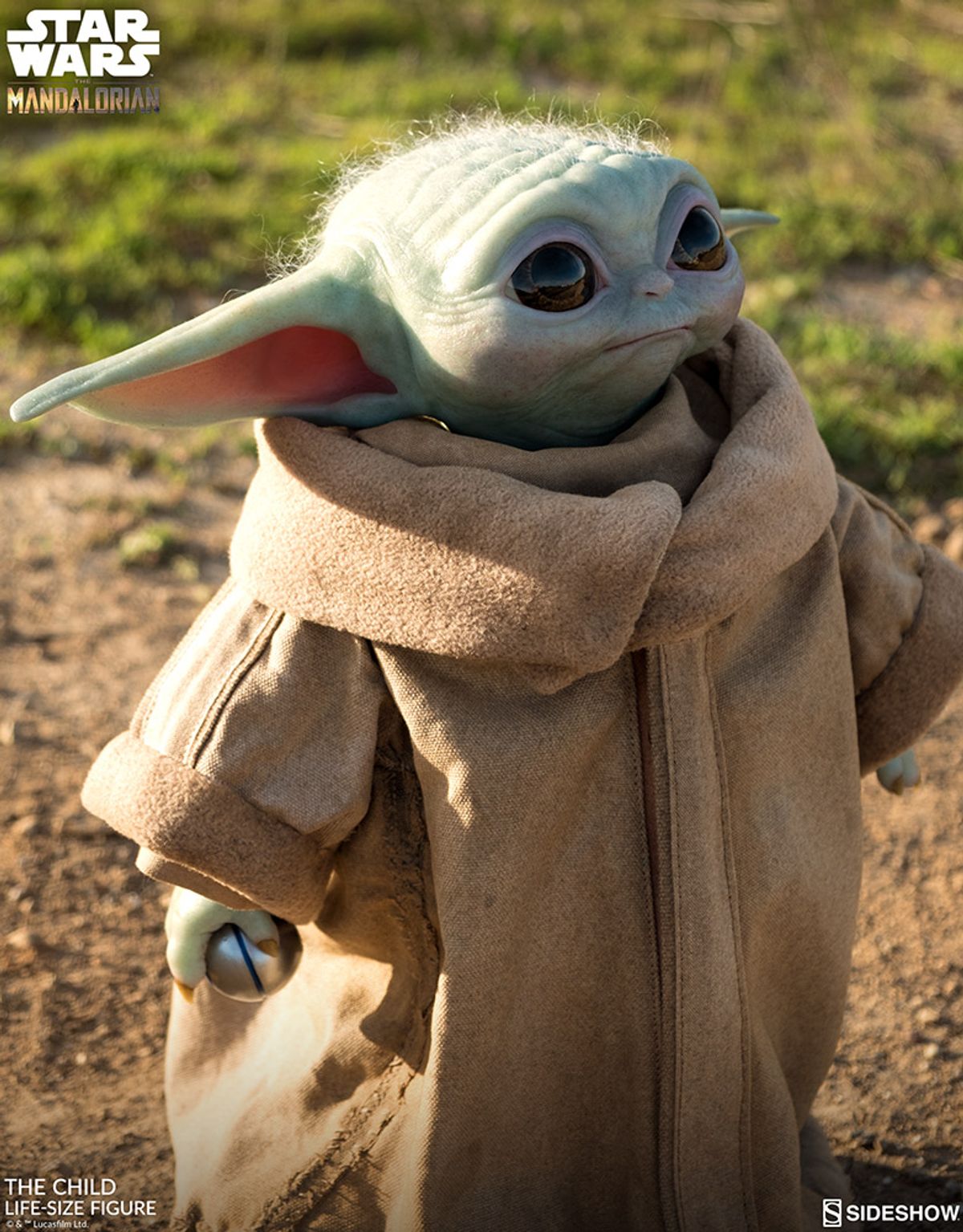 La statua, chiamata ovviamente The Child (Baby Yoda è un nomignolo dato dai fan), è stata creata in partnership con Legacy Effects (che ha sviluppato l'animatronic originale per The Mandalorian) ed essendo in scala 1:1 è alta circa 42 centimetri. Il piccolo alieno, realizzato in materiale plastico e resina, indossa un abito in tessuto e tiene nella mano destra, ovviamente, il pomello della Razor Crest.