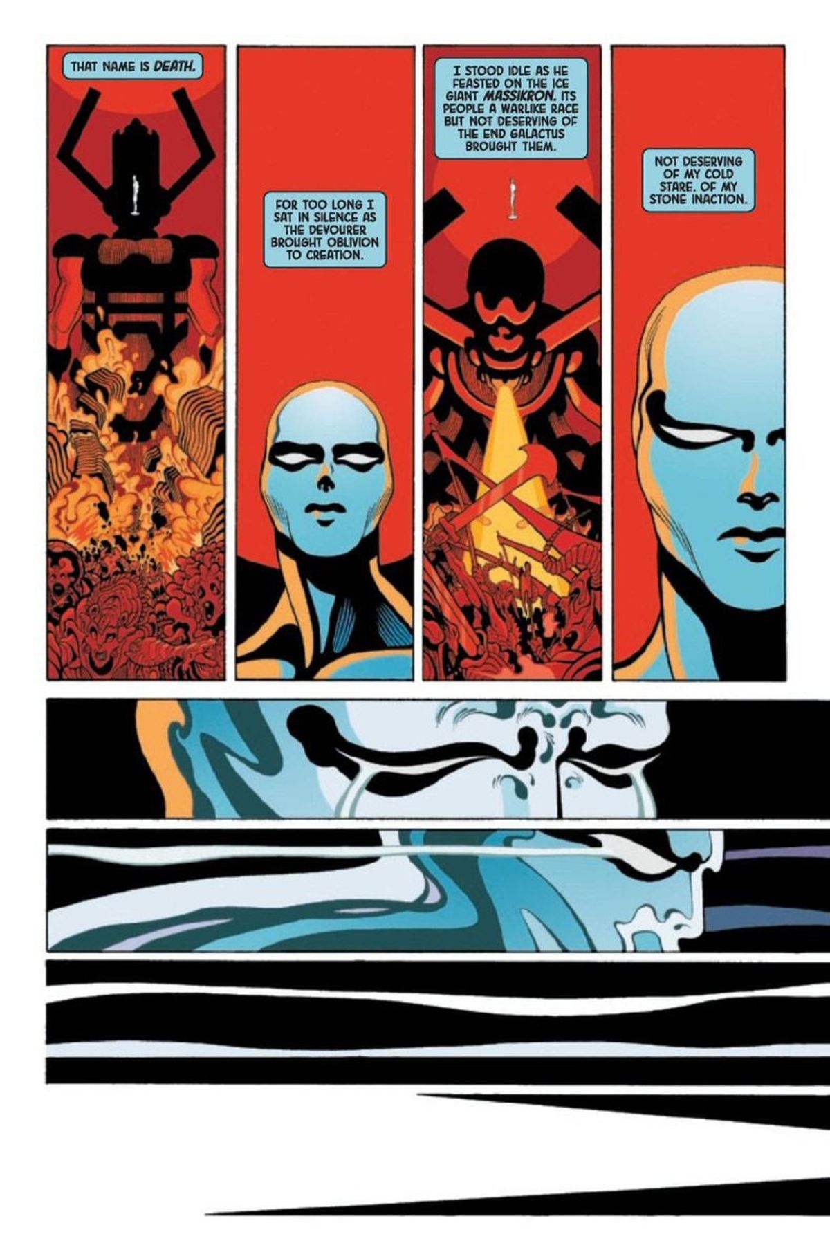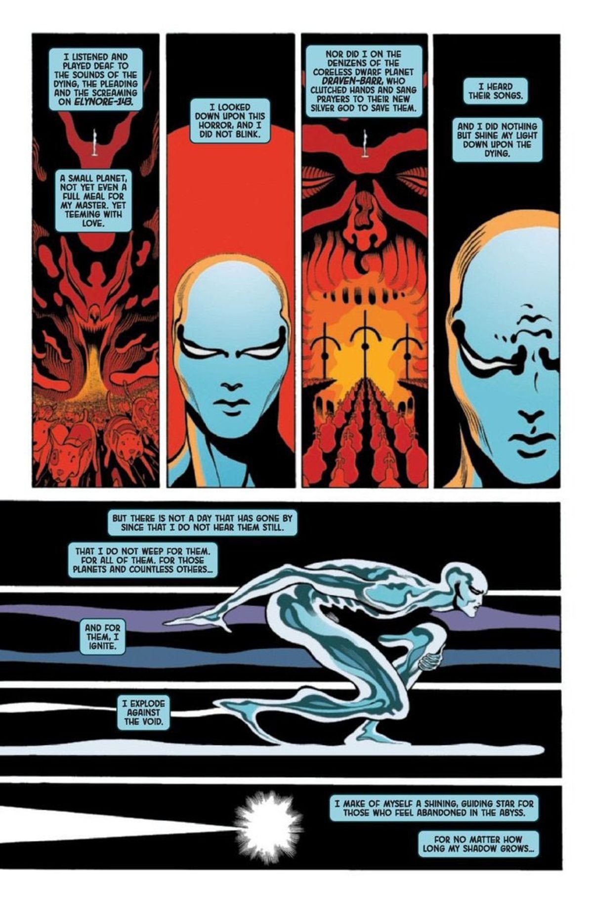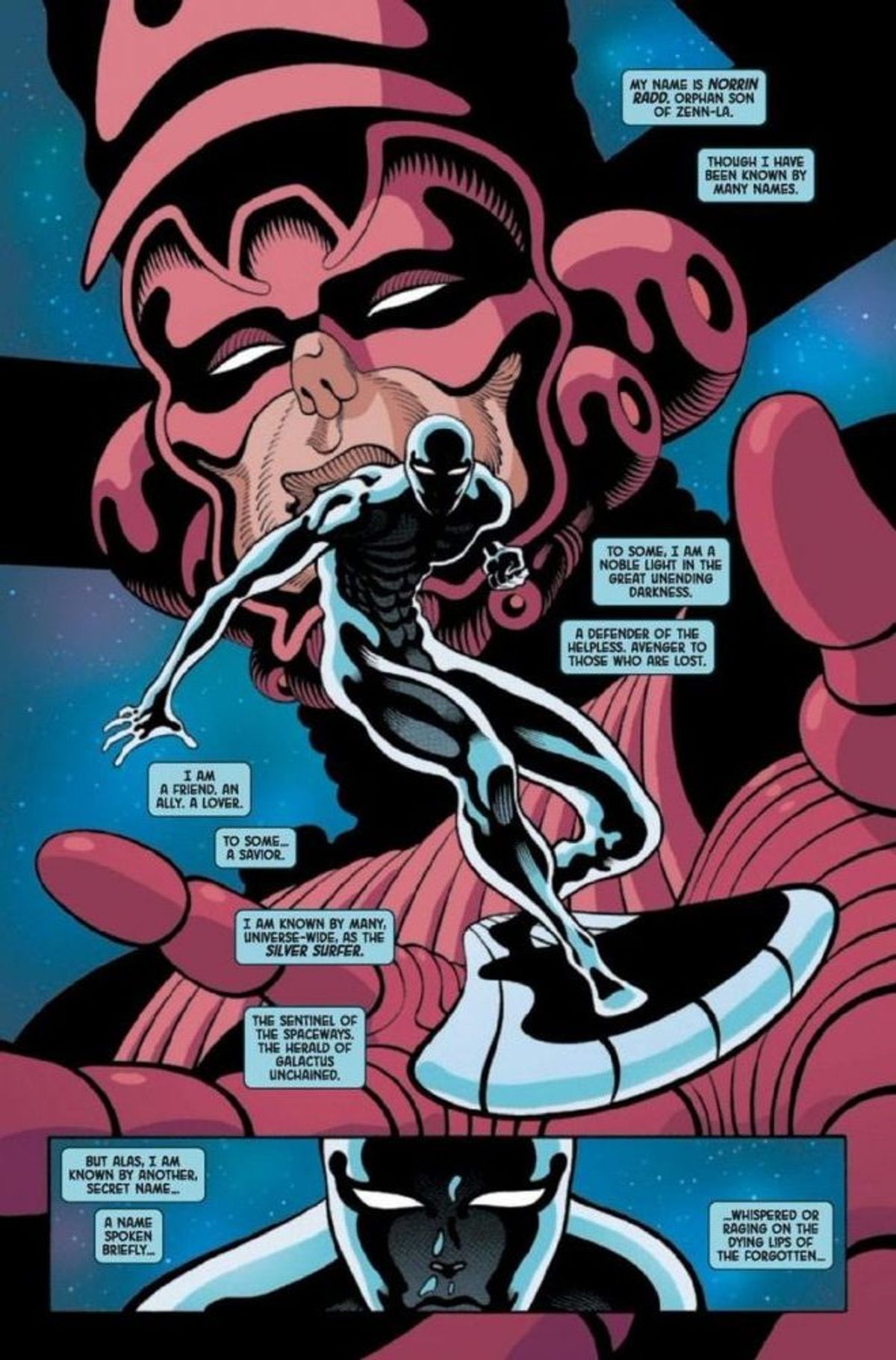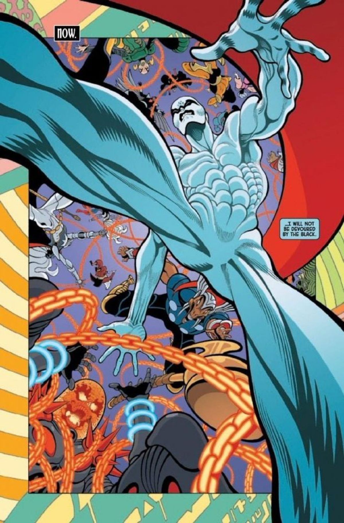 Nel finale di Silver Surfer: Black #1, infatti, il protagonista sembra abbandonarsi a un abisso oscuro ai limiti della psichedelia e incontra qualcuno... o qualcosa. A giudicare dalla tipologia di balloon con cui viene presentata la voce dell'entità, dovrebbe trattarsi del dio dei simbionti Knull!In chiusura, vi presentiamo la sinossi del numero #1, seguita dalle tavole diffuse dalla Casa delle Idee e quelle che ritraggono il sopracitato incontro.