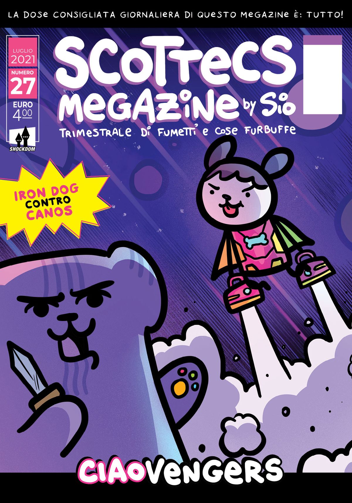 Tocca un'immagine per scorrere la galleriaShockdom porta mensilmente Simone Albrigi in edicola, con tre diverse riviste trimestrali che si alternano: oltre a Scottecs Megazine vengono pubblicati l'antologico Shonen Ciao (con Chiara Zuliani, Dado, Eleonora Bruni, The Sparker, Ilaria Catalani e Daw) e la rivista Evviva! (con Daw e Dottor Pira). Si tratta dell'unico caso di un autore italiano che arriva sugli scaffali con questa periodicità, un dato straordinario soprattutto considerando la graduale scomparsa delle edicole nel nostro Paese.