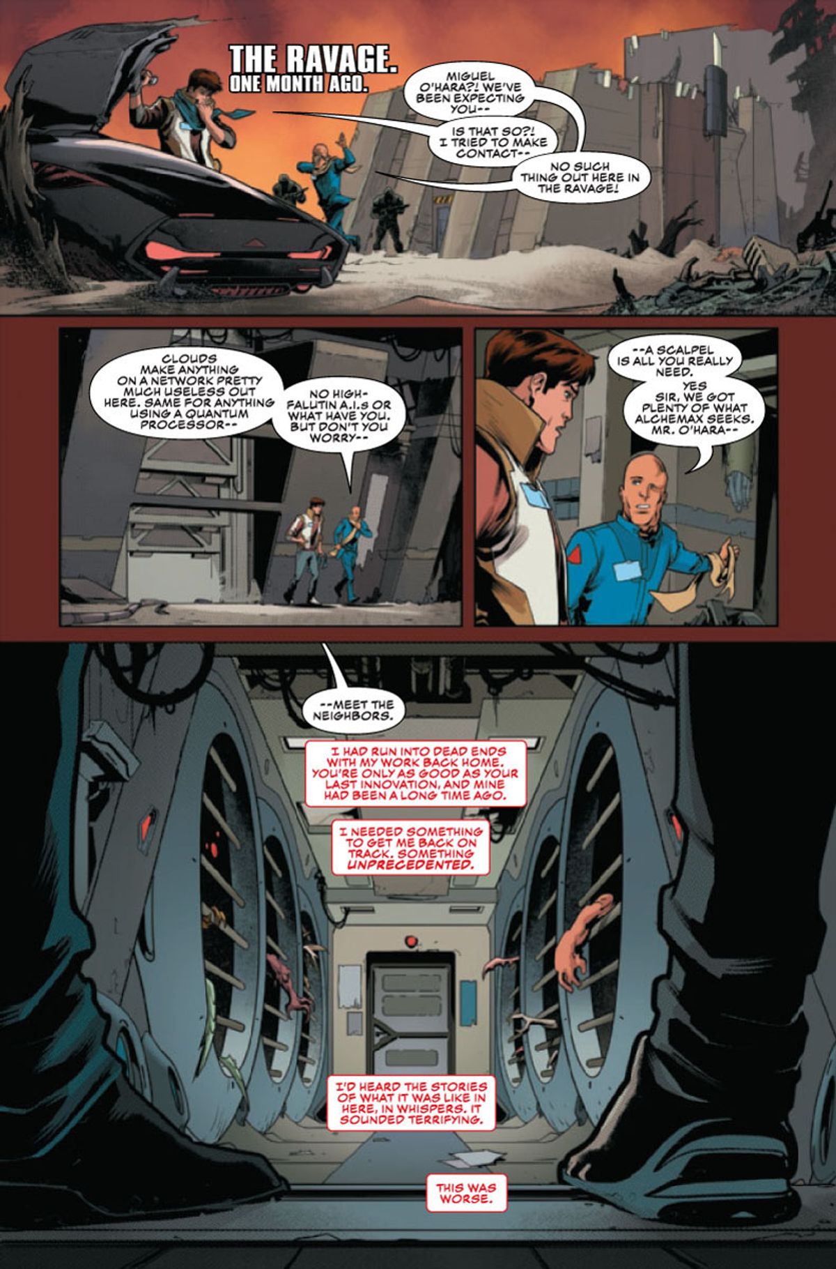 Come si evince dalle prime tavole diffuse dalla Marvel e raccolte nella gallery sottostante, l’Arrampicamuri si reca presso il Ravage, un centro di ricerca che studia le mutazioni genetiche; diverse sono le mostruosità in cui si imbatte, in particolare un’agghiacciante creatura ragnesca. Che lingua parla? E qual è il suo ruolo nella vita di O'Hara?Prima di lasciarvi alle prime tavole dell’albo e alle variant cover firmate da Ron Lim e Travel Foreman, vi ricordiamo che Marvel 2099 ha avuto inizio lo scorso novembre sulle pagine di 2099 Alpha #1, è proseguito su Amazing Spider-Man #34, Amazing Spider-Man #35, Fantastic Four 2099 #1, Punisher 2099 #1, Conan 2099 #1 e continuerà su Ghost Rider 2099 #1, Doom 2099 #1, Venom 2099 #1 e 2099 Omega #1.
