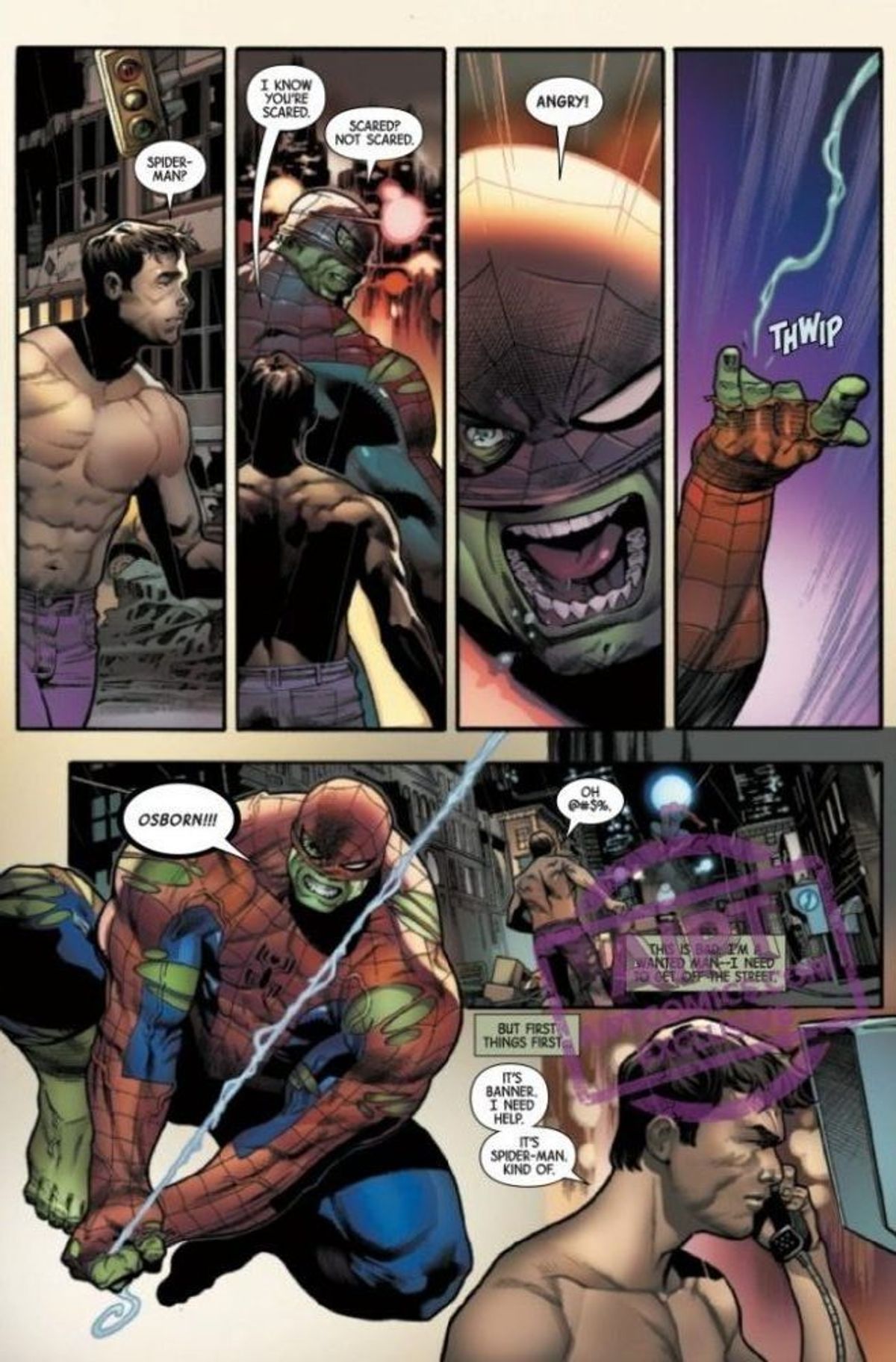 Quando Bruce Banner si sveglia nel cuore della notte senza avvertire la presenza di Hulk, è convinto di essere finalmente libero. Ma Hulk è immortale e la notte è giovane. Se eravate convinti che fosse pericoloso nel corpo del mite Bruce Banner, aspettate di vederlo ora. Peter Parker è un uomo dalla forza e l’agilità proporzionali a quelle di un ragno, in grado di sollevare treni, alla peggio… E sta per entrare in possesso di un grosso e verde potenziamento, con un certo temperamento.