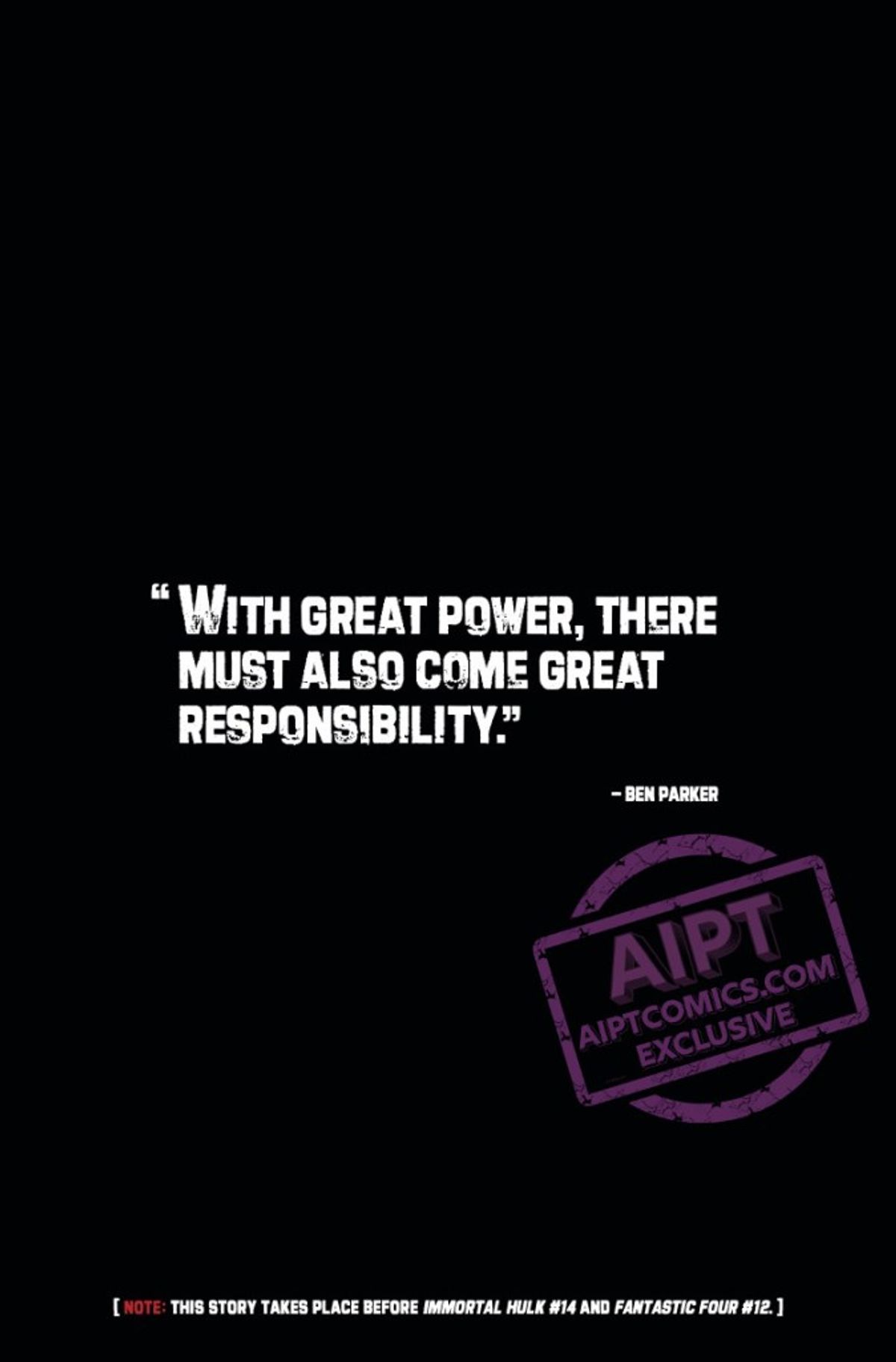 In questa prima parte del 2020 saranno diverse le iniziative che coinvolgeranno il Gigante di Giada: mercoledì 5 febbraio, ad esempio, uscirà nelle fumetterie americane Immortal Hulk: Great Power, one-shot scritto da Tom Taylor (X-Men: Red) per i disegni di Jorge Molina (X-Men: Blue).Come si evince dalla sinossi e dalle prime tavole dello speciale – che trovate in coda all'articolo – tutt'a un tratto, Bruce Banner non avverte più la presenza di Hulk. Qualcosa di stupefacente sta per avvenire: l’amichevole Spider-Man di quartiere appare poco dopo posseduto dal Golia Verde, deciso a regolare i conti con una sua vecchia nemesi!