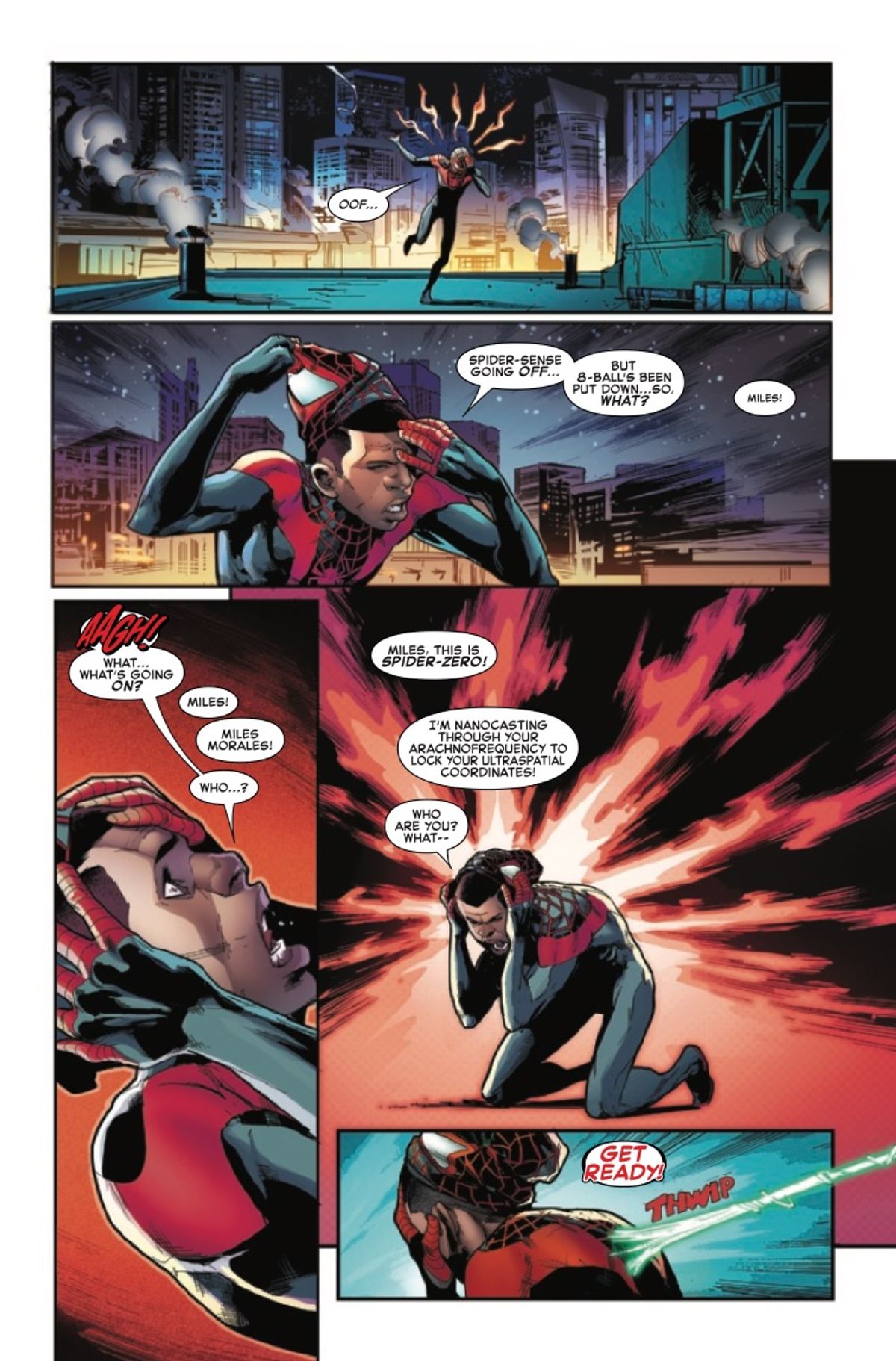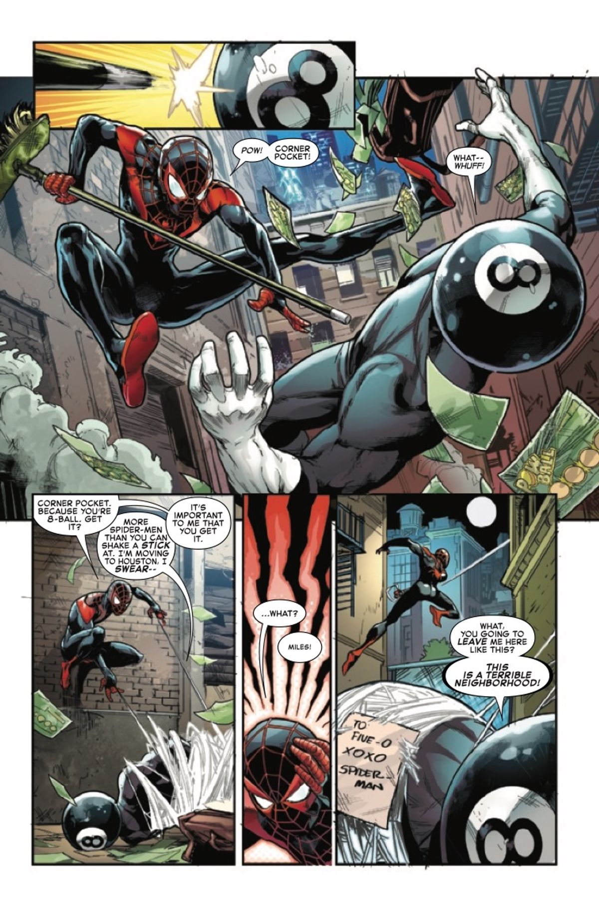 La Marvel ha da poco diffuso le prime tavole di Spider-Verse #1, nelle quali vediamo il giovane Arrampicamuri alle prese con il super criminale 8-Ball. Una volta sistemata la pratica, una voce attira l’attenzione di Miles, il quale viene catturato da una misteriosa ragnatela di color verde. A quale individuo ragnesco apparterrà? E di quale universo?