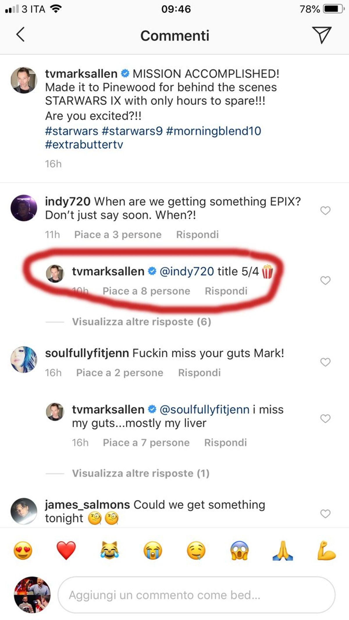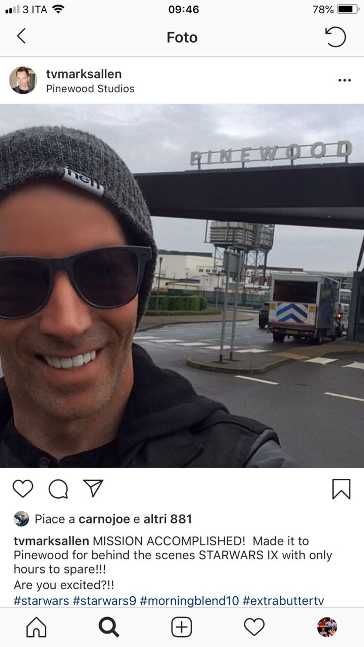 Nelle ore scorse però, un presentatore della ABC, Mark Allen di Morning Blend, programma della ABC 10 di Sacramento, ha rivelato di aver visitato i Pinewood Studios per realizzare un video dal backstage della pellicola.Nel momento in cui un follower gli domanda "Quando vedremo qualcosa dell'Episodio 9? Non rispondere solo presto", l'anchor ha risposto che il titolo verrà svelato il 5/4. Il May The Fourth, la giornata in cui, in tutto il mondo, si festeggia Guerre Stellari.
